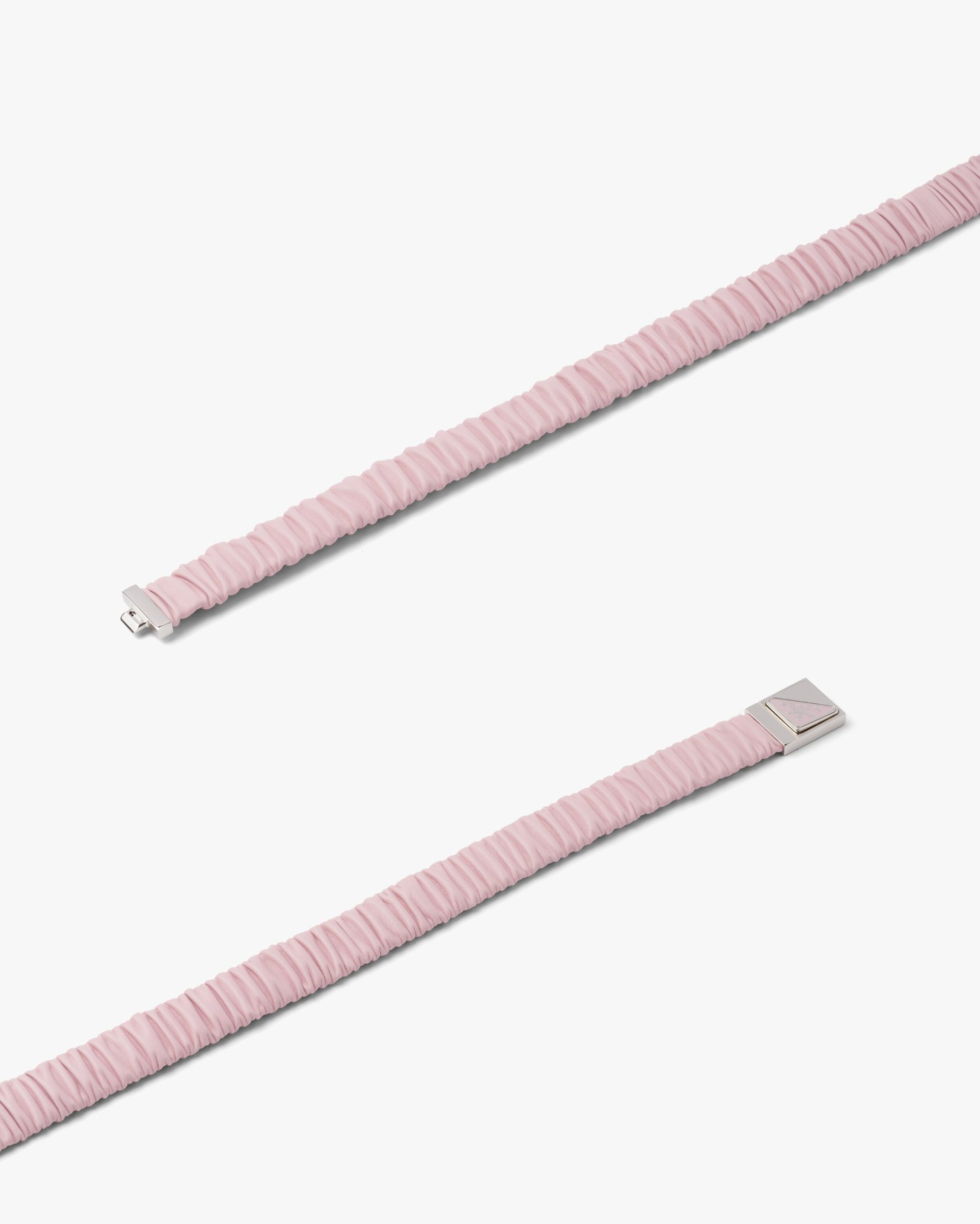Introduced for the first time on trunks designed by Mario Prada in 1913, the historic enameled triangle logo embellishes the metal buckle of this narrow elasticized belt made of soft nappa leather.