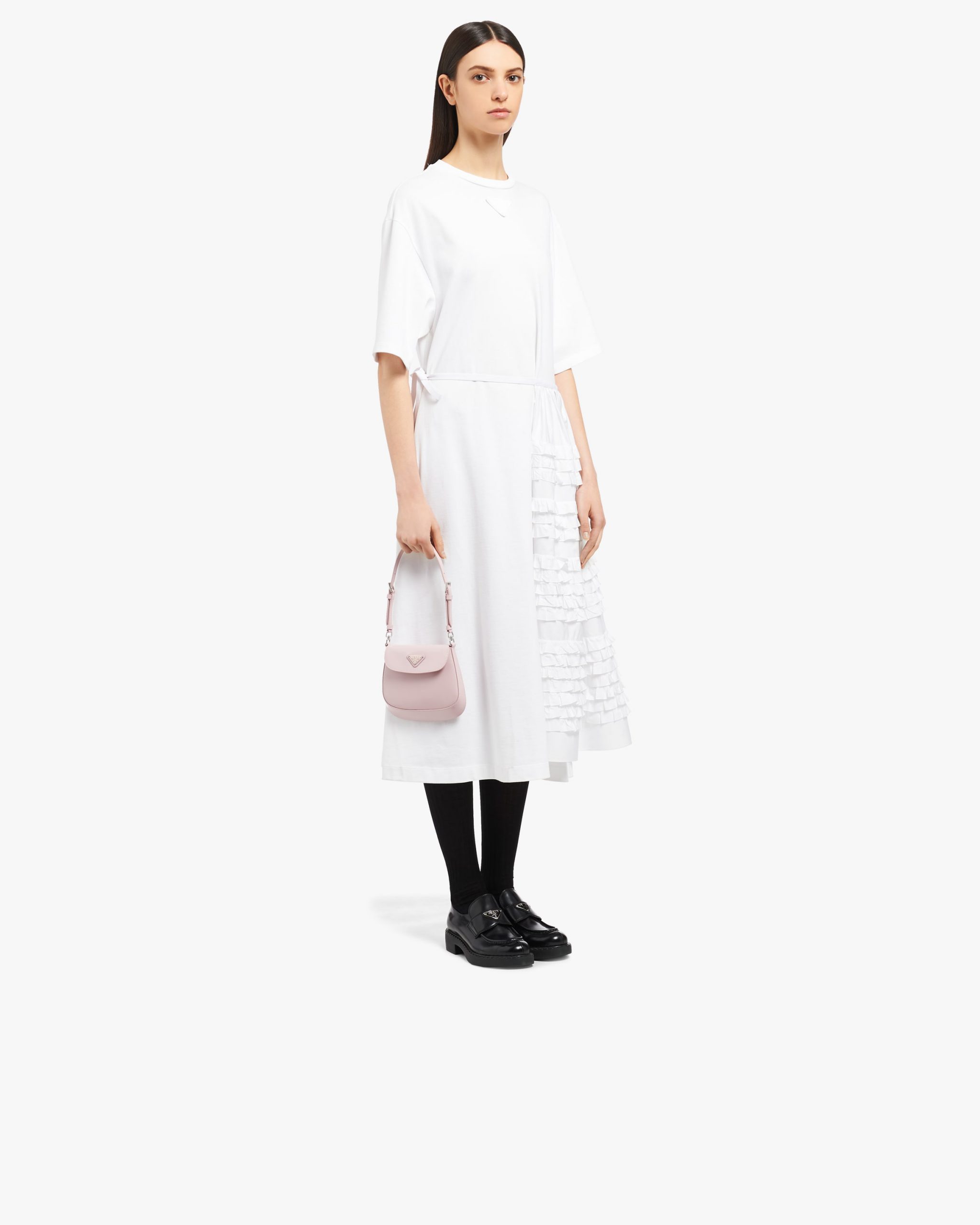 A perfect synthesis of classicism and futurism, the Prada Cleo bag reinterprets an iconic design from the brand’s archives. Sleek, curved lines emphasized by the particular sloping construction on the bottom and sides give this flap bag sophisticated allure, while the handle with extension makes the accessory functional and allows it to be worn as a shoulder bag or handbag. Brushed leather, a distinctive material of Prada collectsions, is a modern, chameleonic material that is perfect for always new combinations and contrasts. The enameled triangle logo completes the silhouette.