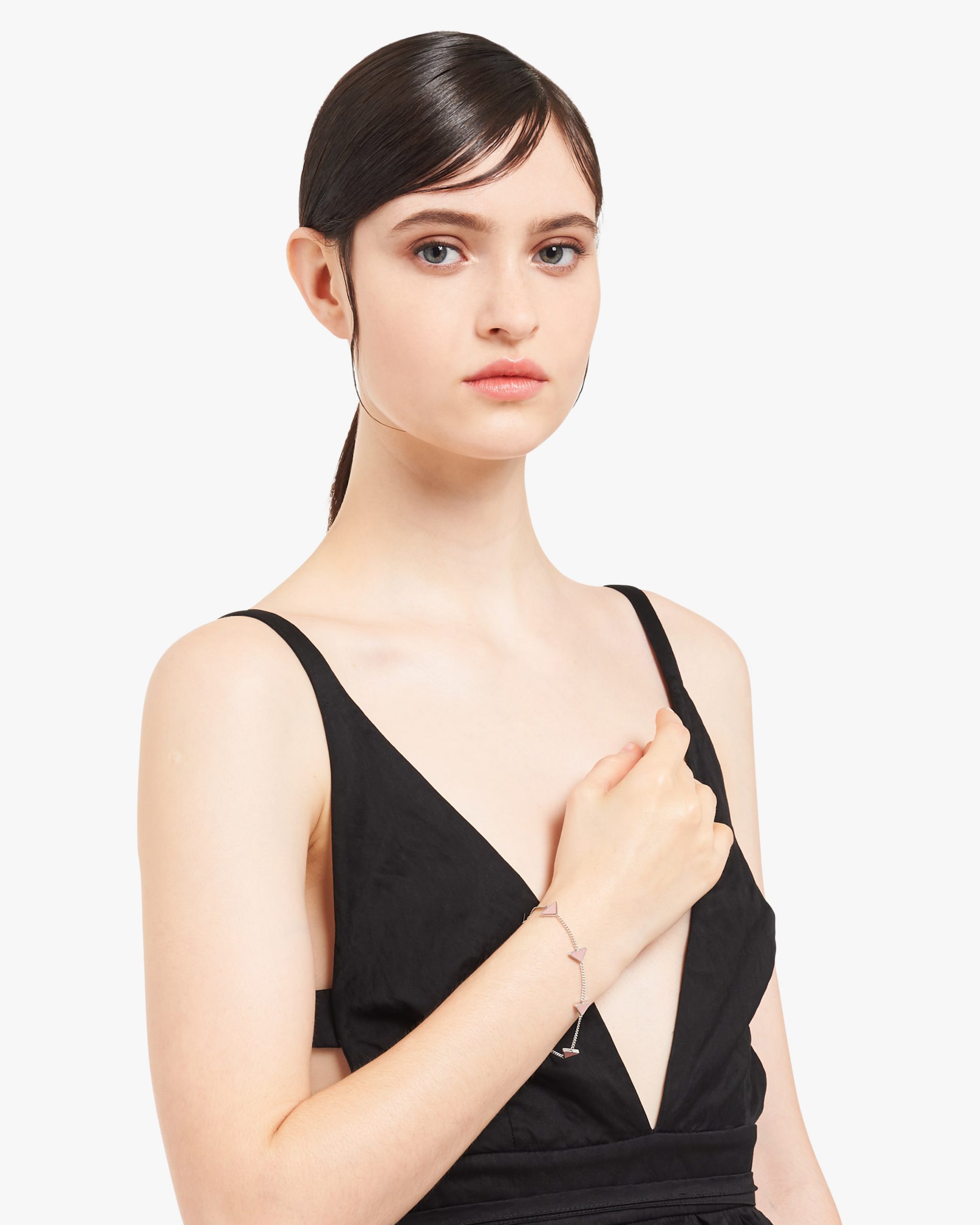 The Prada enameled triangle returns as a charm to decorate this bracelet with a palladium finish. Iconic and sleek, the triangle logo is the protagonist of a new line of jewelry made of 925 sterling silver that reinterprets punk influences in a modern way.