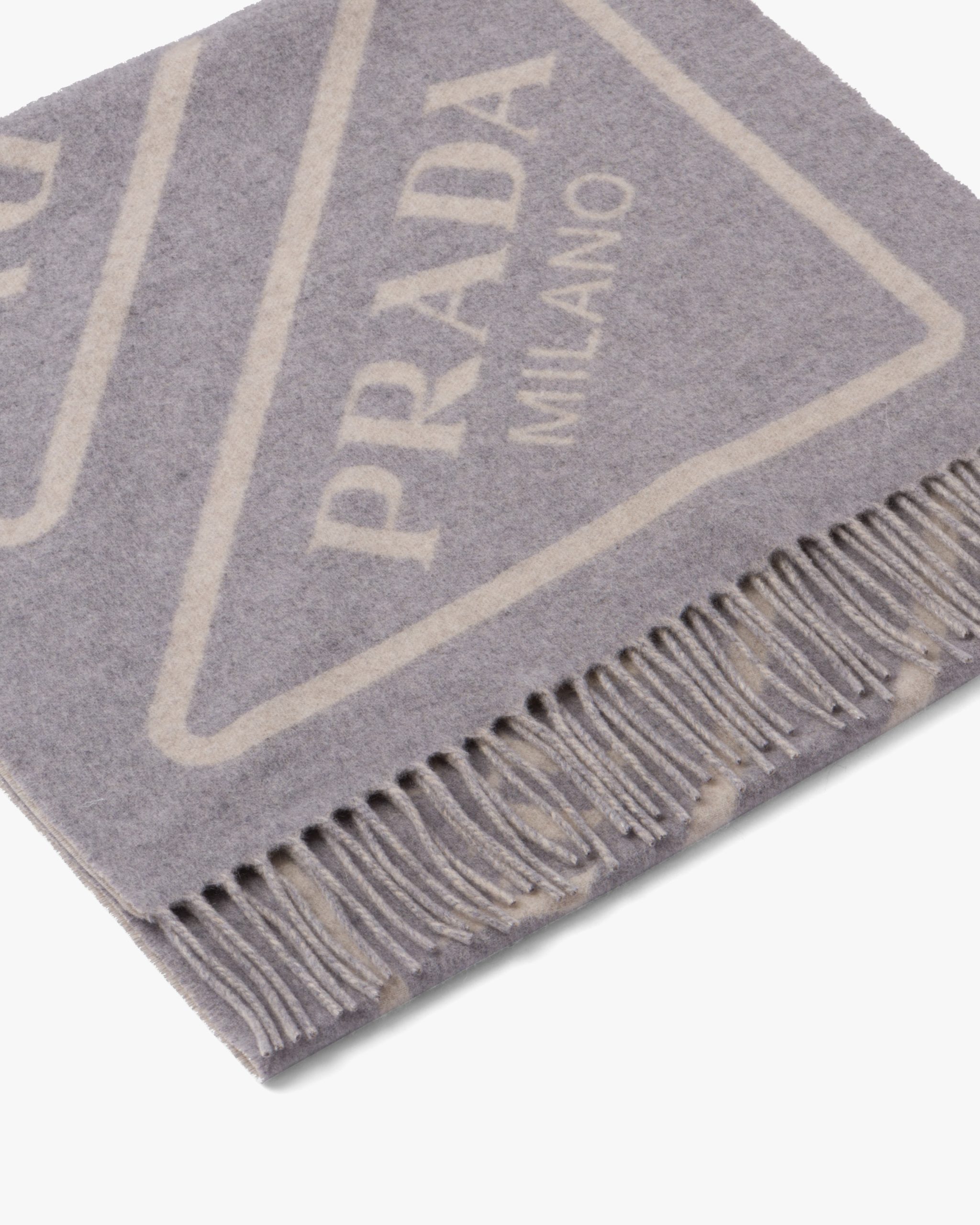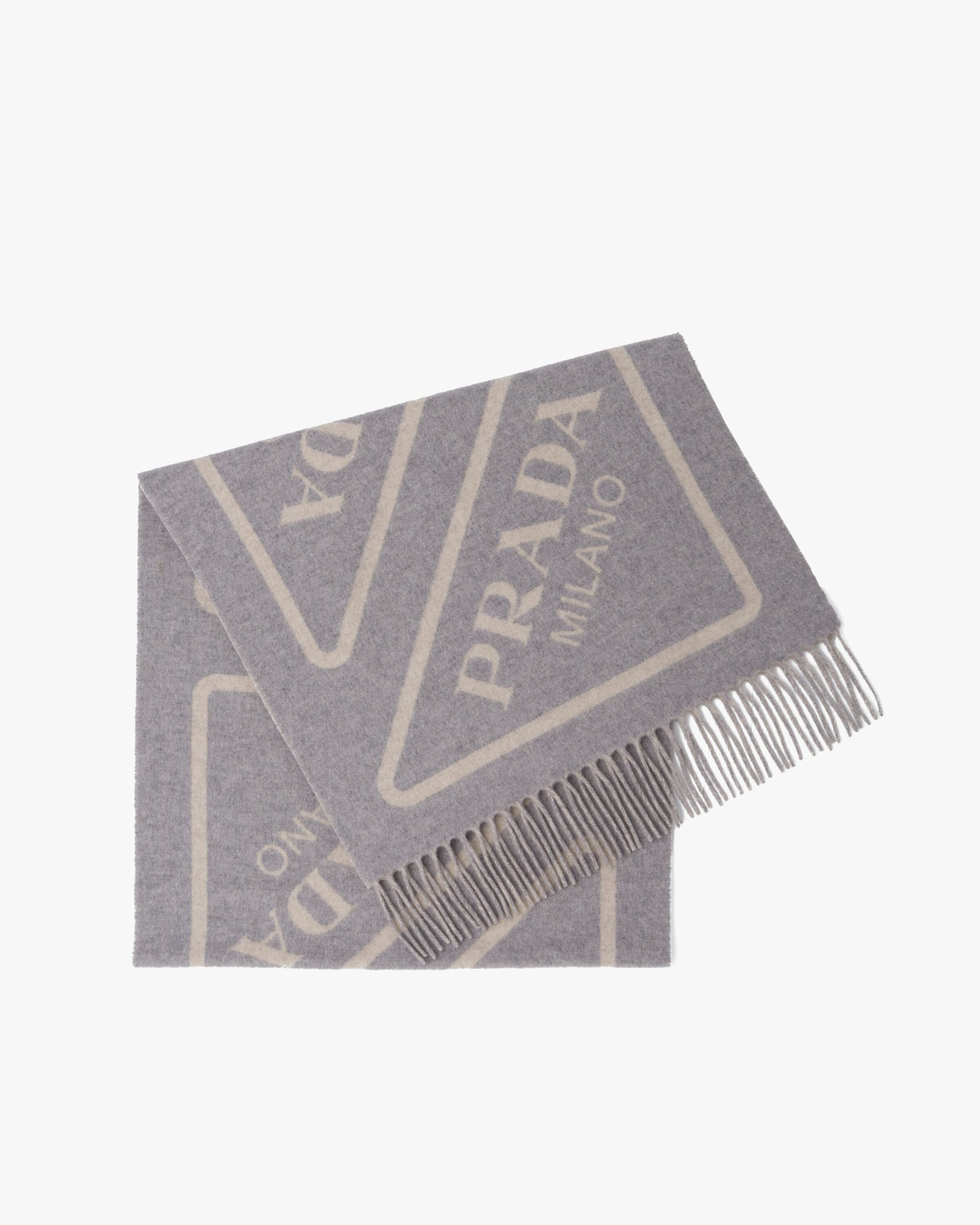 The triangle with lettering logo, an iconic symbol of the brand since 1913, is reinterpreted in a contemporary way and is repeated in the large jacquard motif decorating this soft double cashmere scarf. Fringe trim on the edge completes the accessory.
