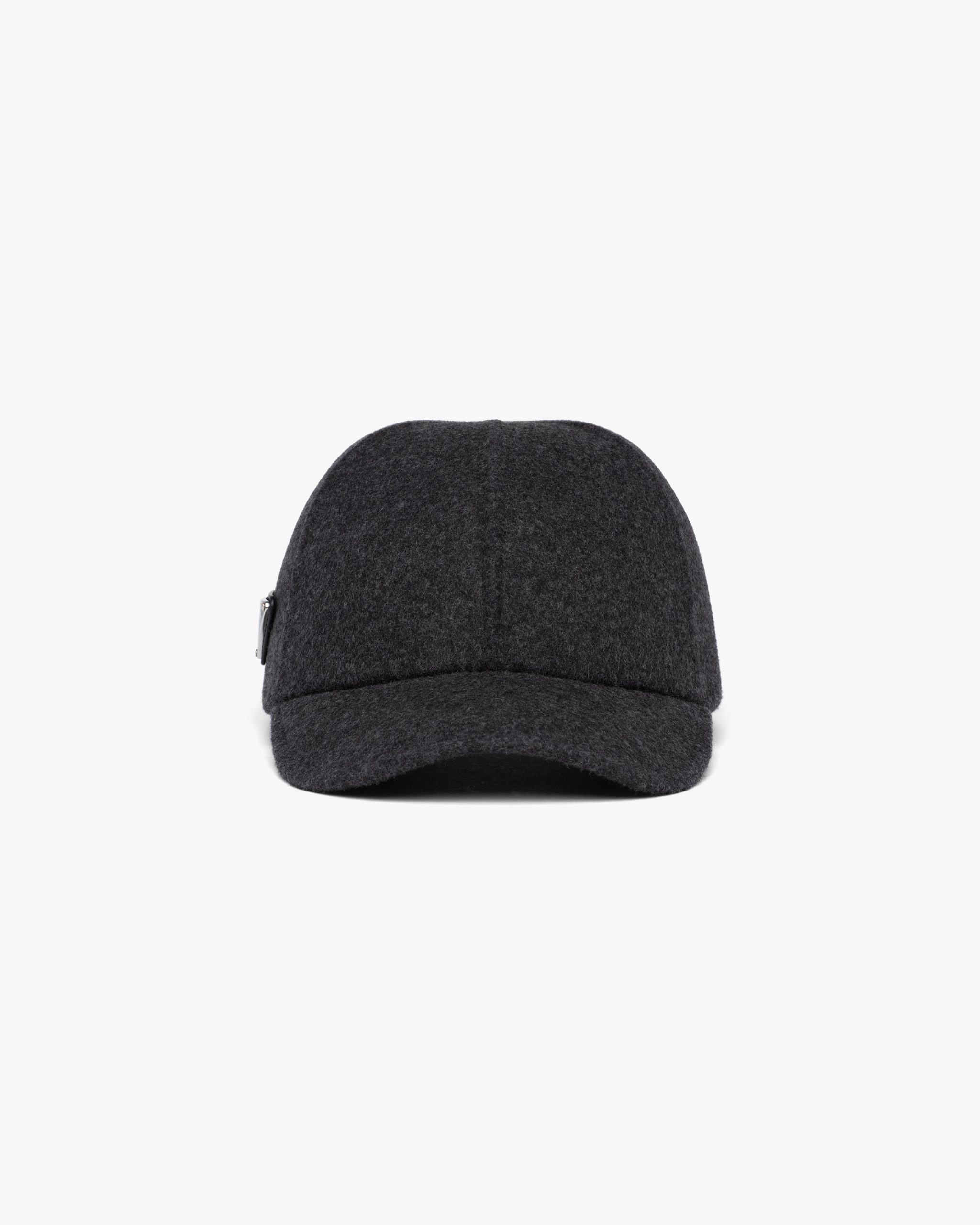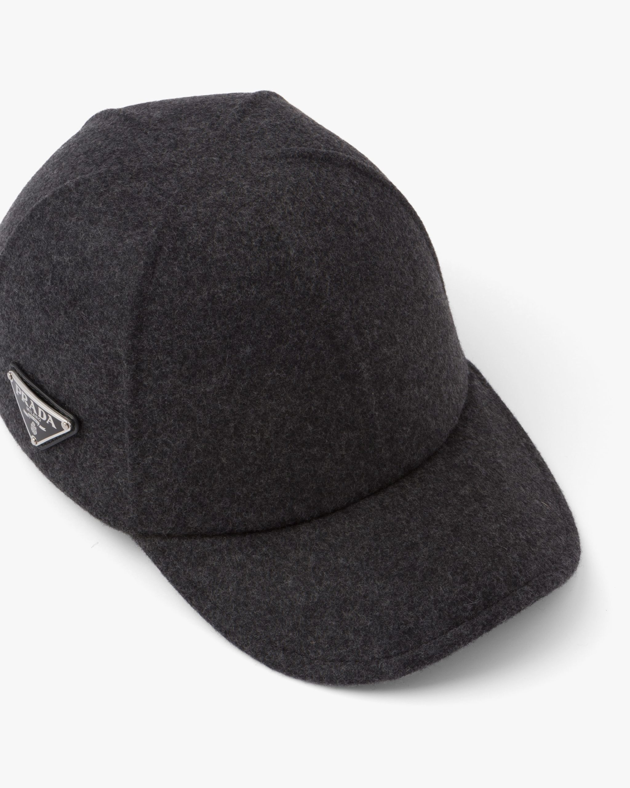 An historical element that first appeared on the trunks designed by Mario Prada, the enameled metal triangle logo is reinterpreted each season on contemporary designs like this felt baseball cap.