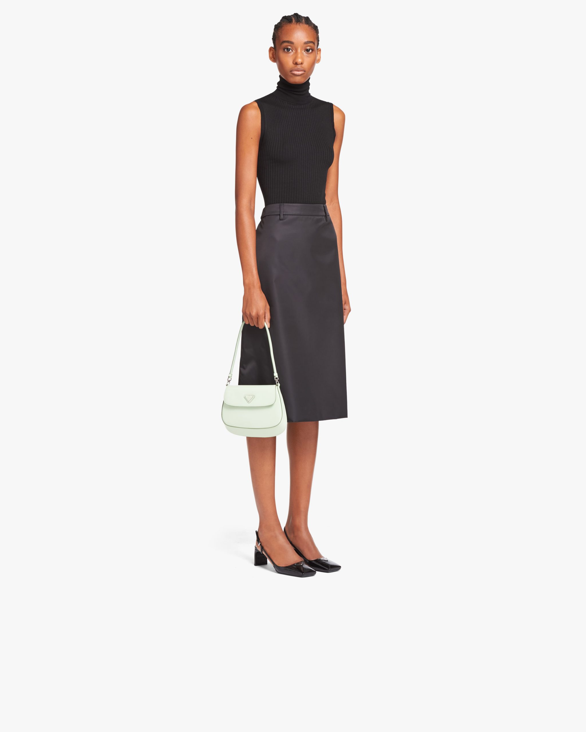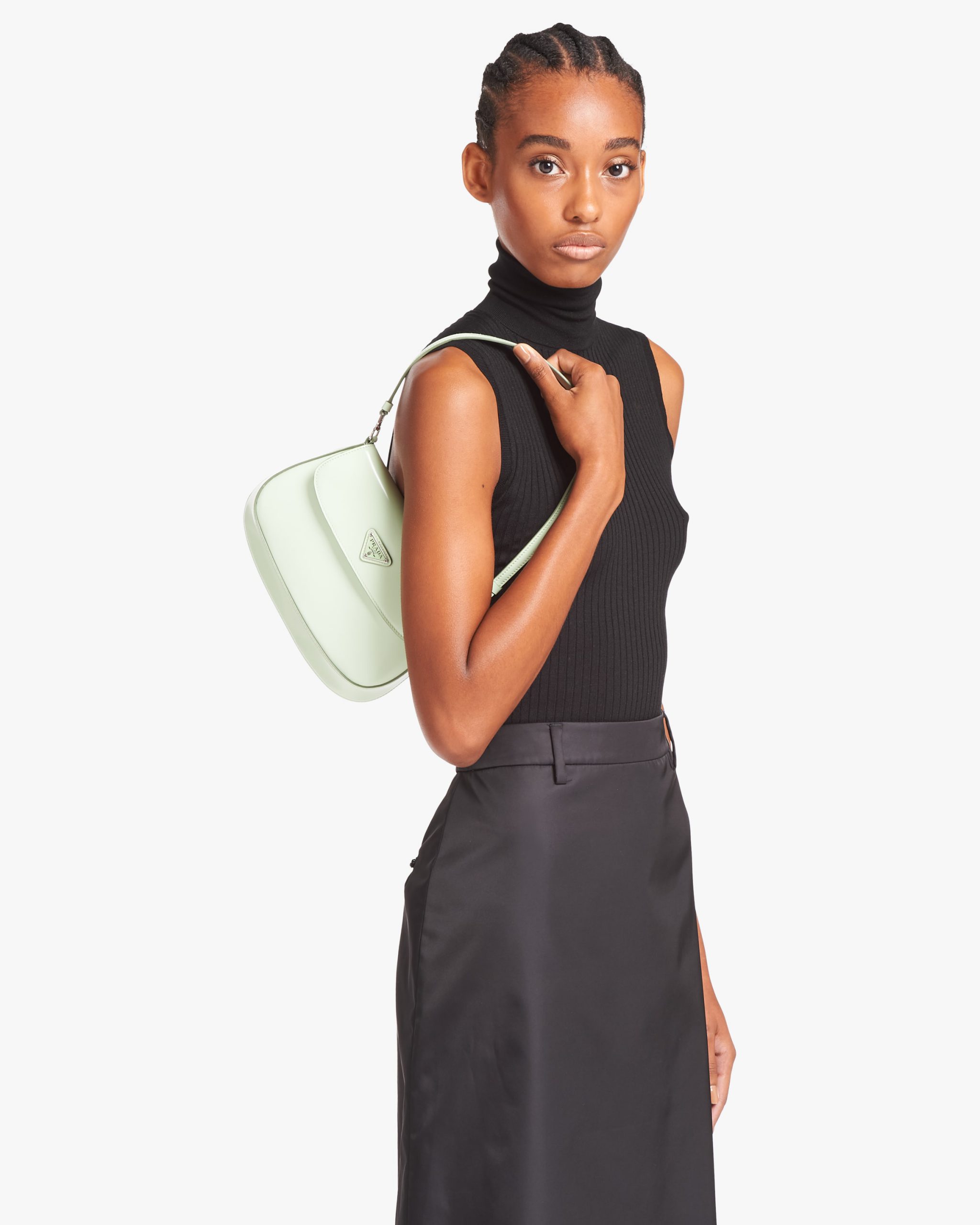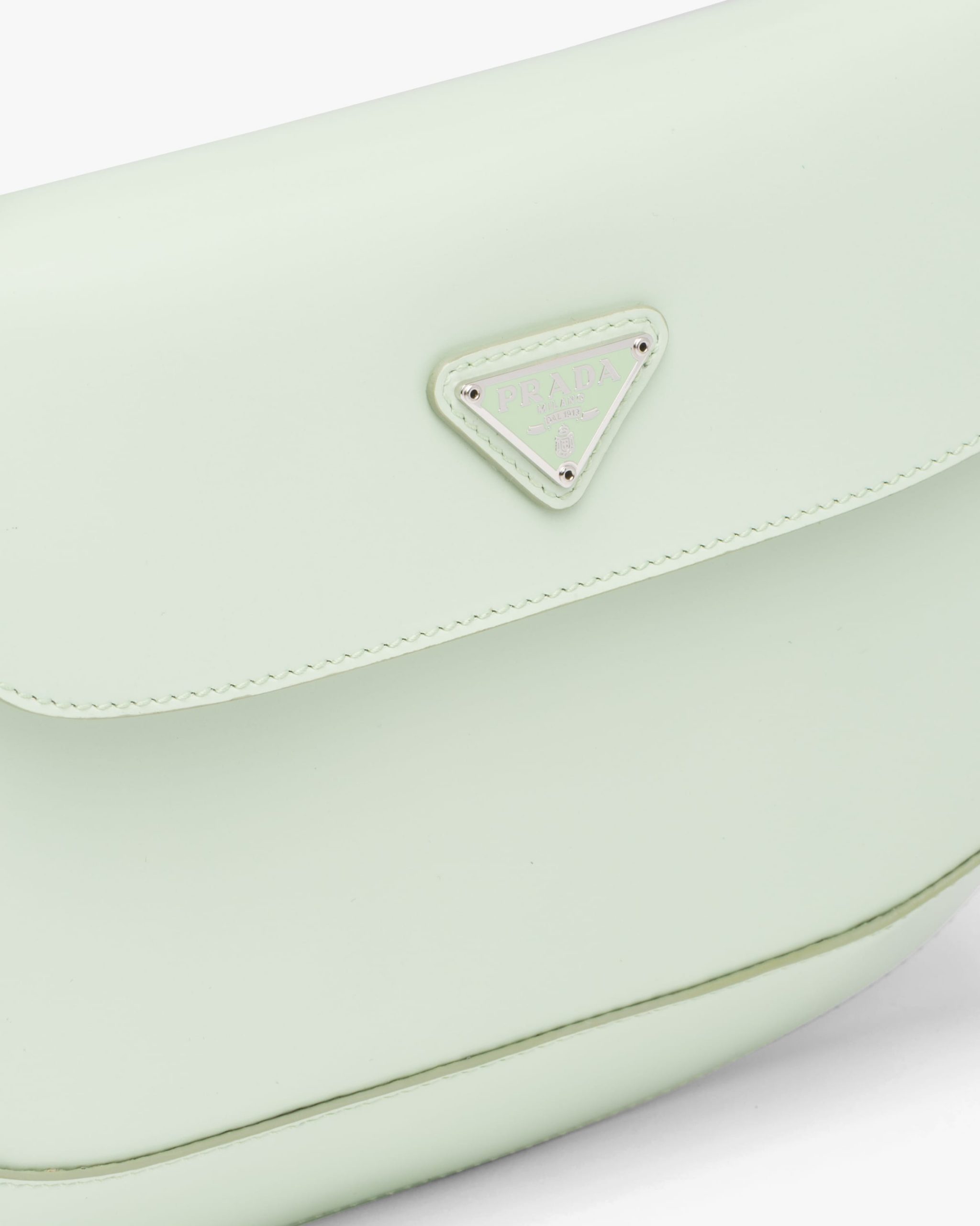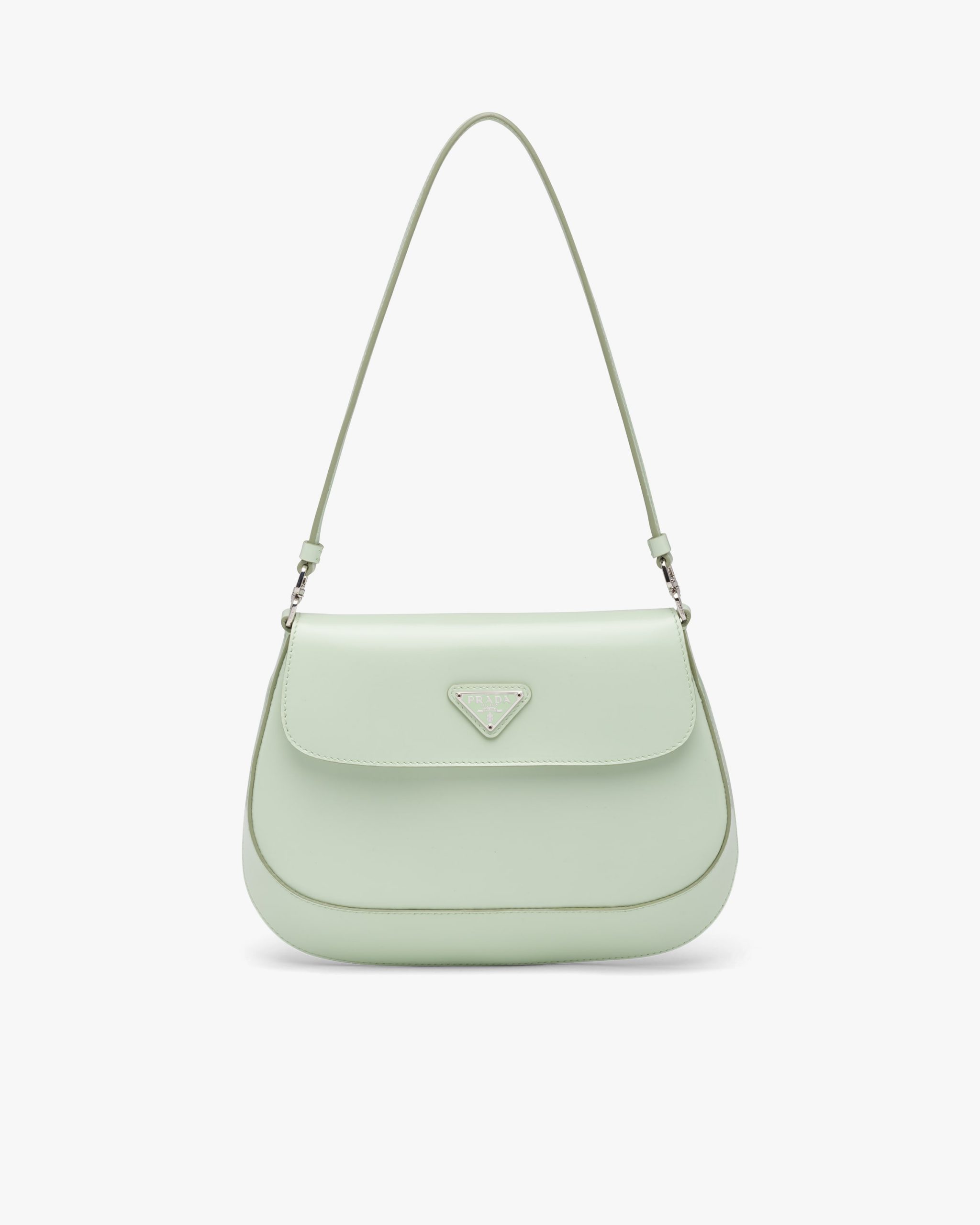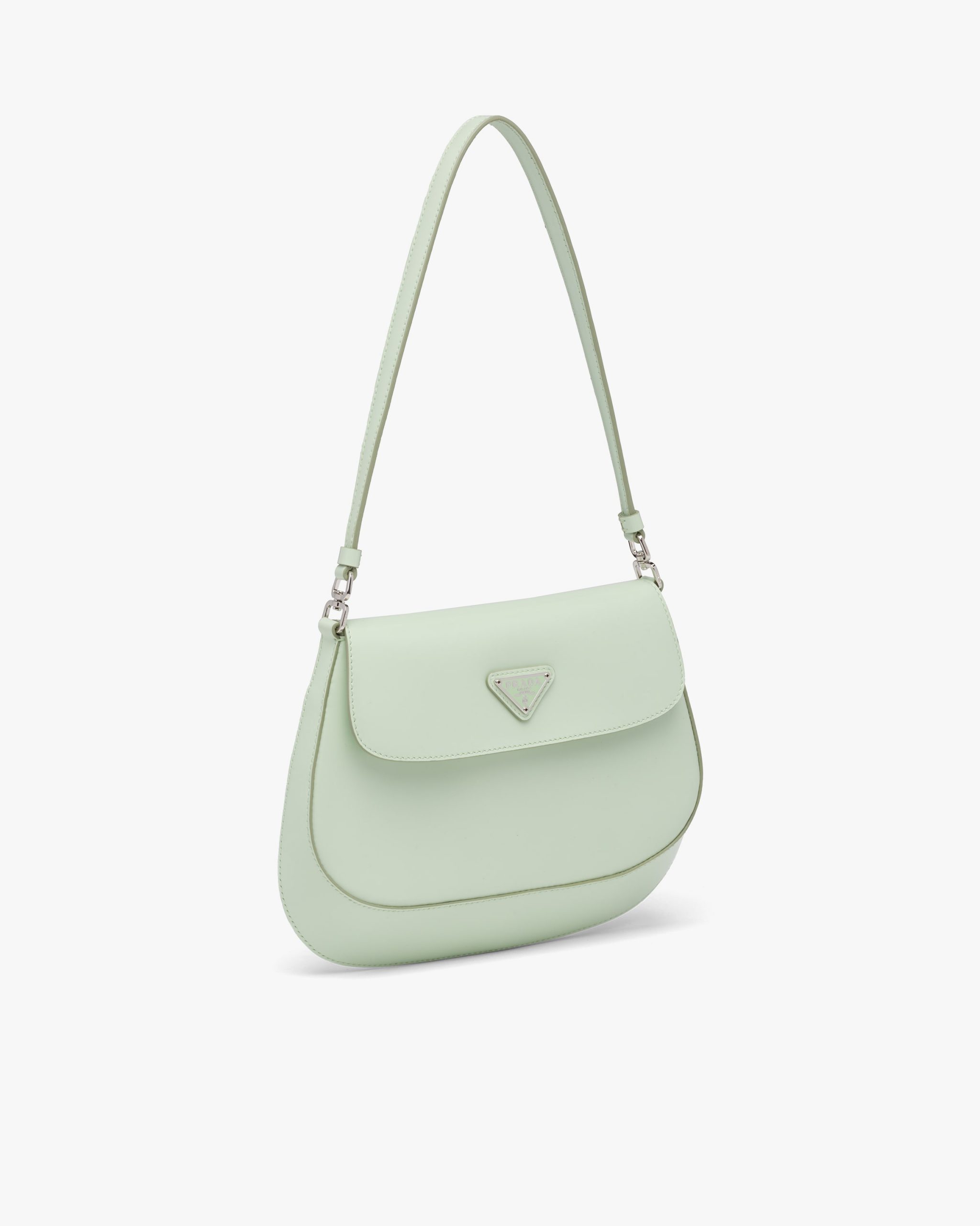 The Prada Cleo bag with sophisticated allure reinterprets an iconic design of the brand from the 1990’s. Sleek curved lines emphasized by the particular construction rounded on the bottom and sides give this flap bag a soft, light look. Brushed leather, a modern and versatile material that is distinctive in Prada collectsions, is ideal for creating always new combinations and contrasts. The enamel triangle logo decorates the silhouette.