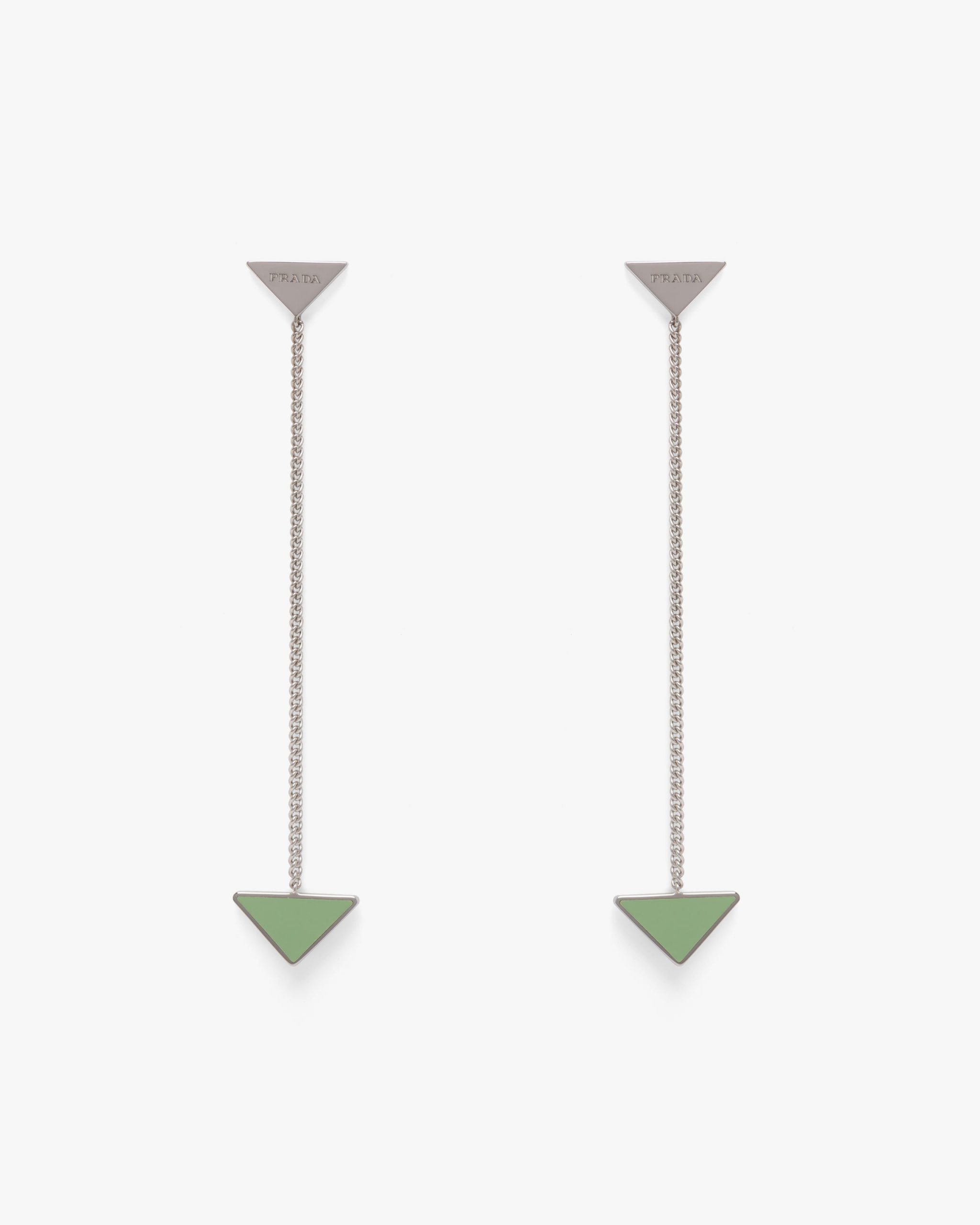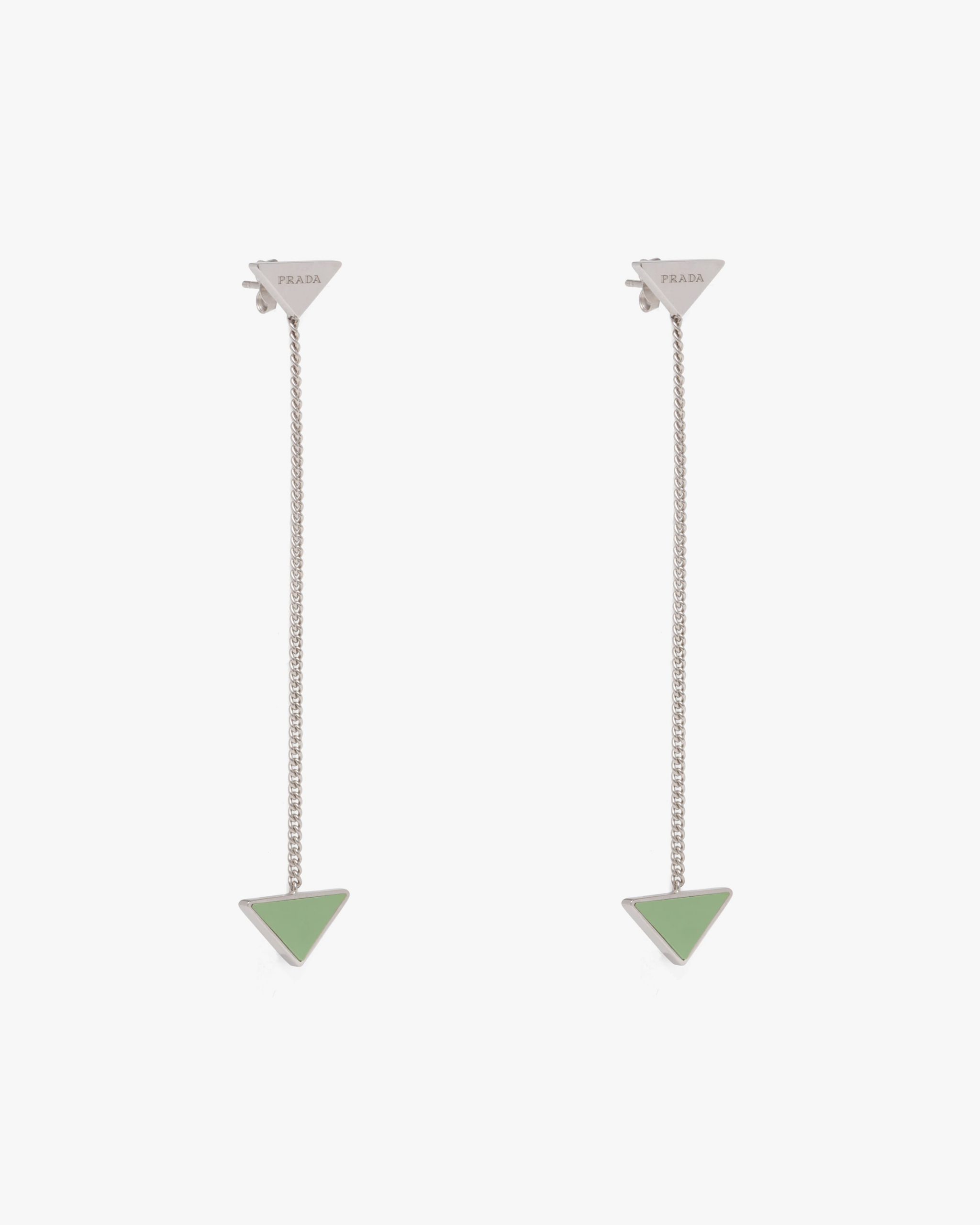 The Prada enameled triangle returns as a delicate detail in these drop earrings with a palladium finish. Iconic and sleek, the triangle logo is the protagonist of a new line of jewelry made of 925 sterling silver that reinterprets punk influences in a modern way.