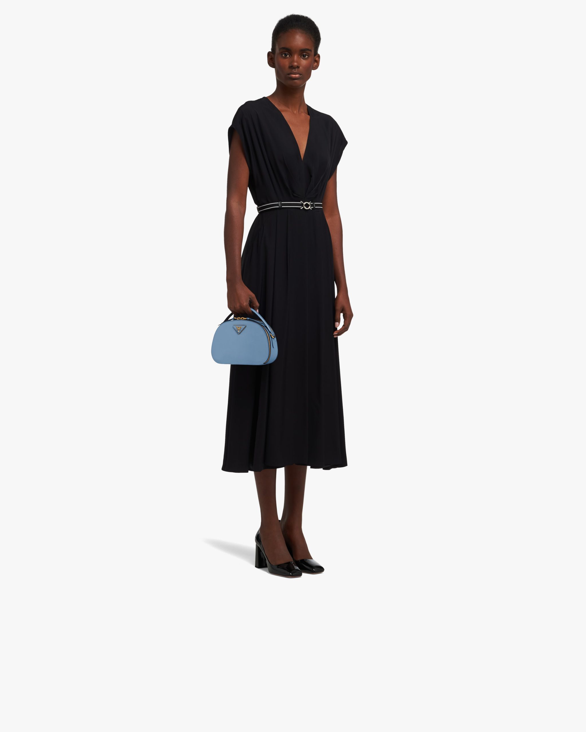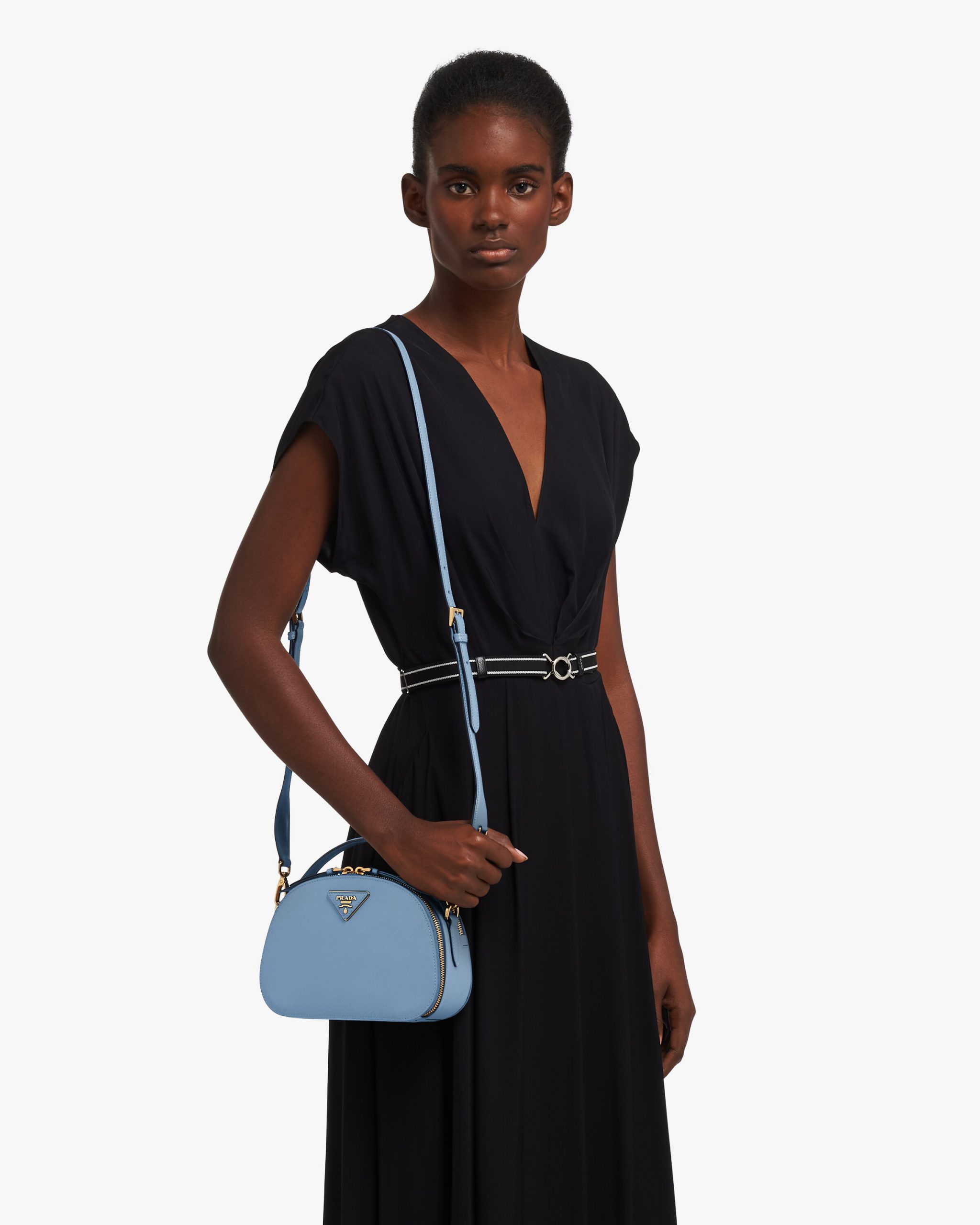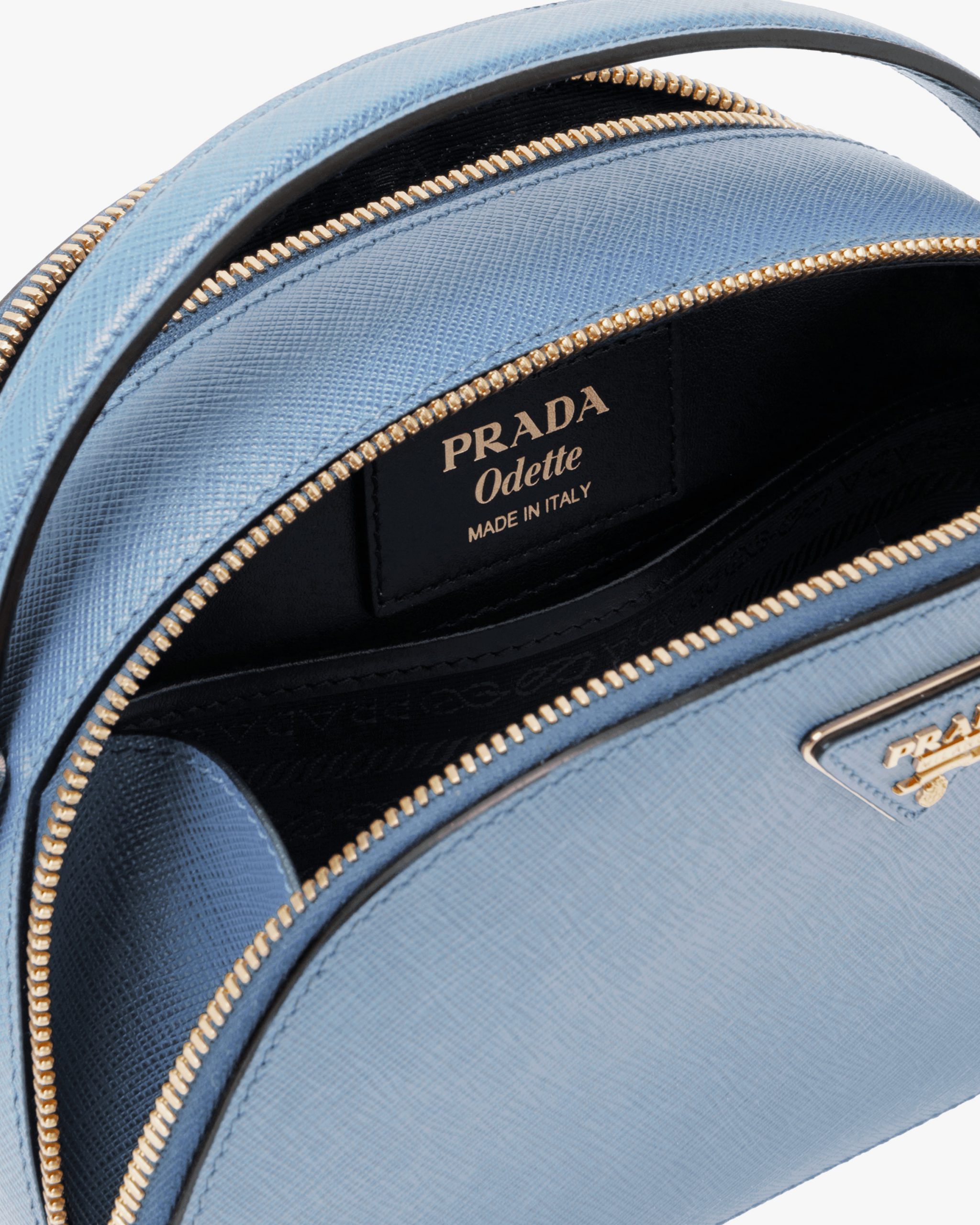 The rounded design of the Prada Odette bag is inspired by photographers’ camera cases. Made of fine Saffiano leather and decorated with the iconic triangle logo, the bag can be carried by hand or worn with a shoulder strap.