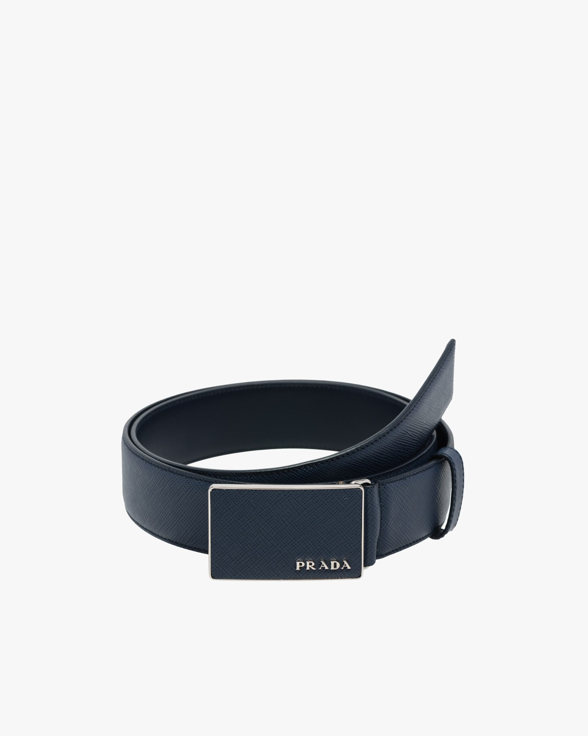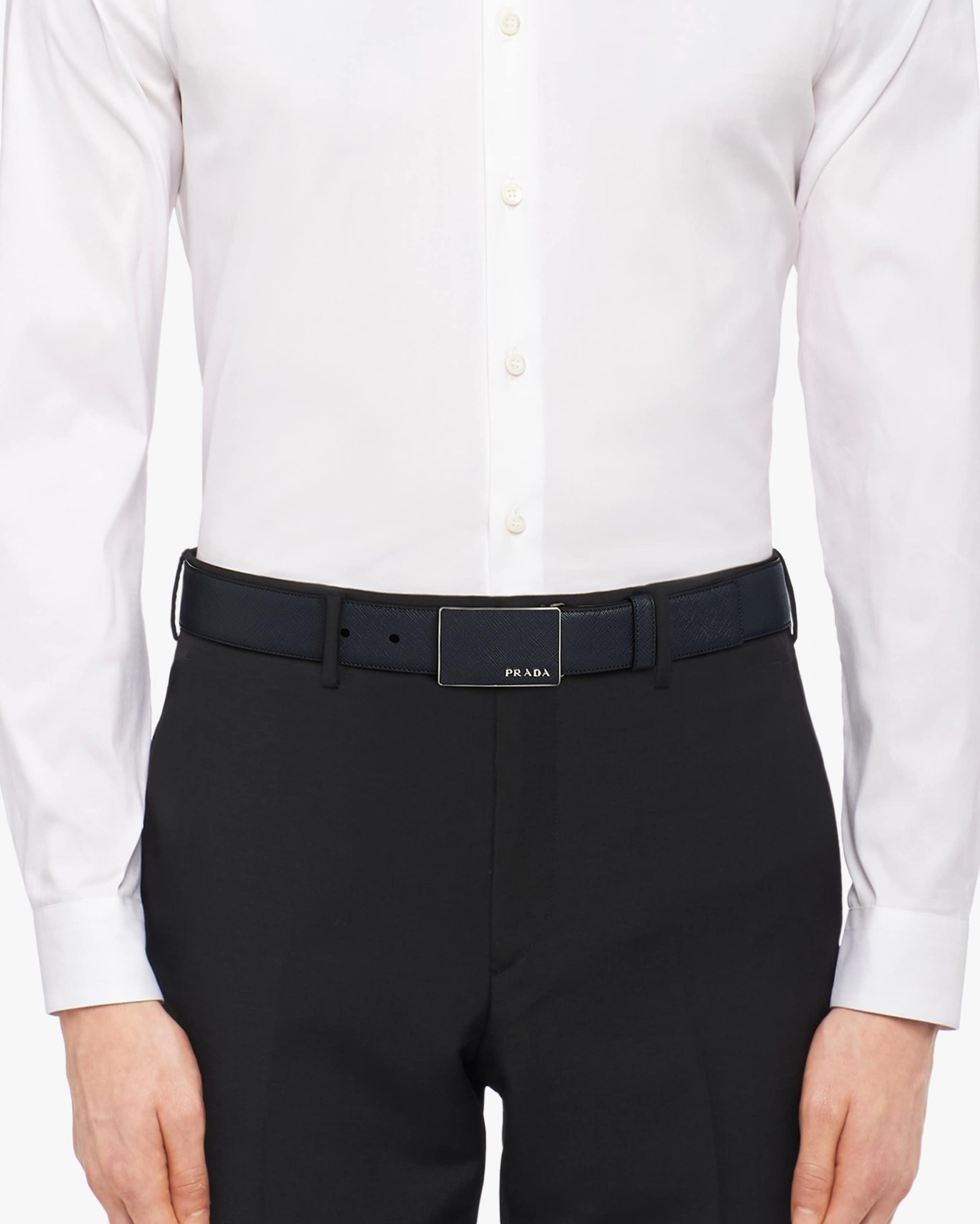 This belt features a pure and elegant design, with a Saffiano leather buckle and enriched by the metal lettering logo.