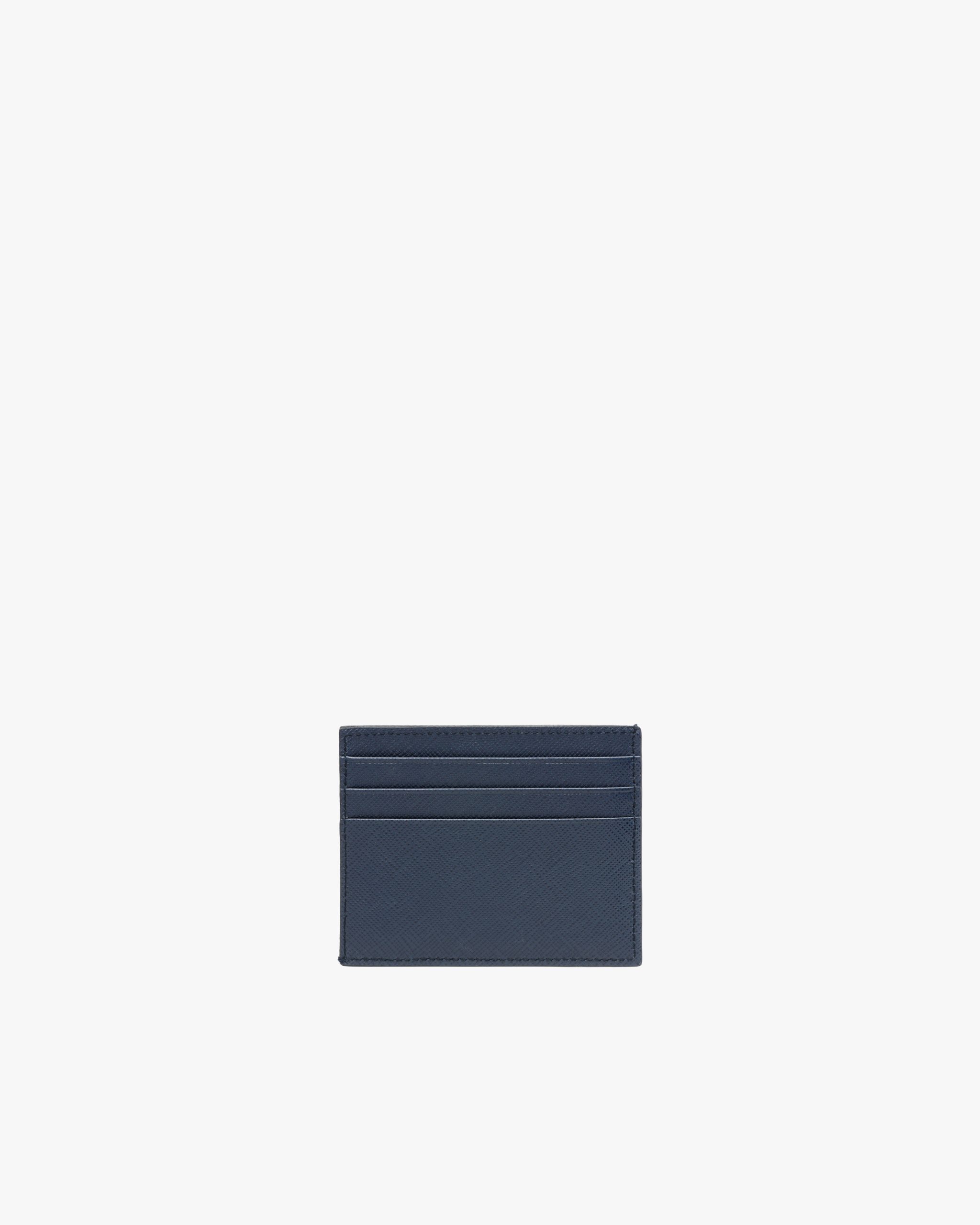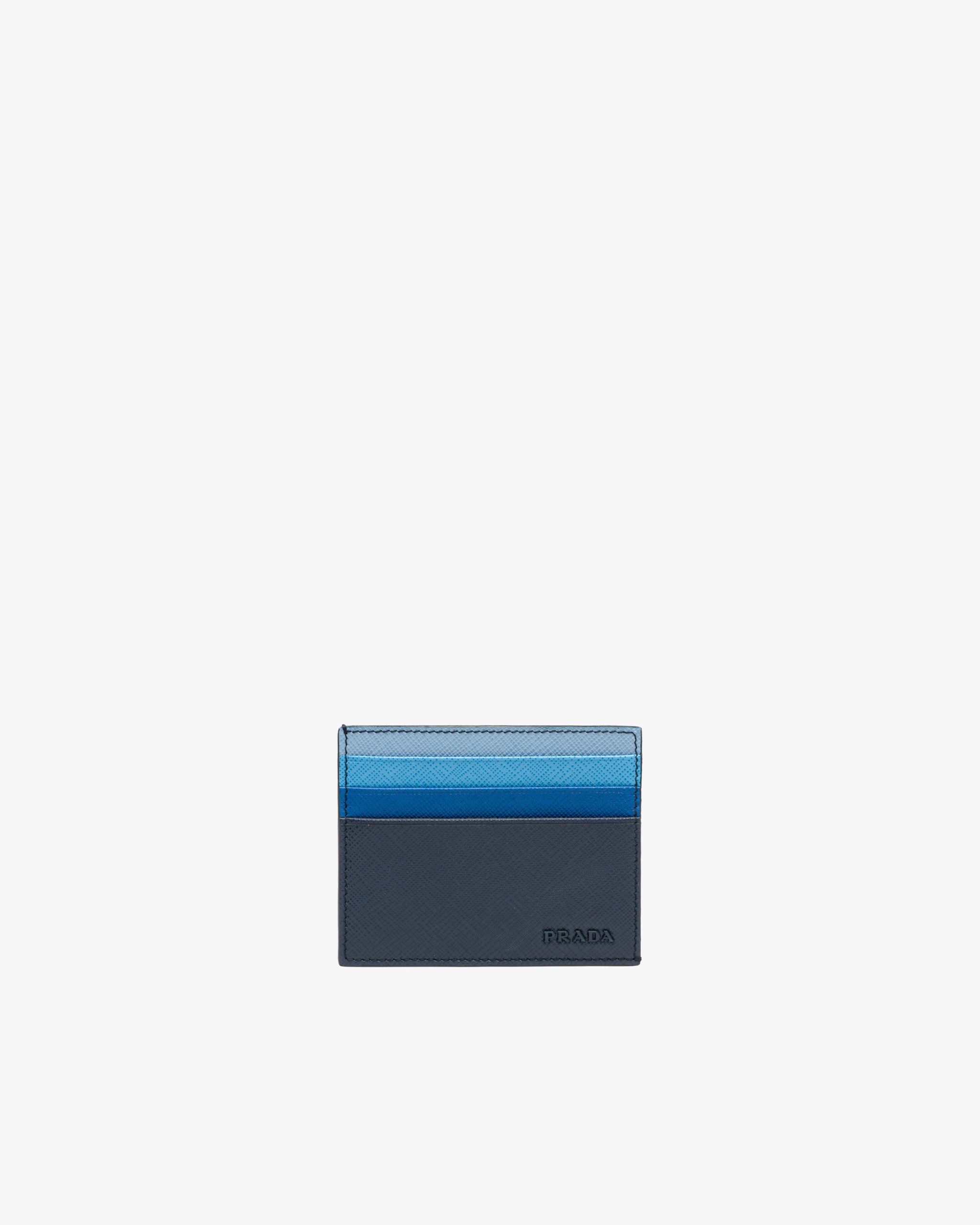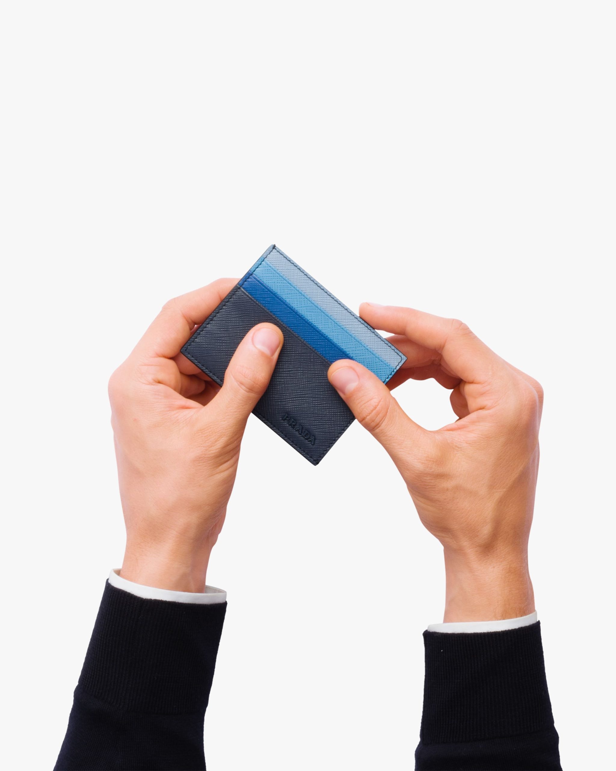 This Saffiano leather credit card holder with six slots has a harmonious gradient effect. The accessory has a fabric lining, while the metal logo is enameled.