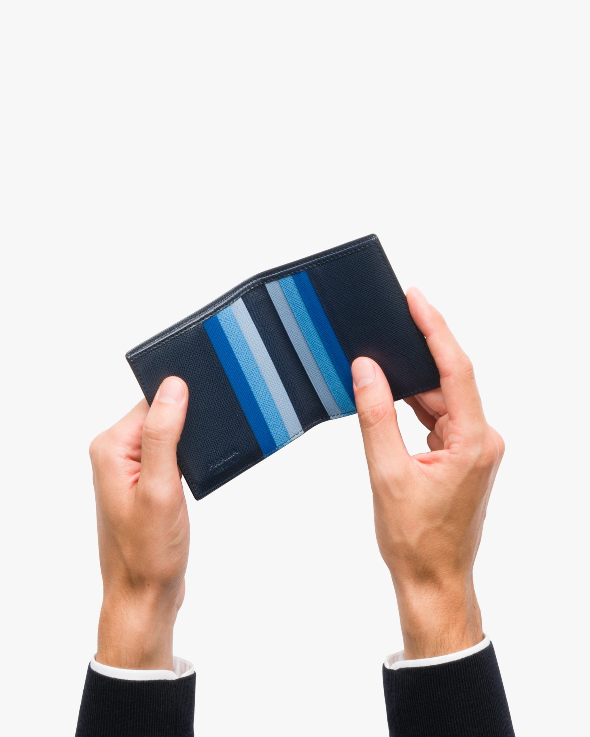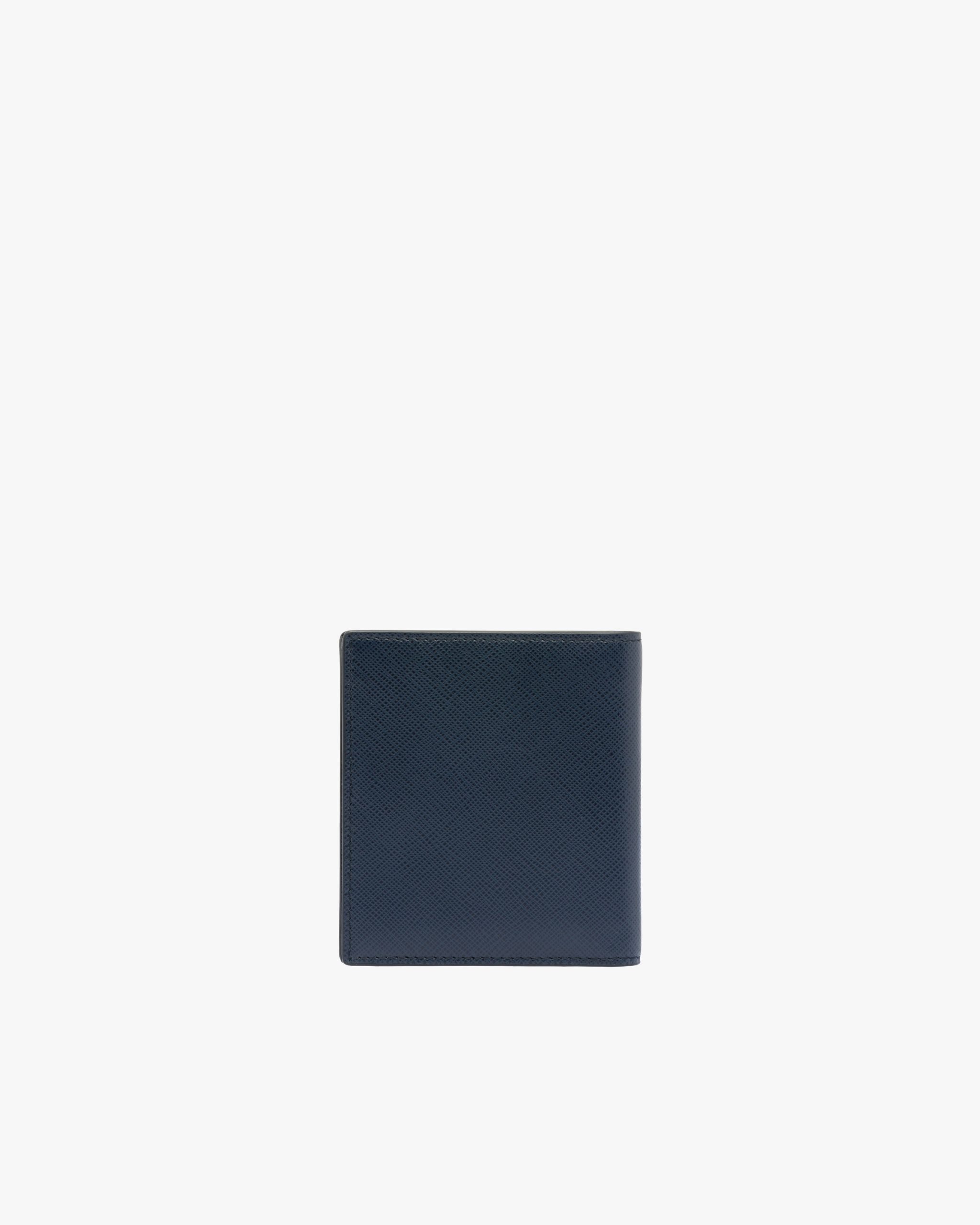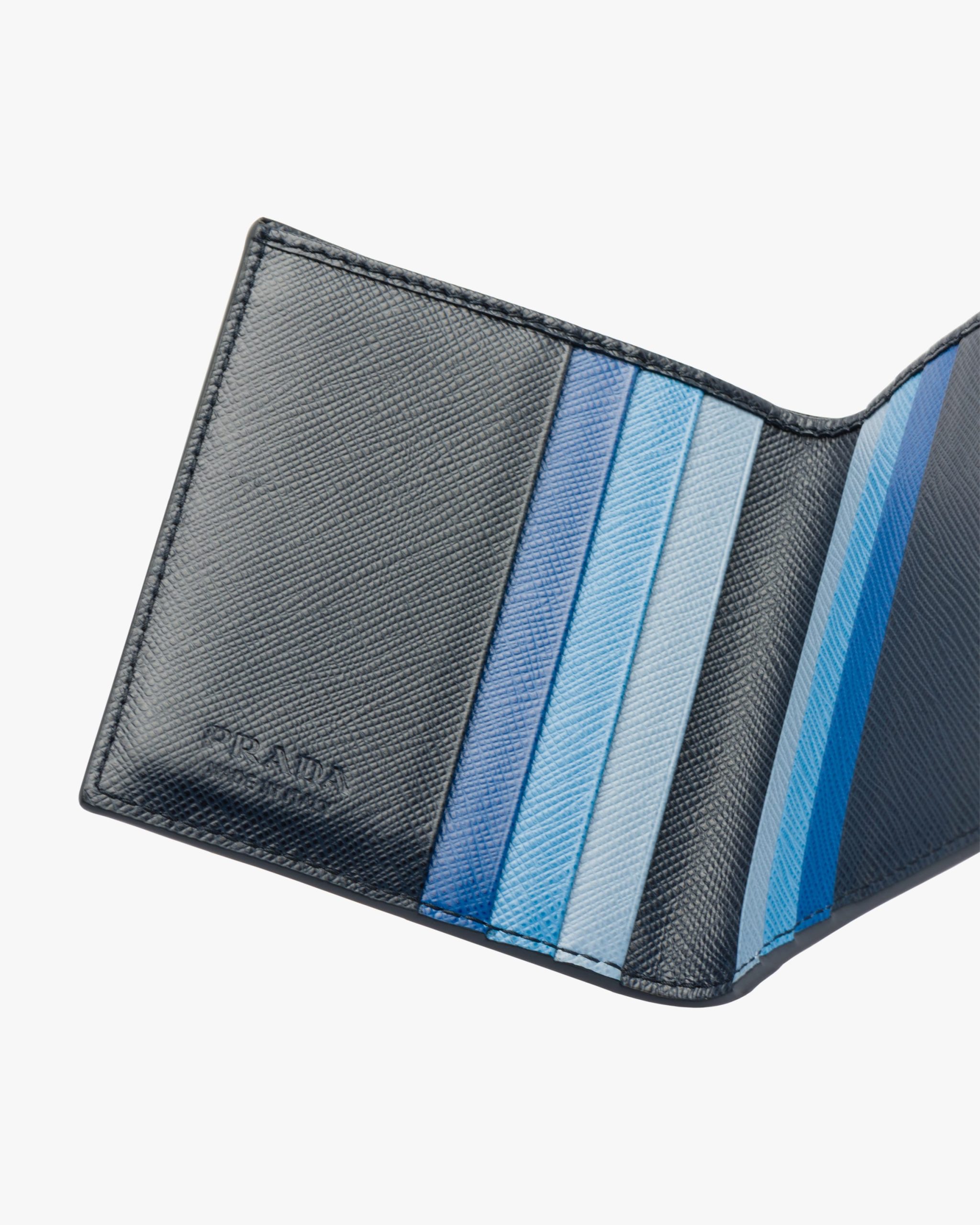 This Saffiano wallet is characterized by a particular interior with slots in different shades and three pockets. The article has a painted metal lettering logo.