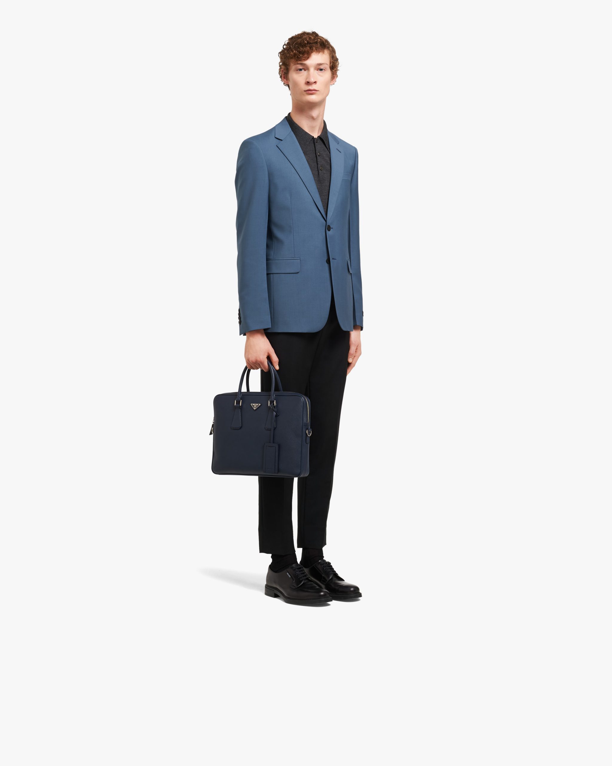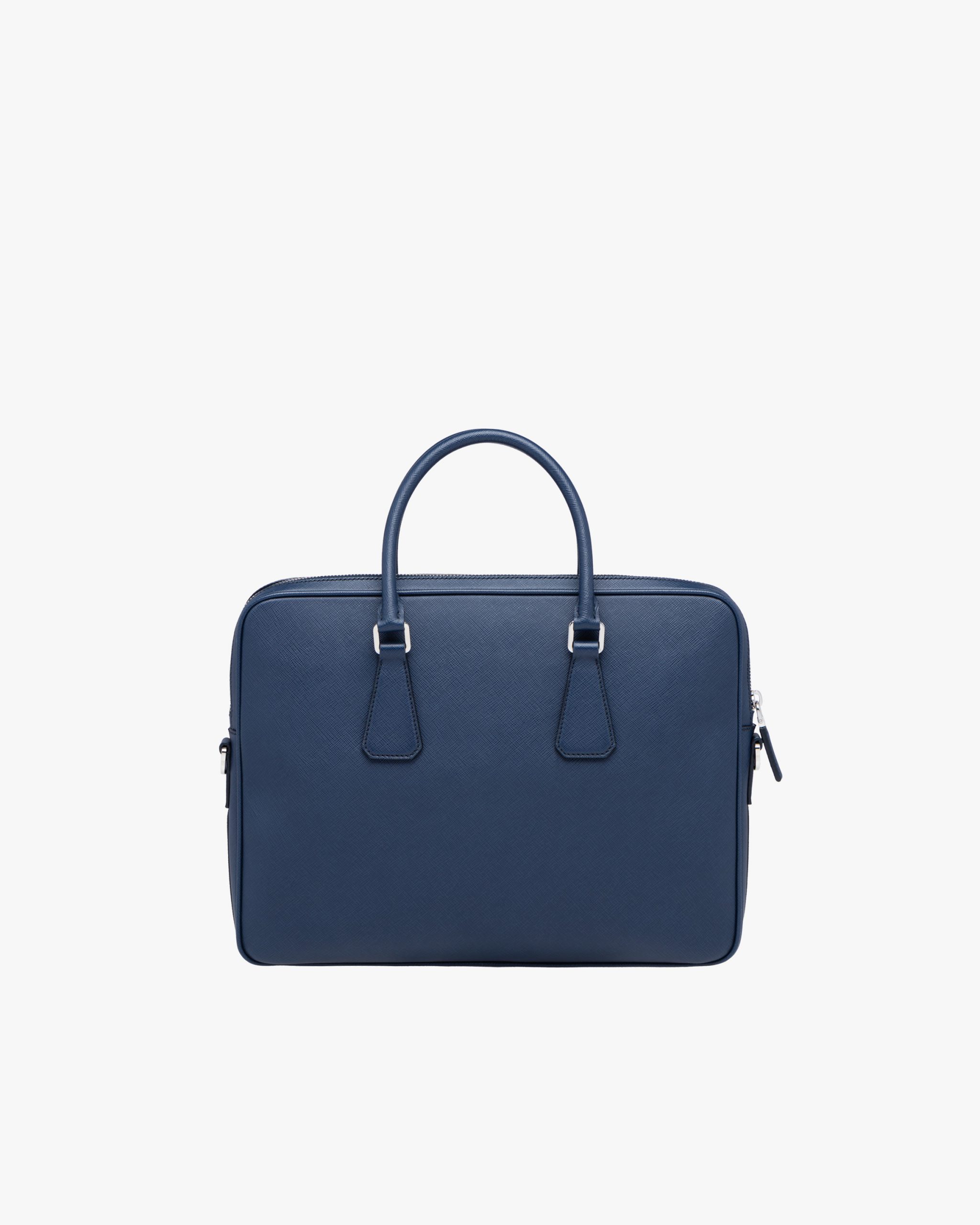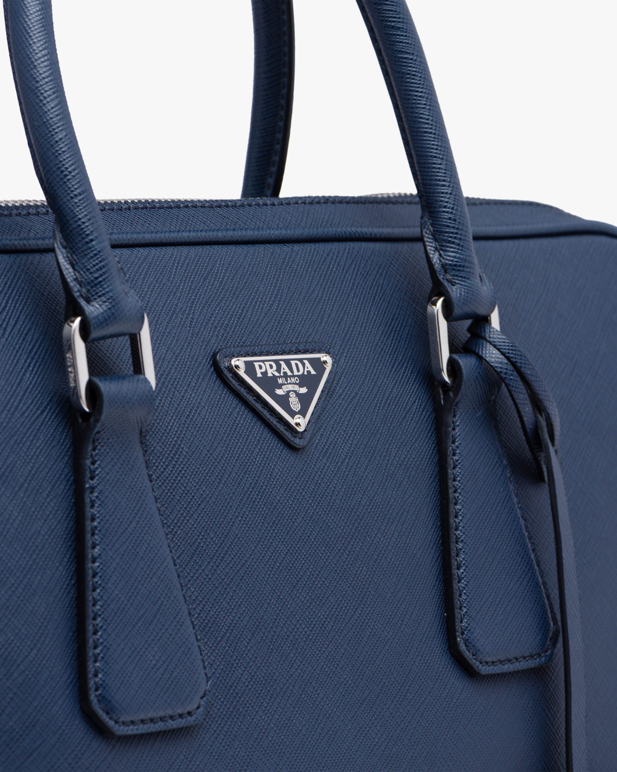 A curve-edged leather briefcase with metal Prada lettering. The case has two handles, a detachable shoulder strap and name tag. The inside has dedicated spaces for an iPad and two smartphones.