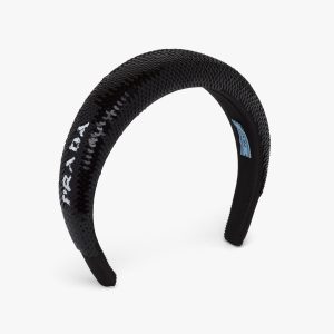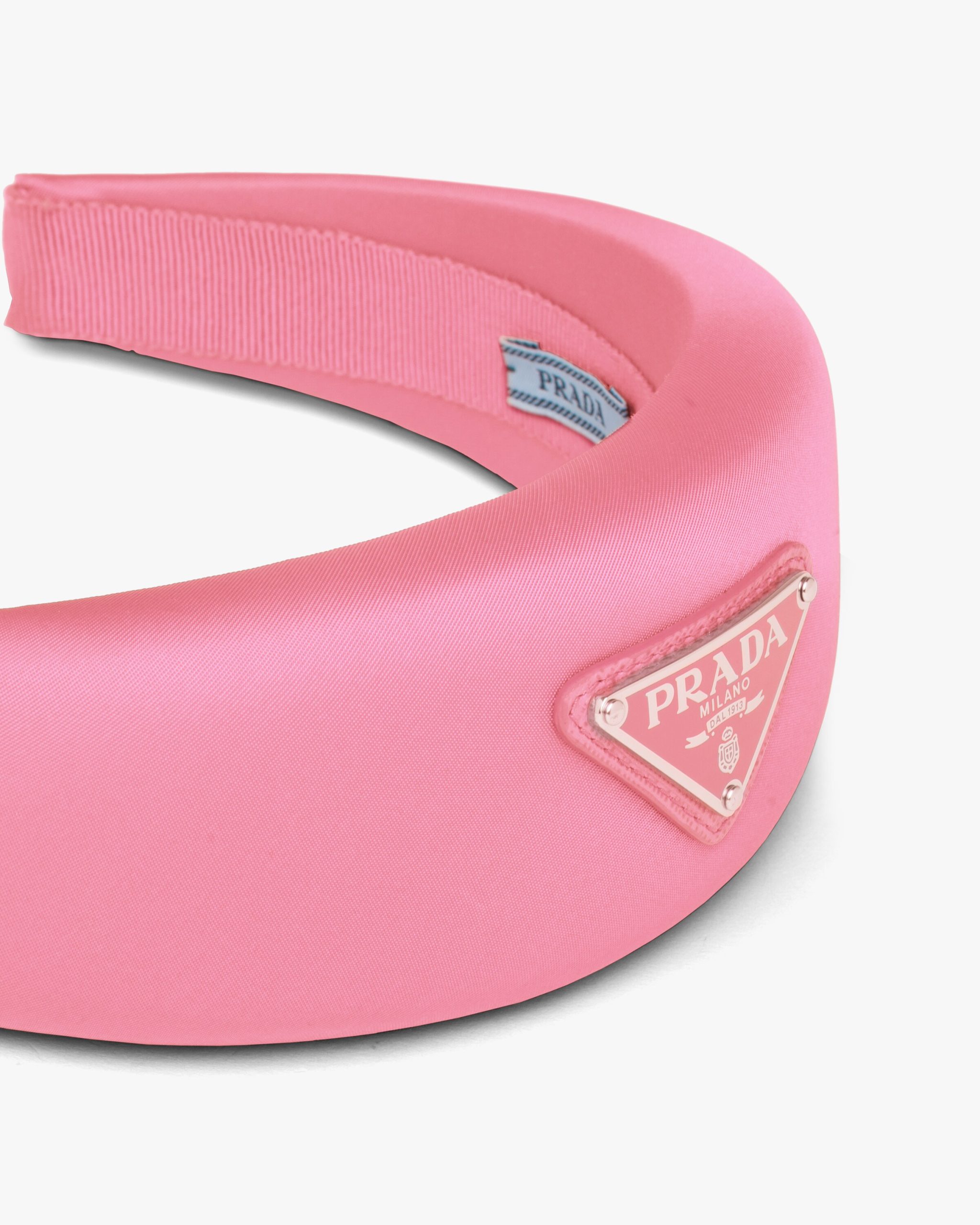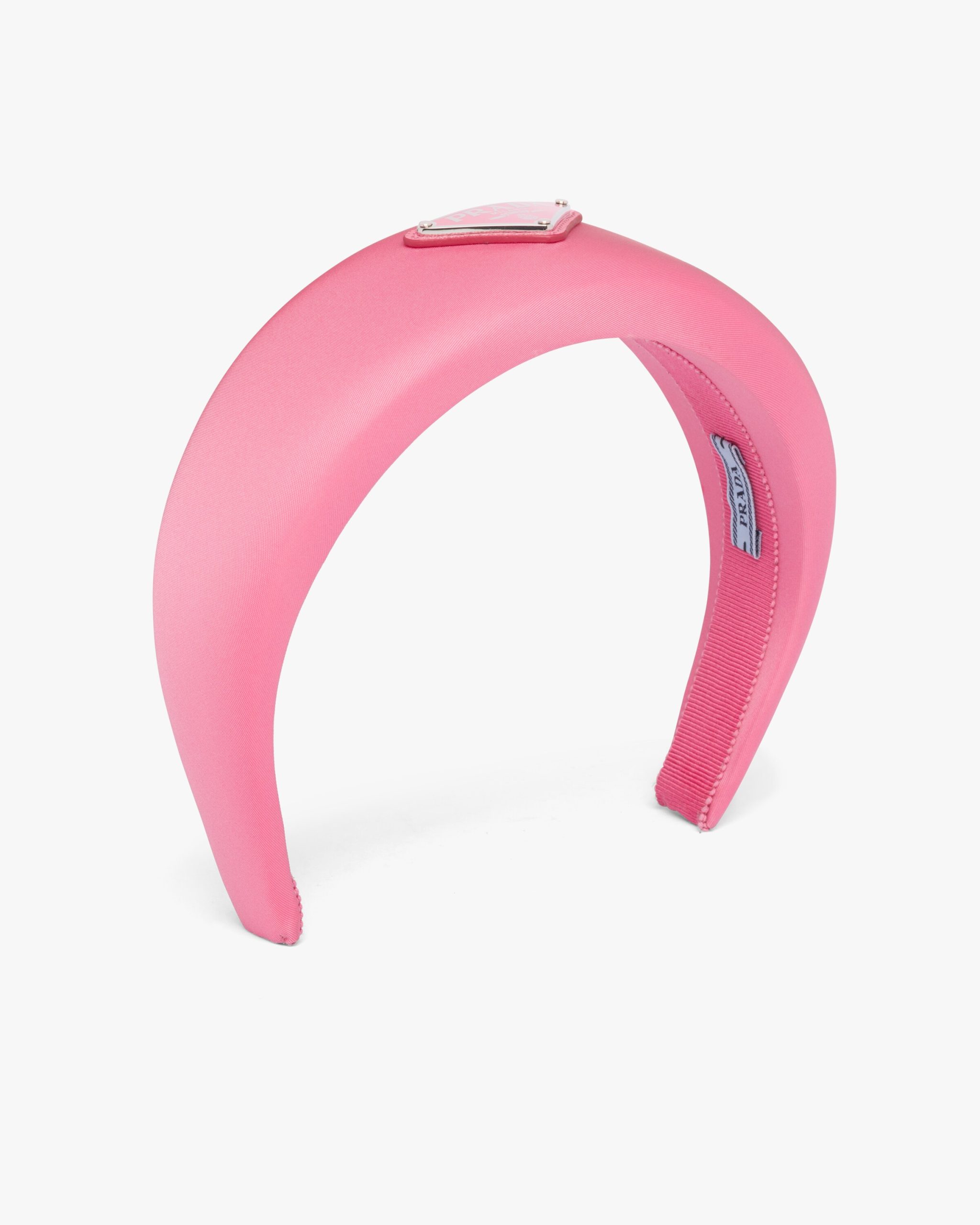 This wide nylon headband with a wraparound design expresses contemporary elegance and is decorated with the Prada triangle logo.