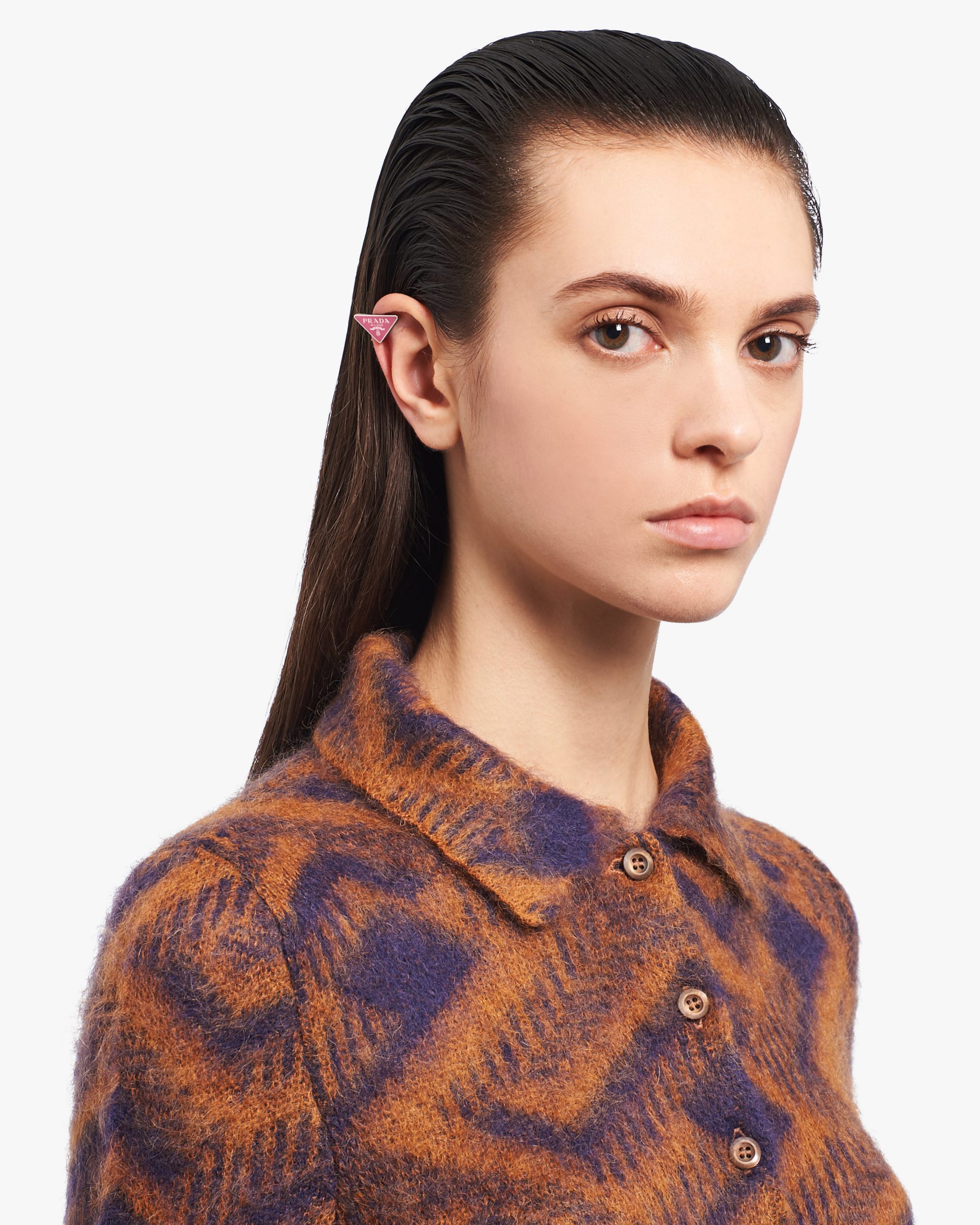 The sleek, iconic triangle logo is the protagonist of a new jewelry line made of 925 sterling silver that reinterprets punk influences in a modern way. Prada’s historic code with an enamel finish defines this single clip earring.