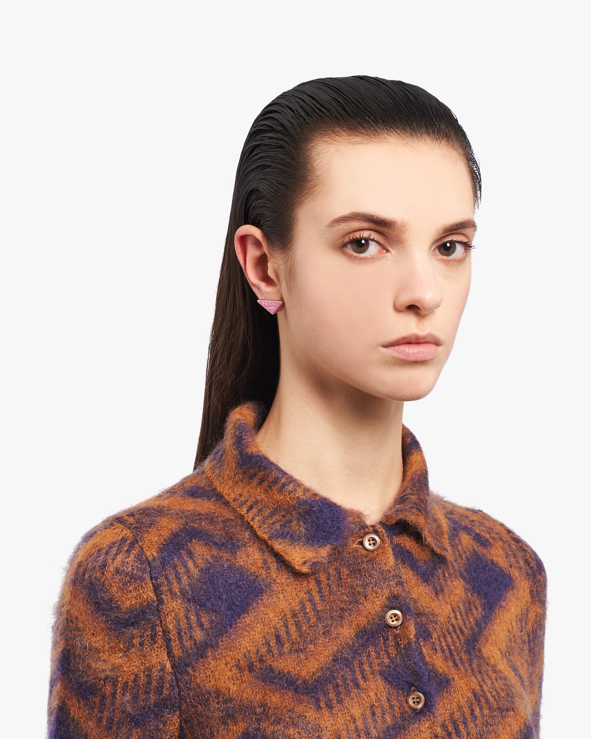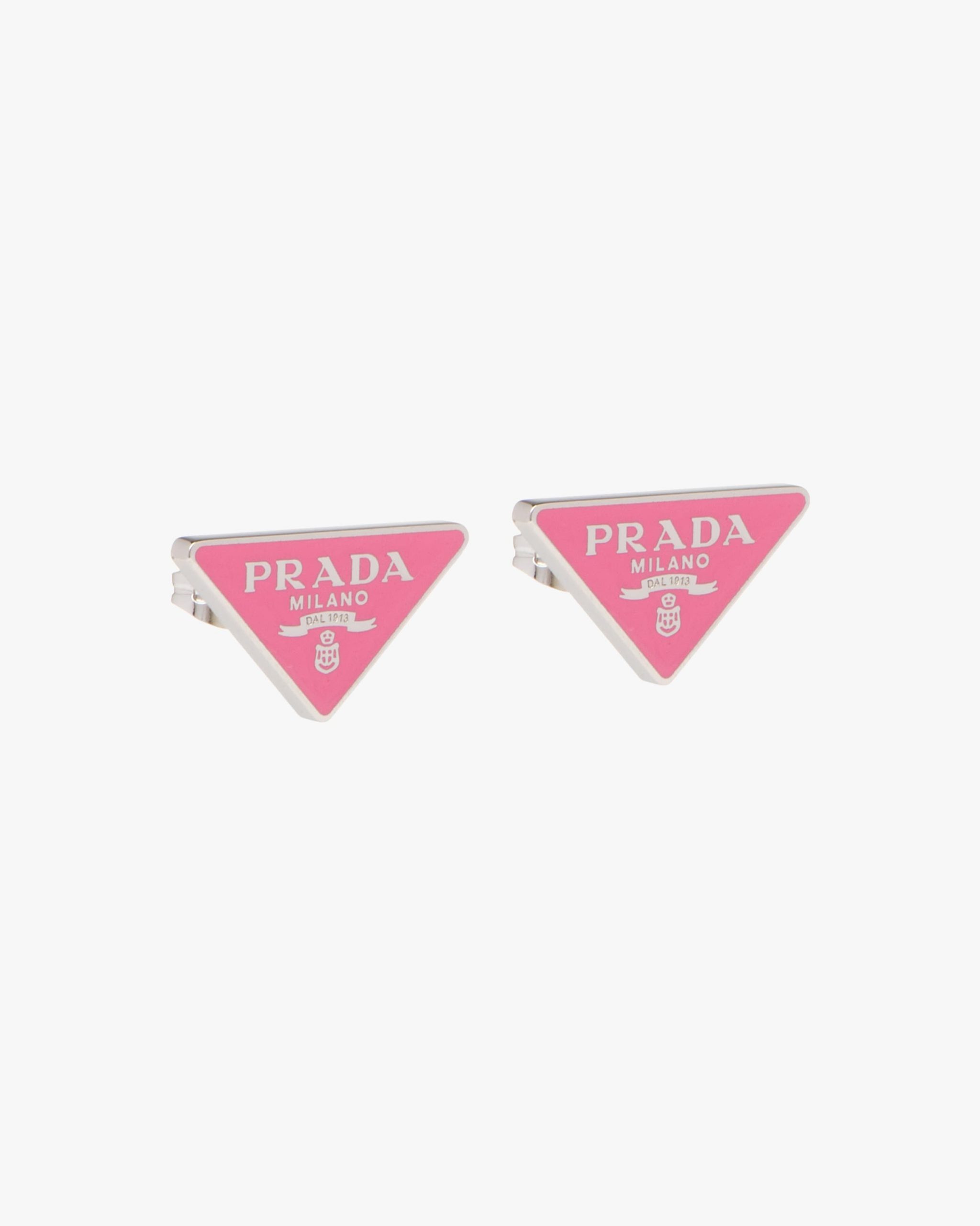 Prada’s historic symbol decorated with enamel defines this pair of earrings. Iconic and sleek, the triangle logo is the protagonist of a new line of jewelry made of 925 sterling silver that reinterprets punk influences in a modern way.