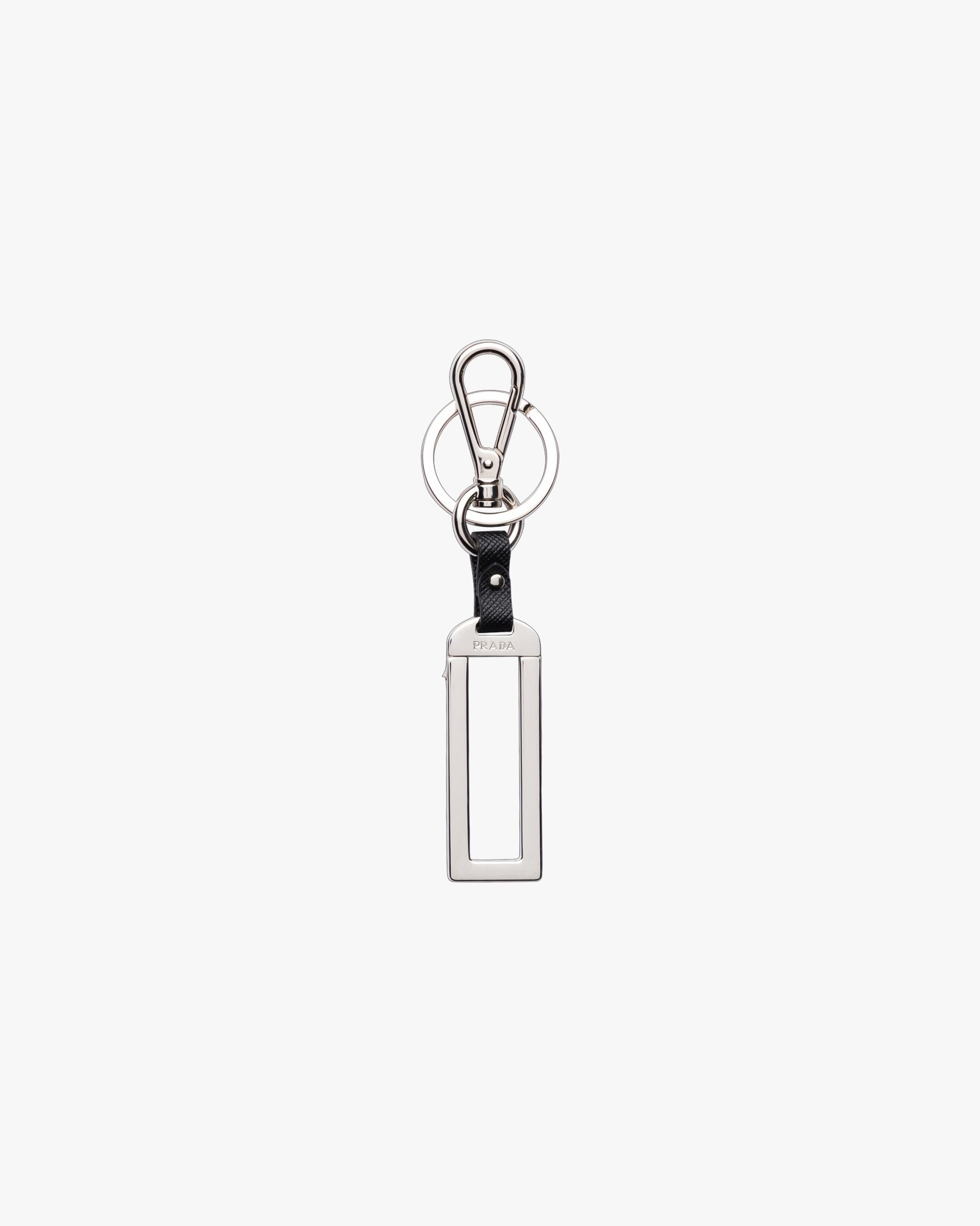 An elegantly simple polished metal and Saffiano leather name tag that can be customized with letters and other elements and is defined by an engraved Prada logo.