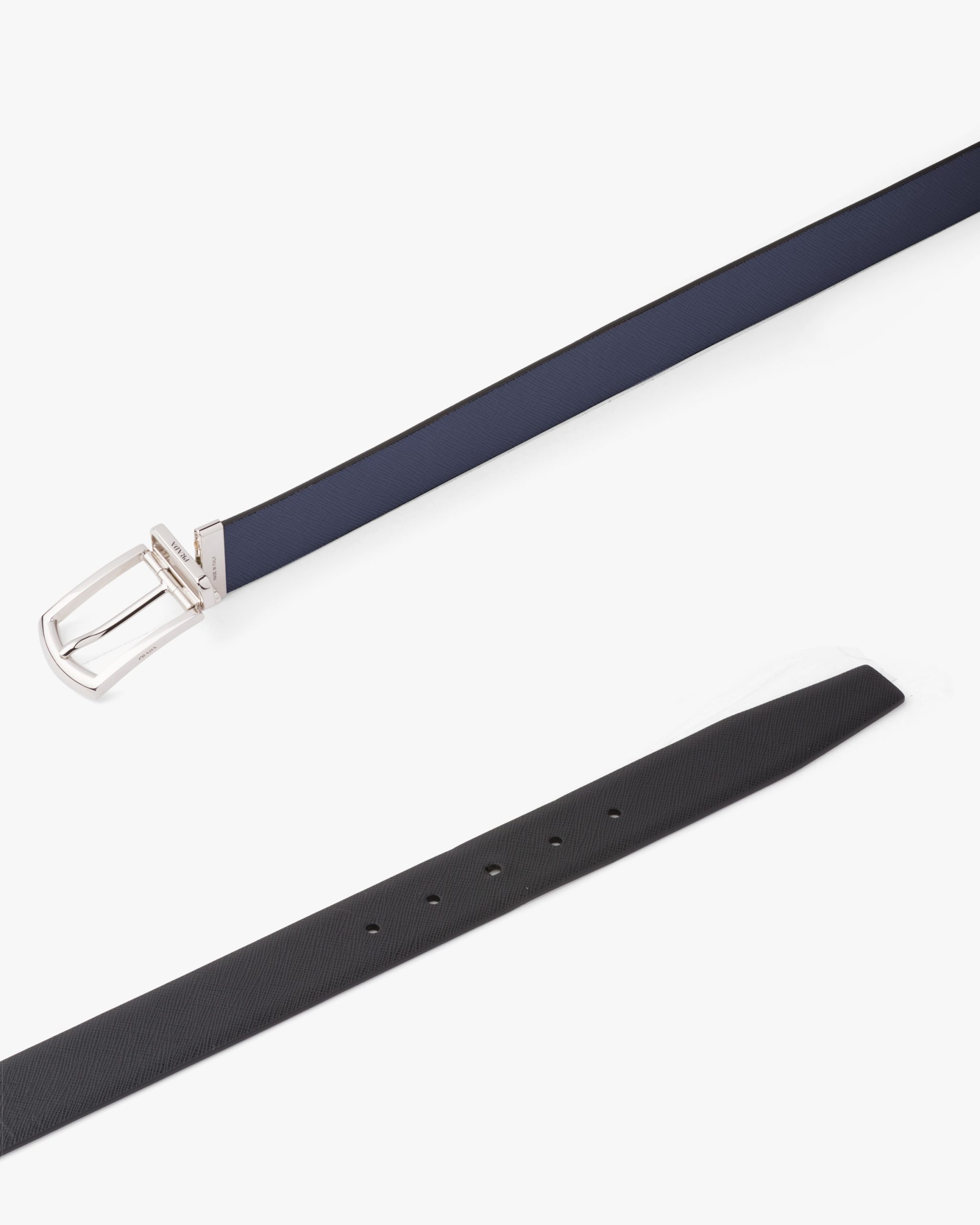This fine Saffiano leather belt characterized by its reversible design has an elegant metal buckle.