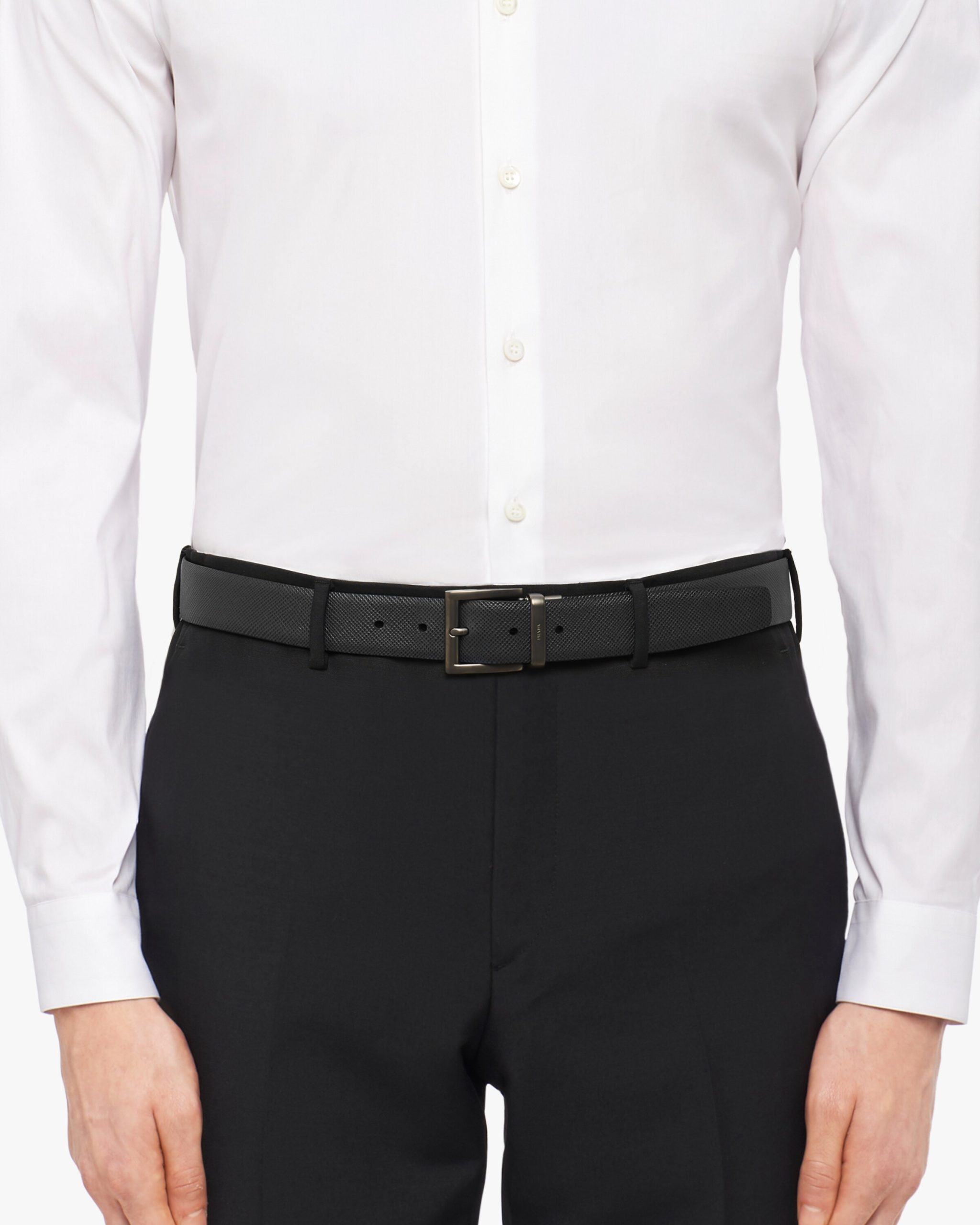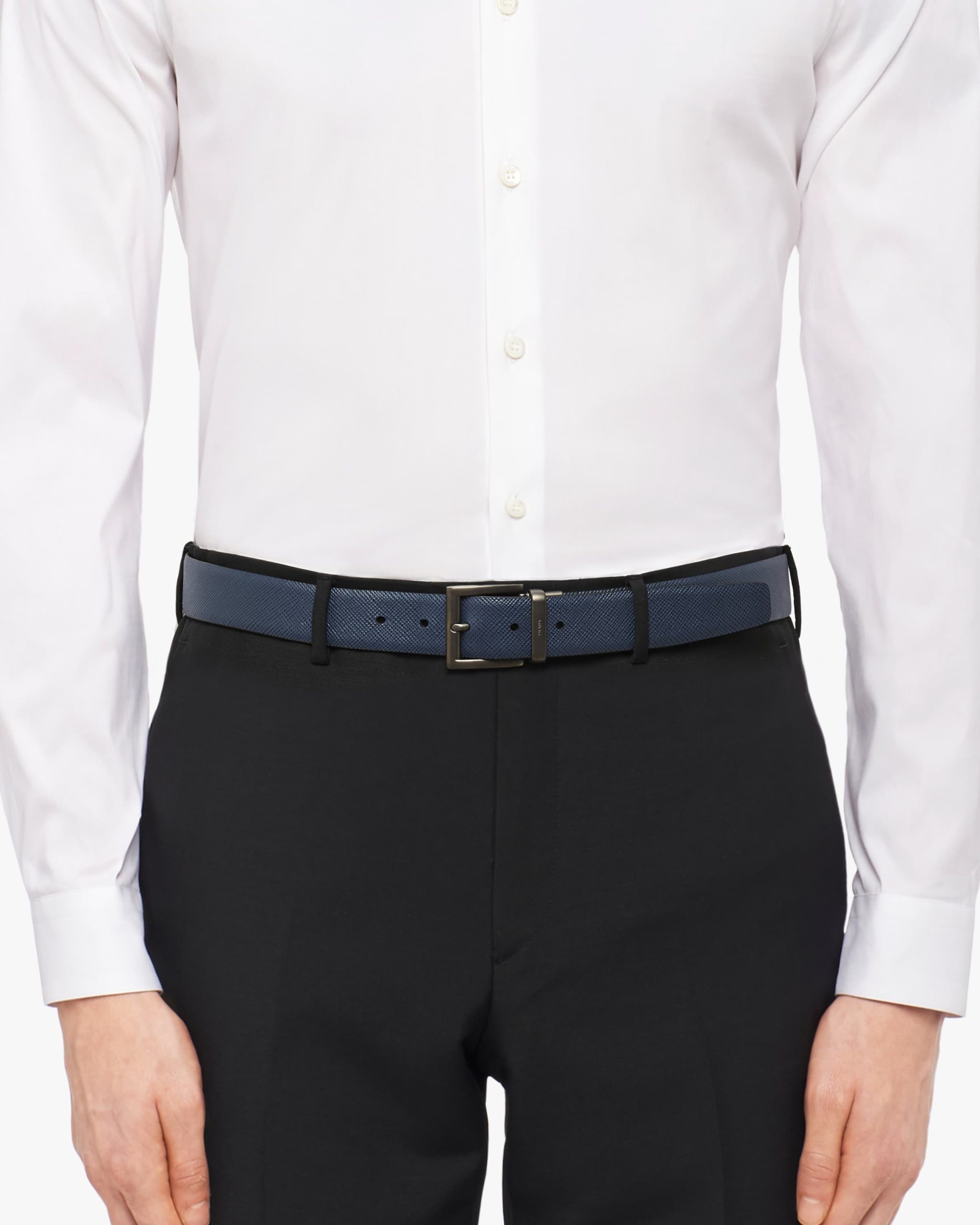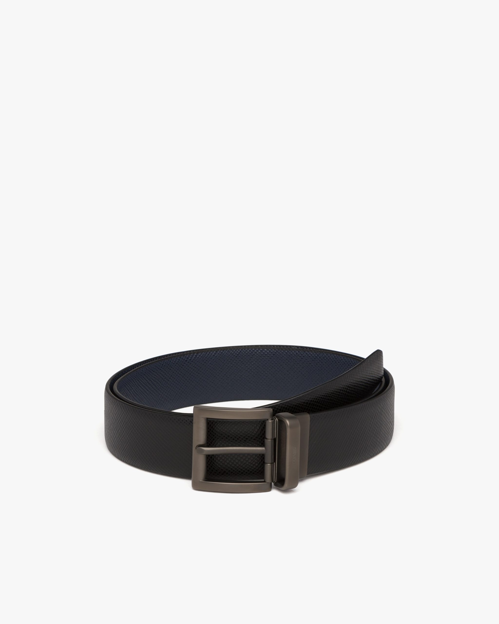 This two-toned Saffiano leather reversible belt can be worn with different outfits. The 3.3cm accessory features a black palladium finish buckle stamped with the Prada logo.