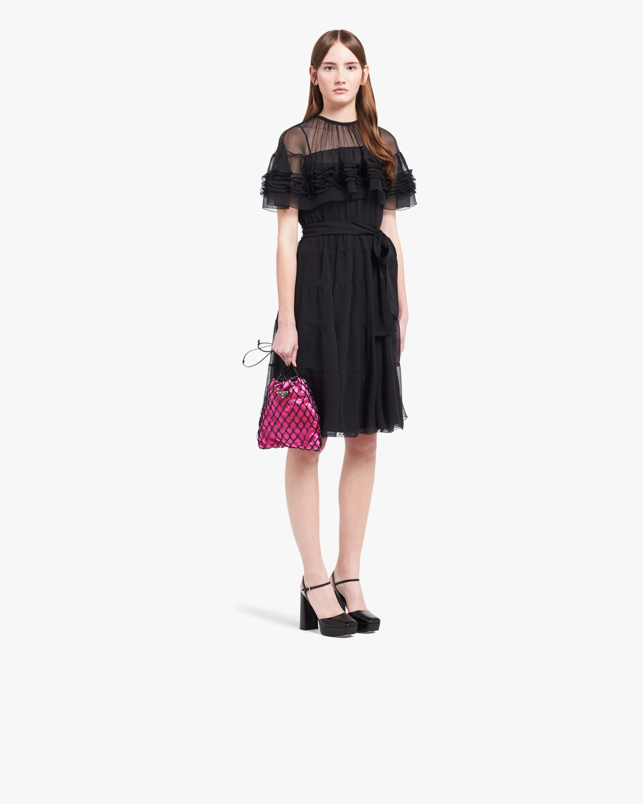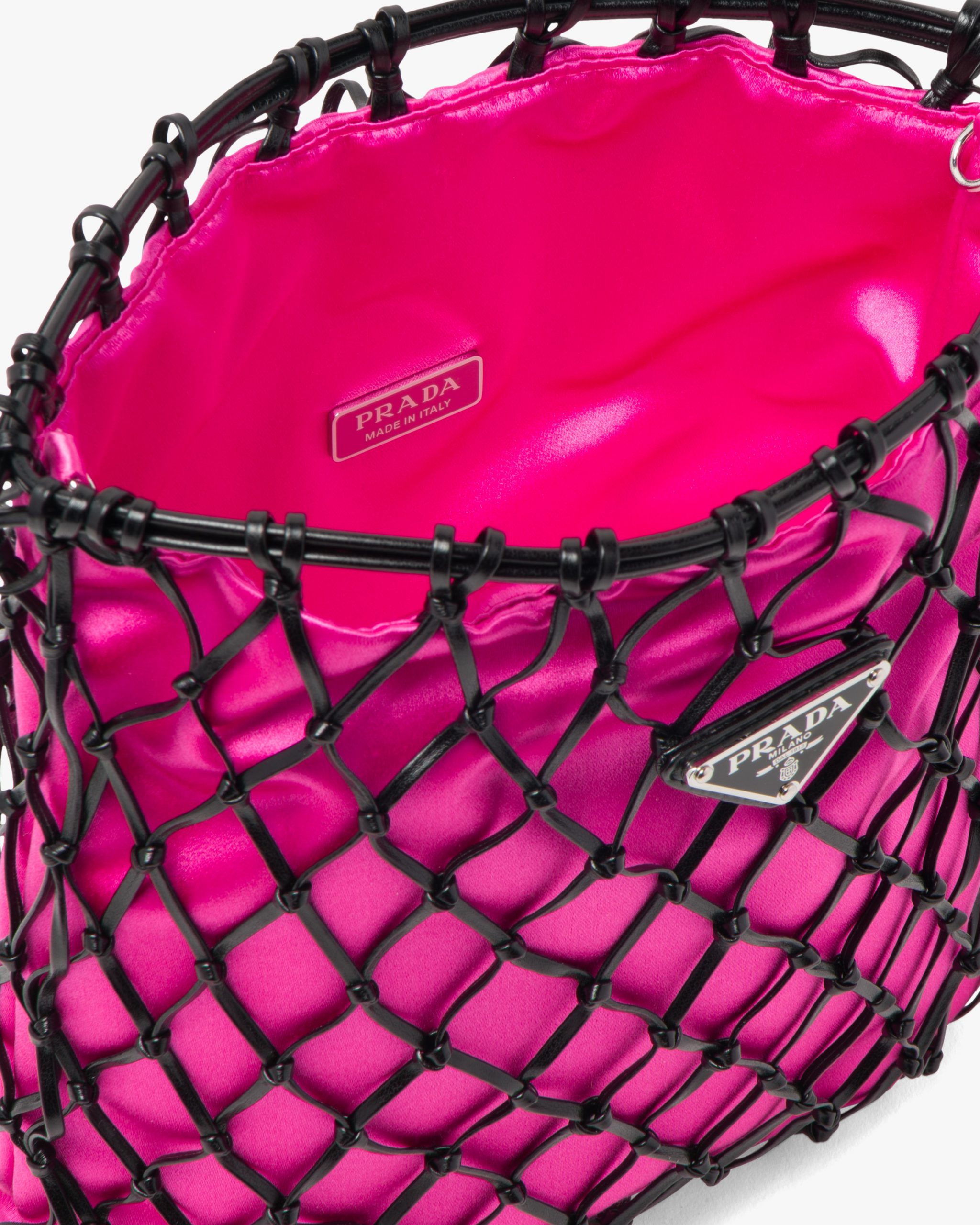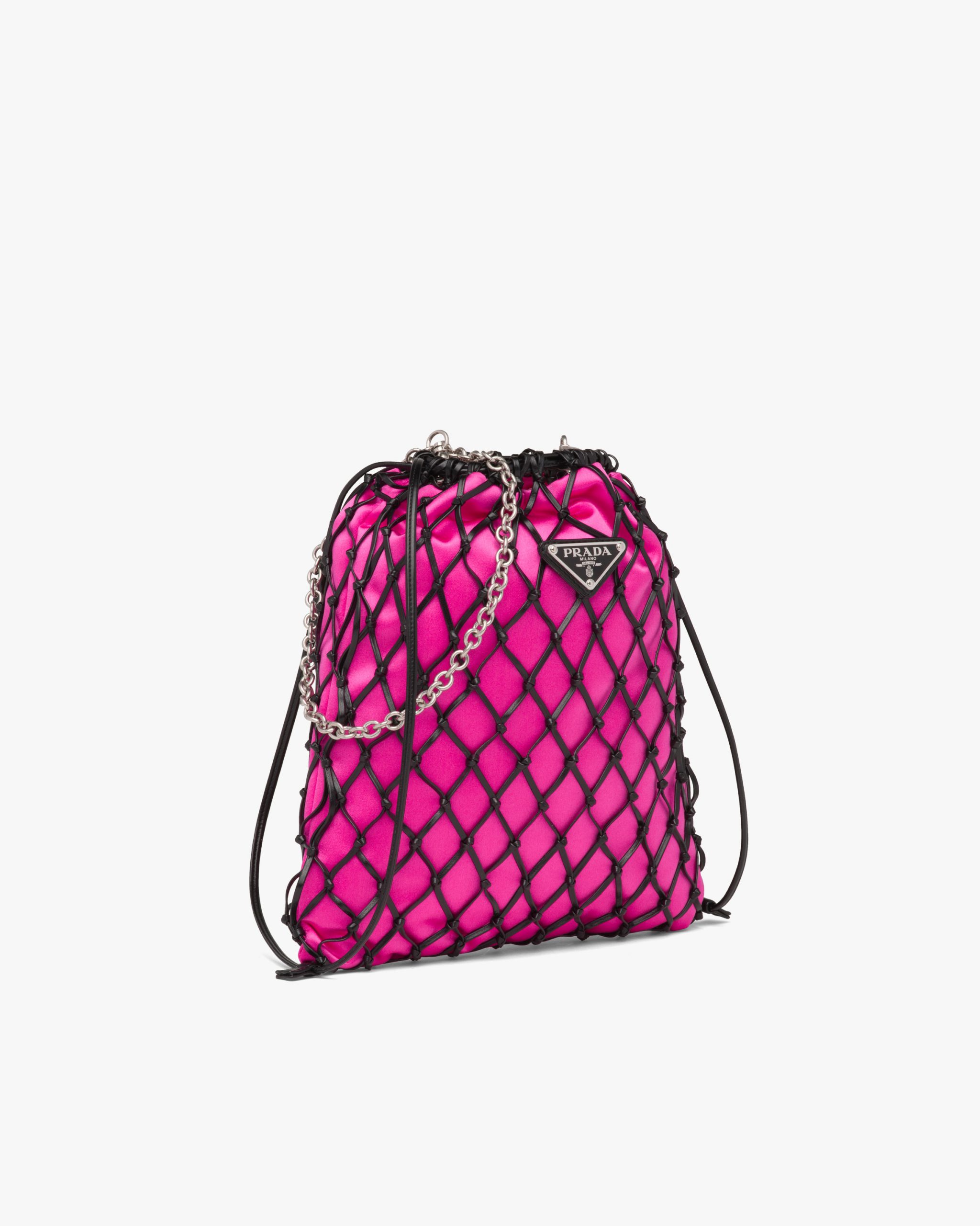 This clutch bag is defined by the appealing graphic effect of the mesh exterior that reveals the elegant satin interior. The refined design of this shoulder bag is decorated with the enamel triangle logo.