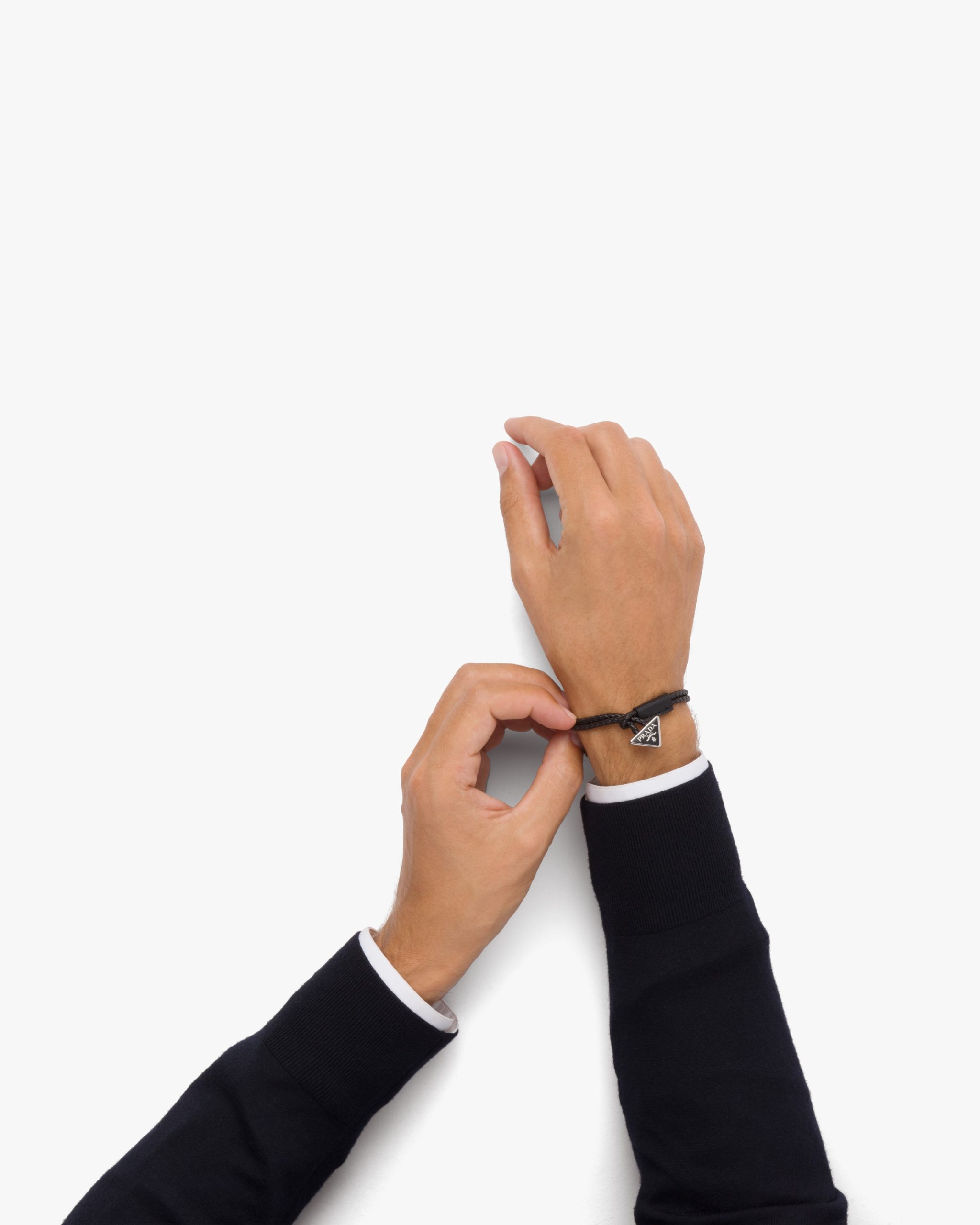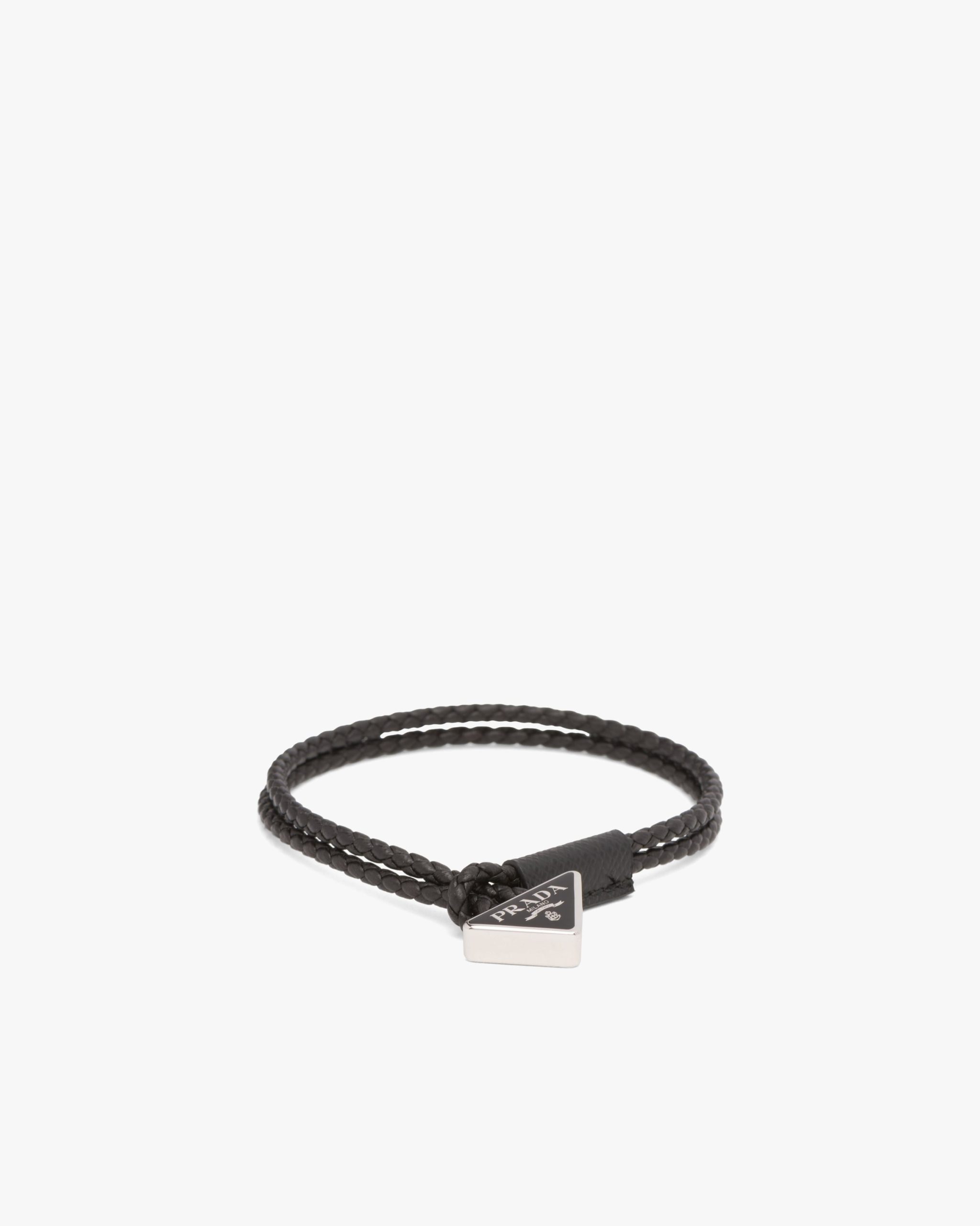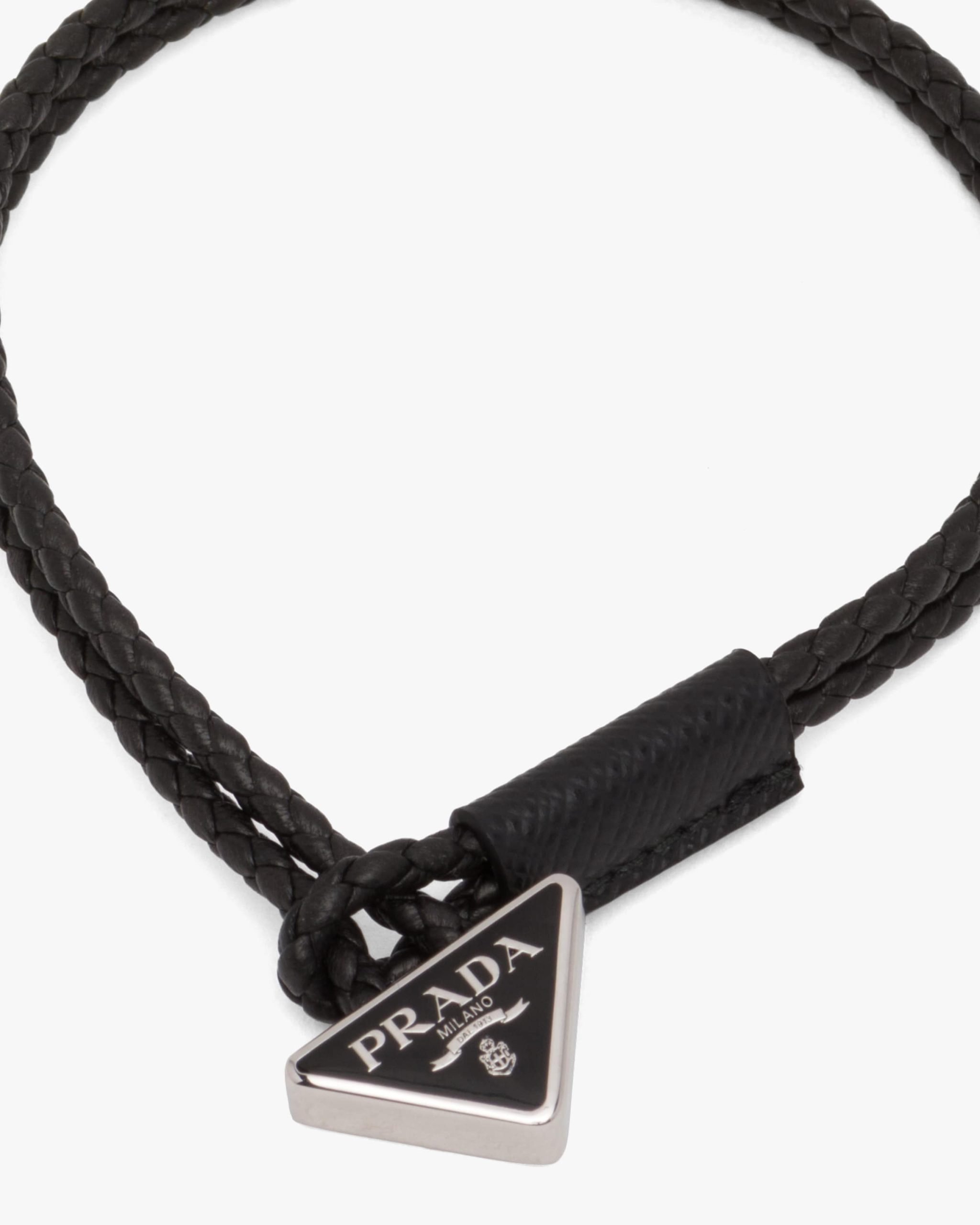 This braided leather bracelet is defined by its modern clasp with triangle logo.