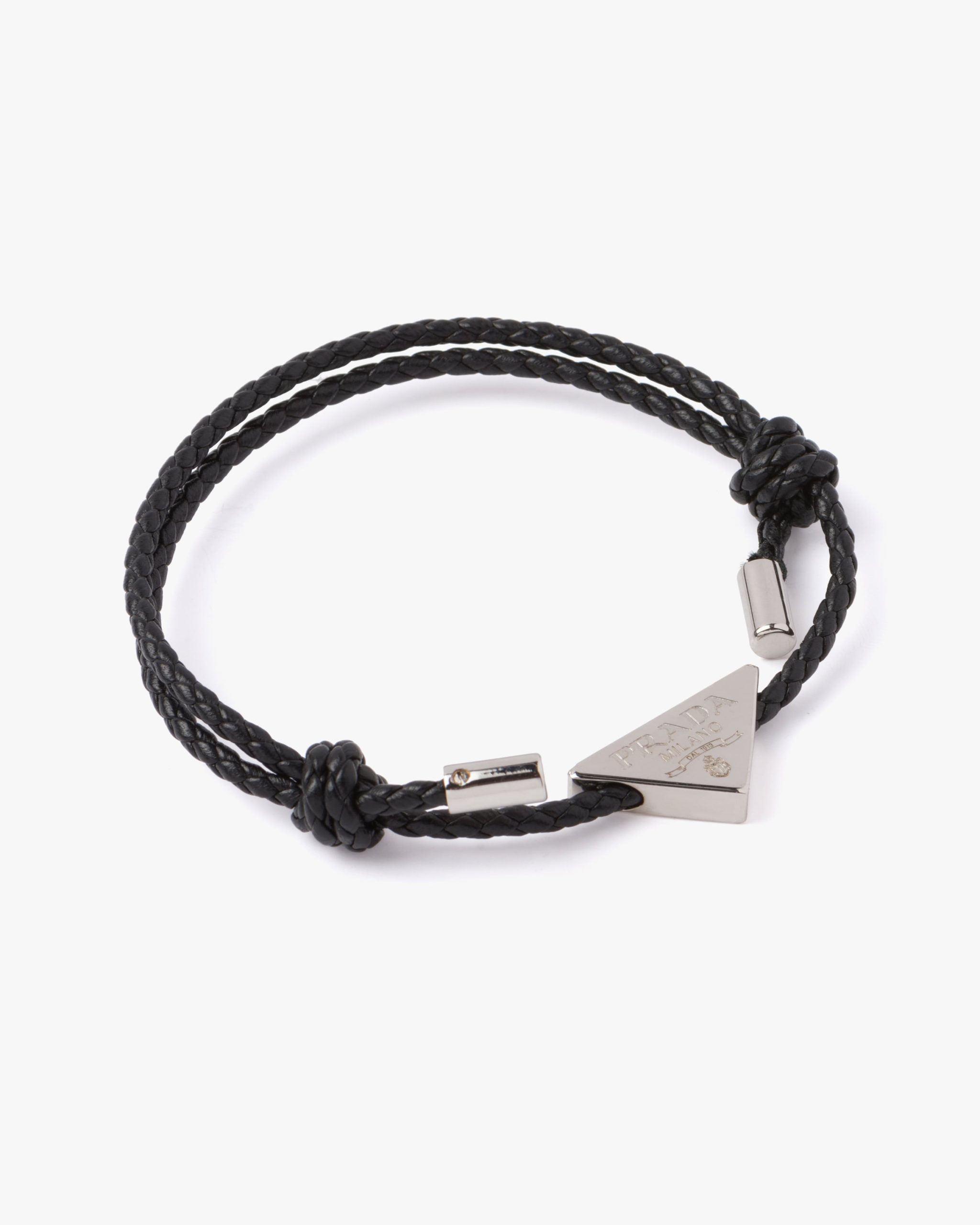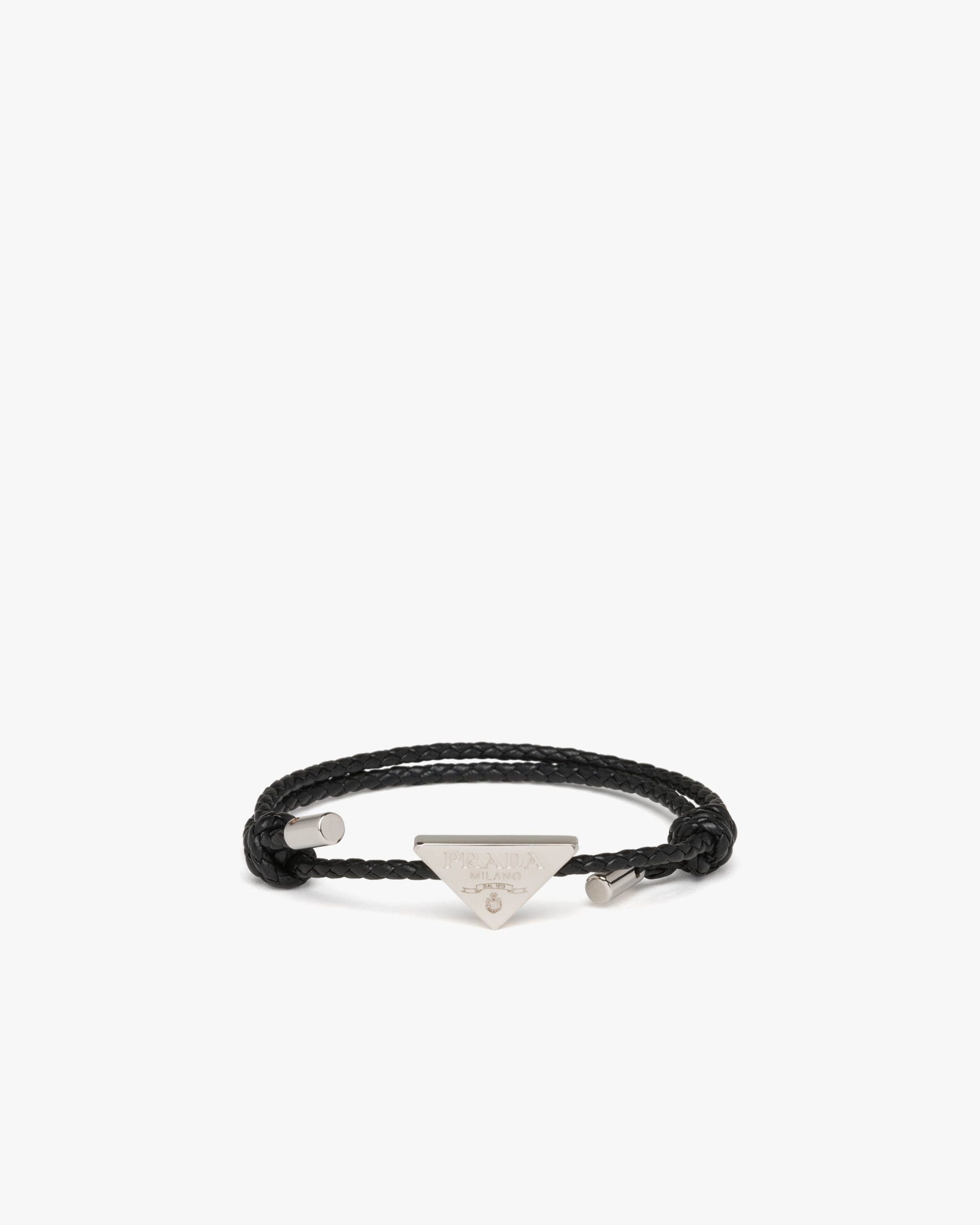 An iconic part of the brand?? make-up, originating from the trunks designed by Mario Prada, the triangle logo is given a modern twist on this braided nappa leather bracelet.