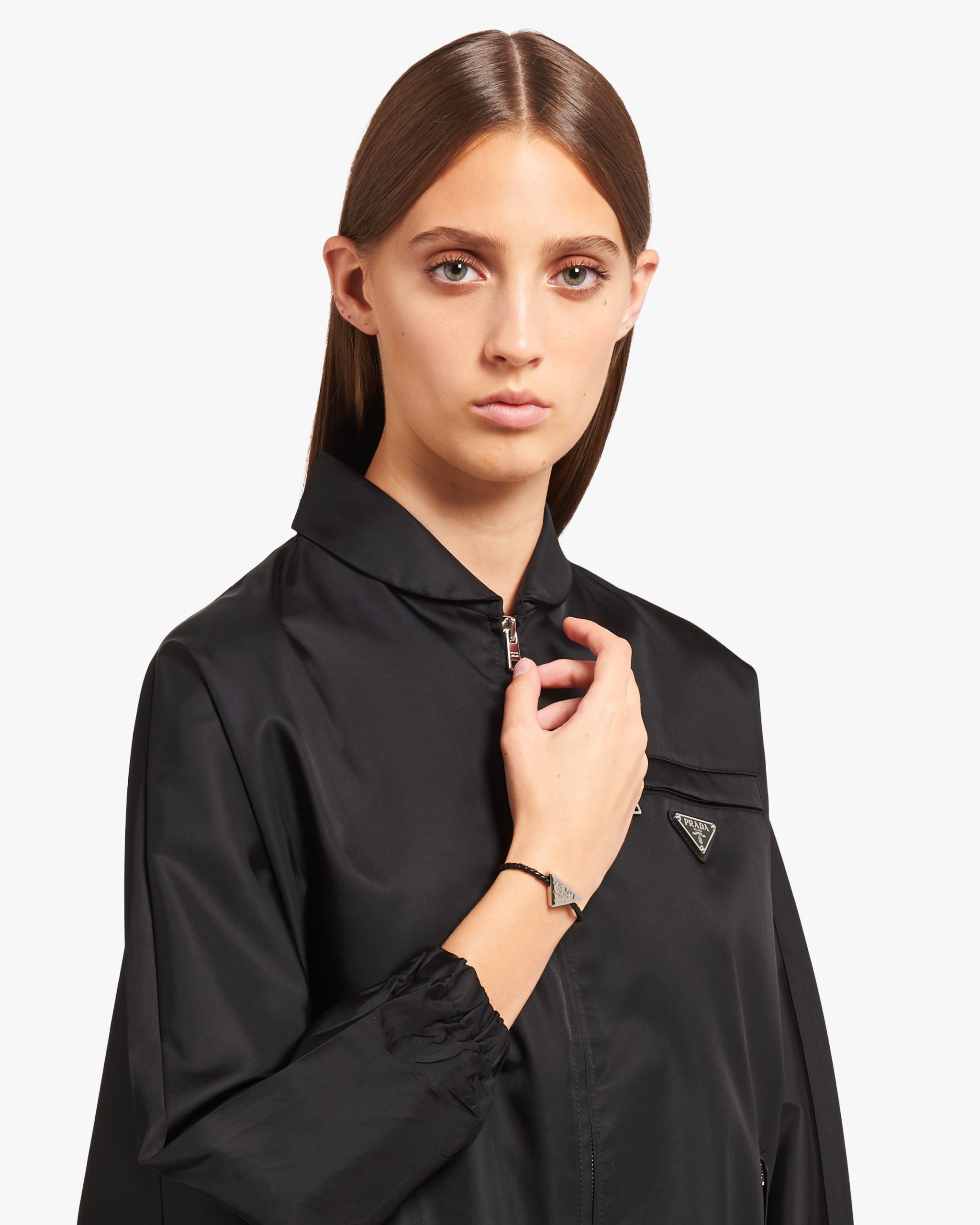 The sophisticated braided motif animates this nappa leather bracelet with metal barrel screw clasp. The metal triangle logo charm stands out.