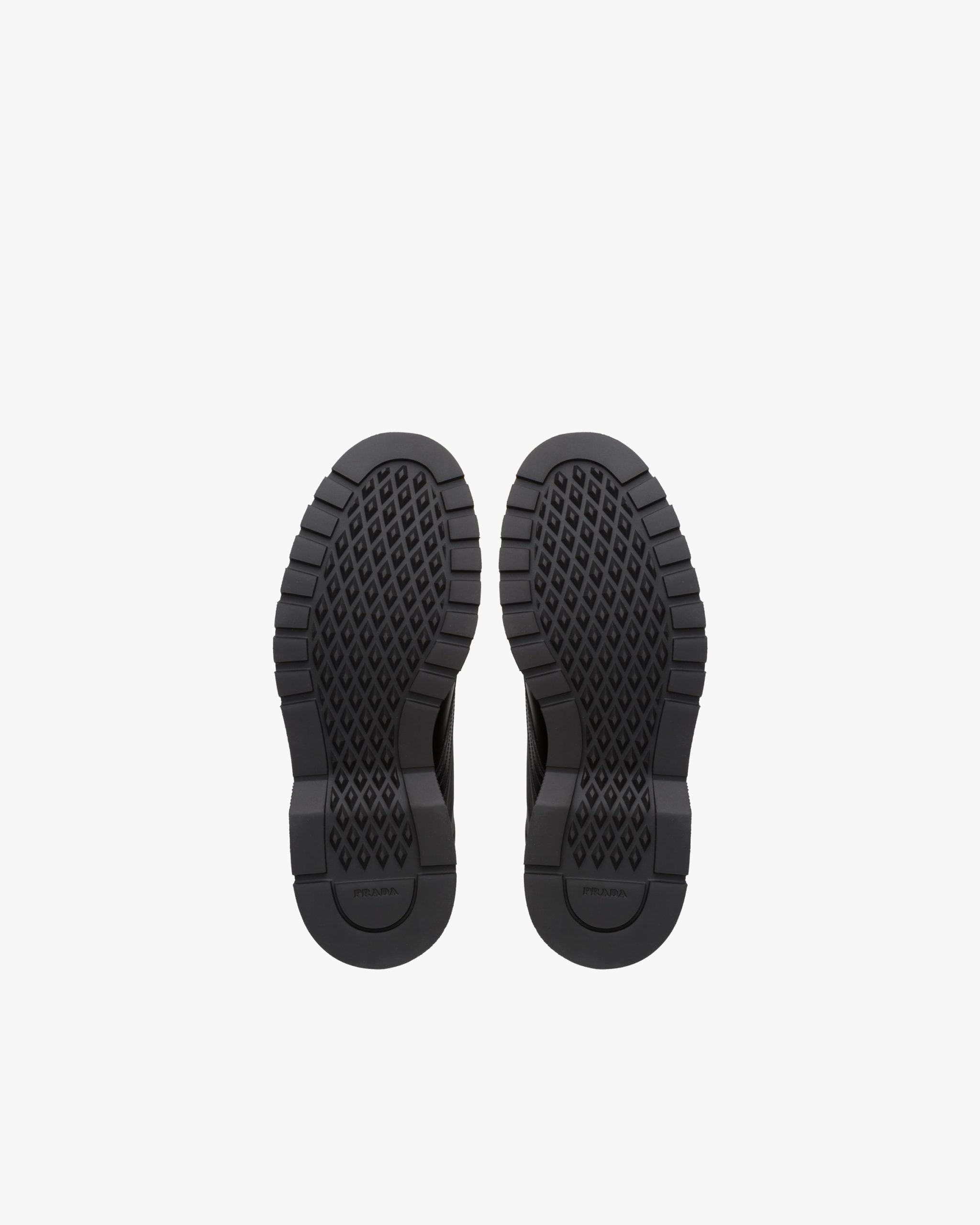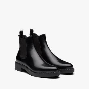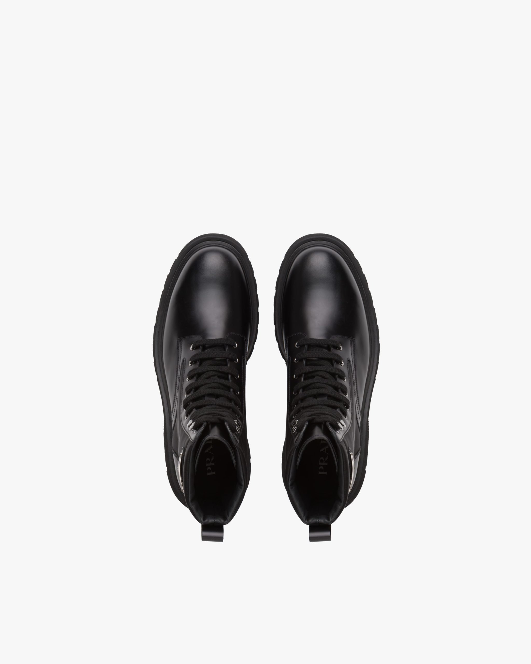 An iconic design characterizes these brushed leather combat boots with large inserts in nylon, a distinctive Prada material. The footwear with metal eyelets and hooks and light lug sole is decorated with the enameled metal triangle logo.