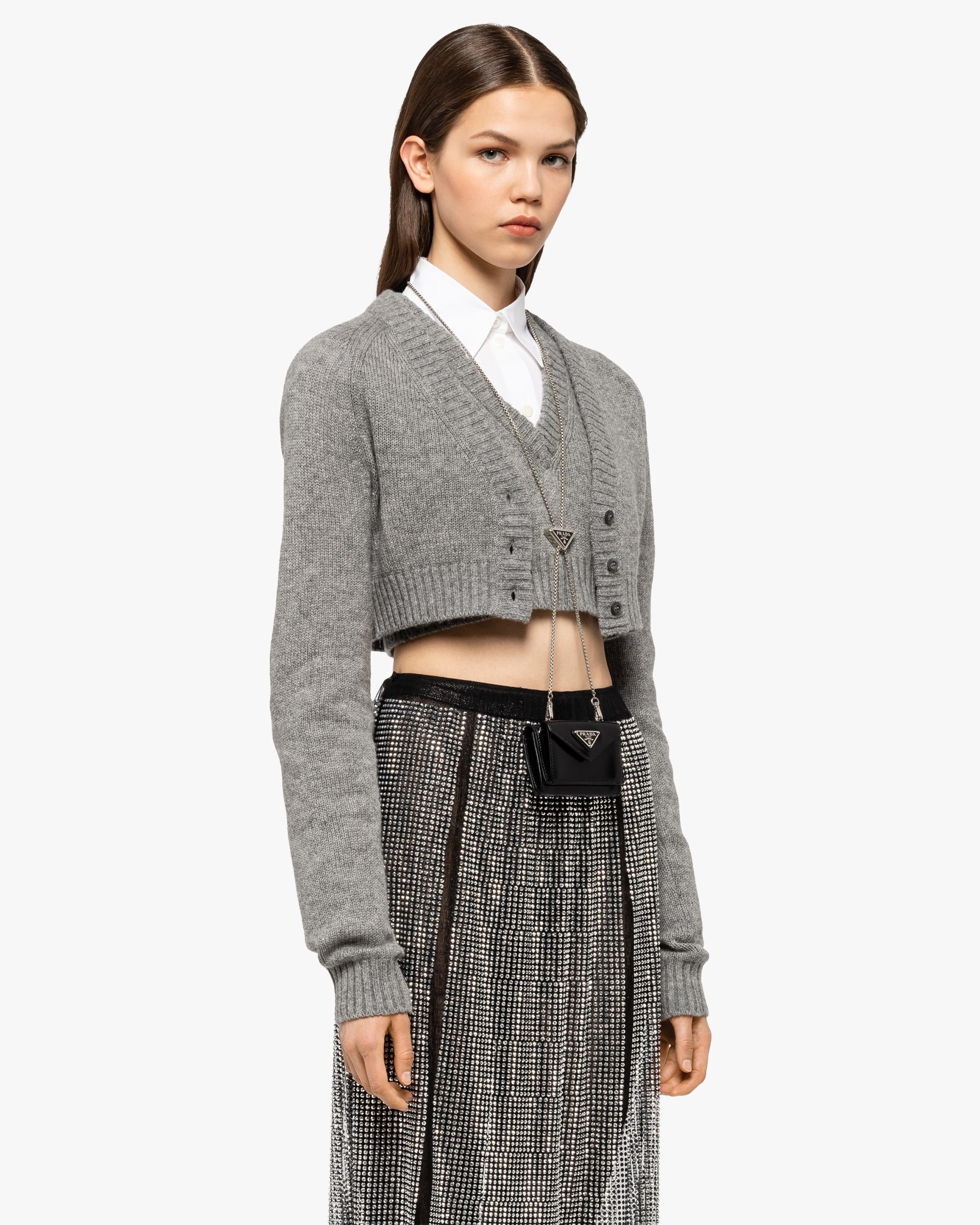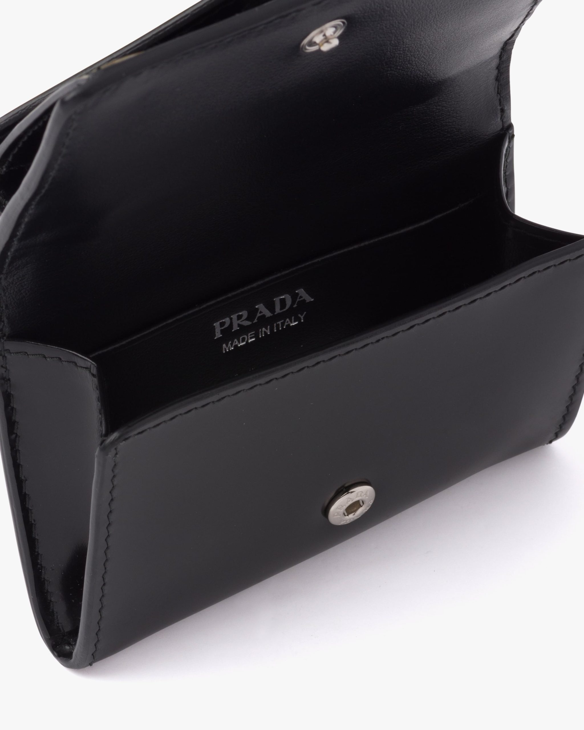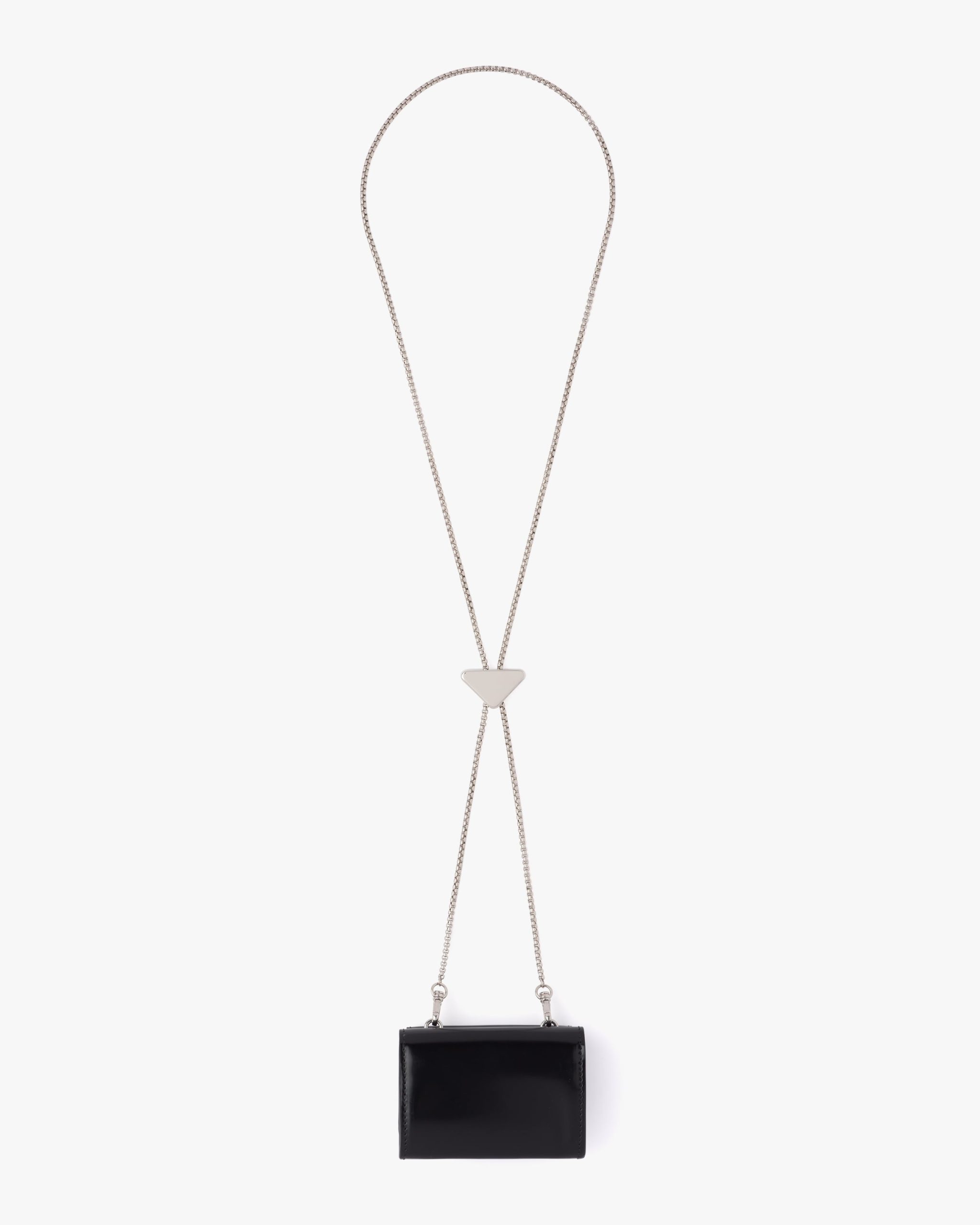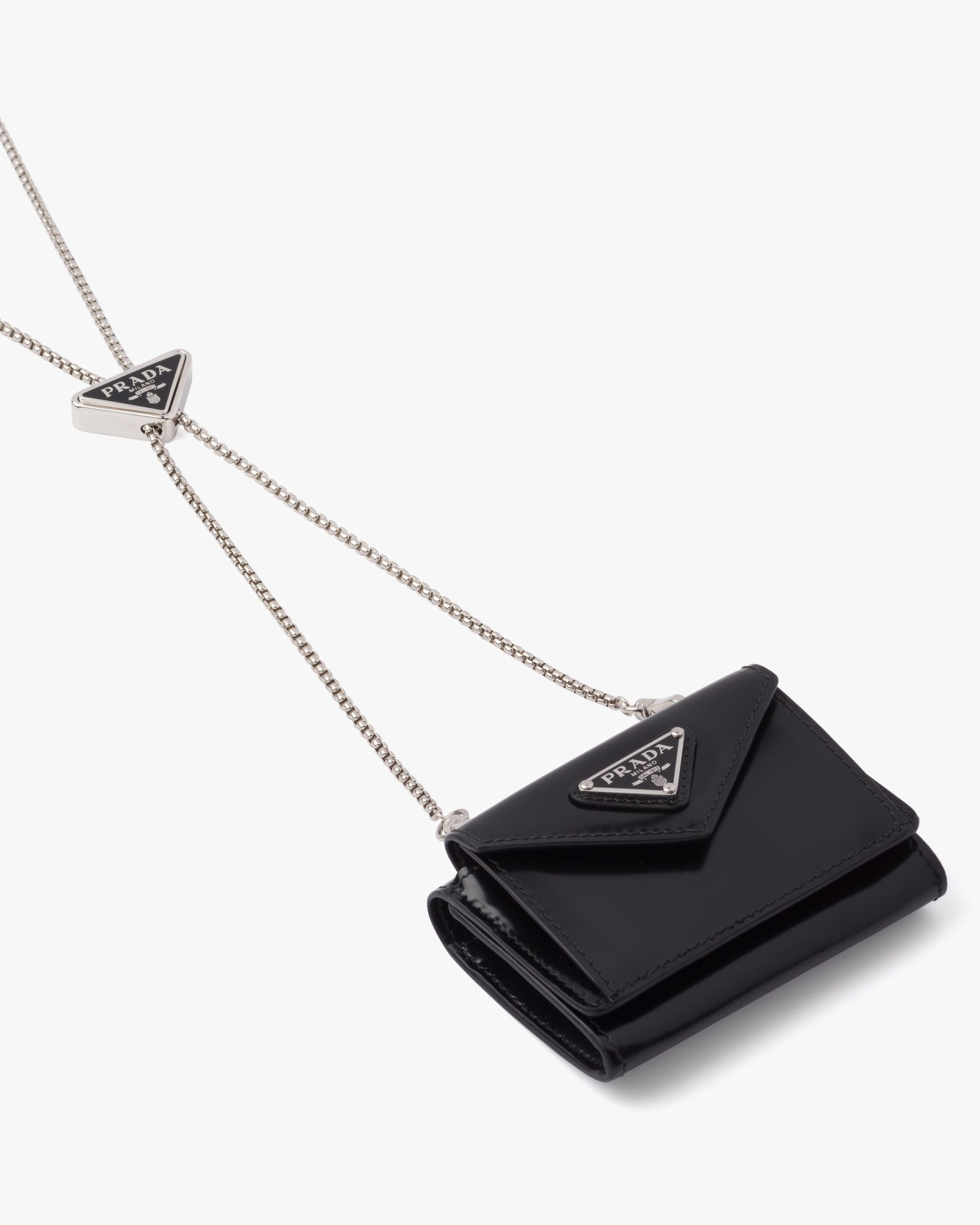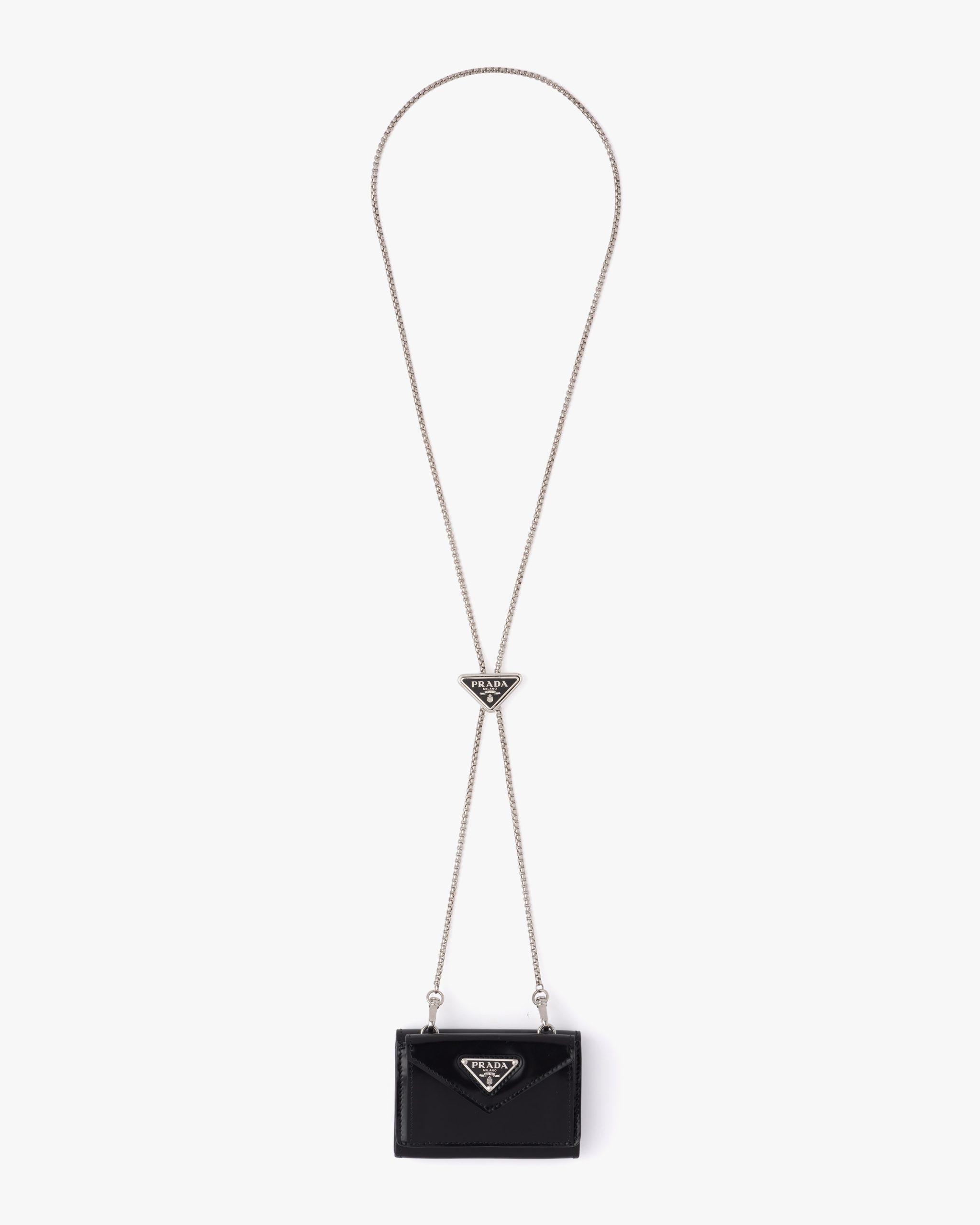 This refined and versatile card holder presents the historic enameled triangle logo on the envelope-style flap and as an ornament on the detachable chain. The accessory is made of brushed leather, an iconic material of the brand traditionally tied to the luxury world.