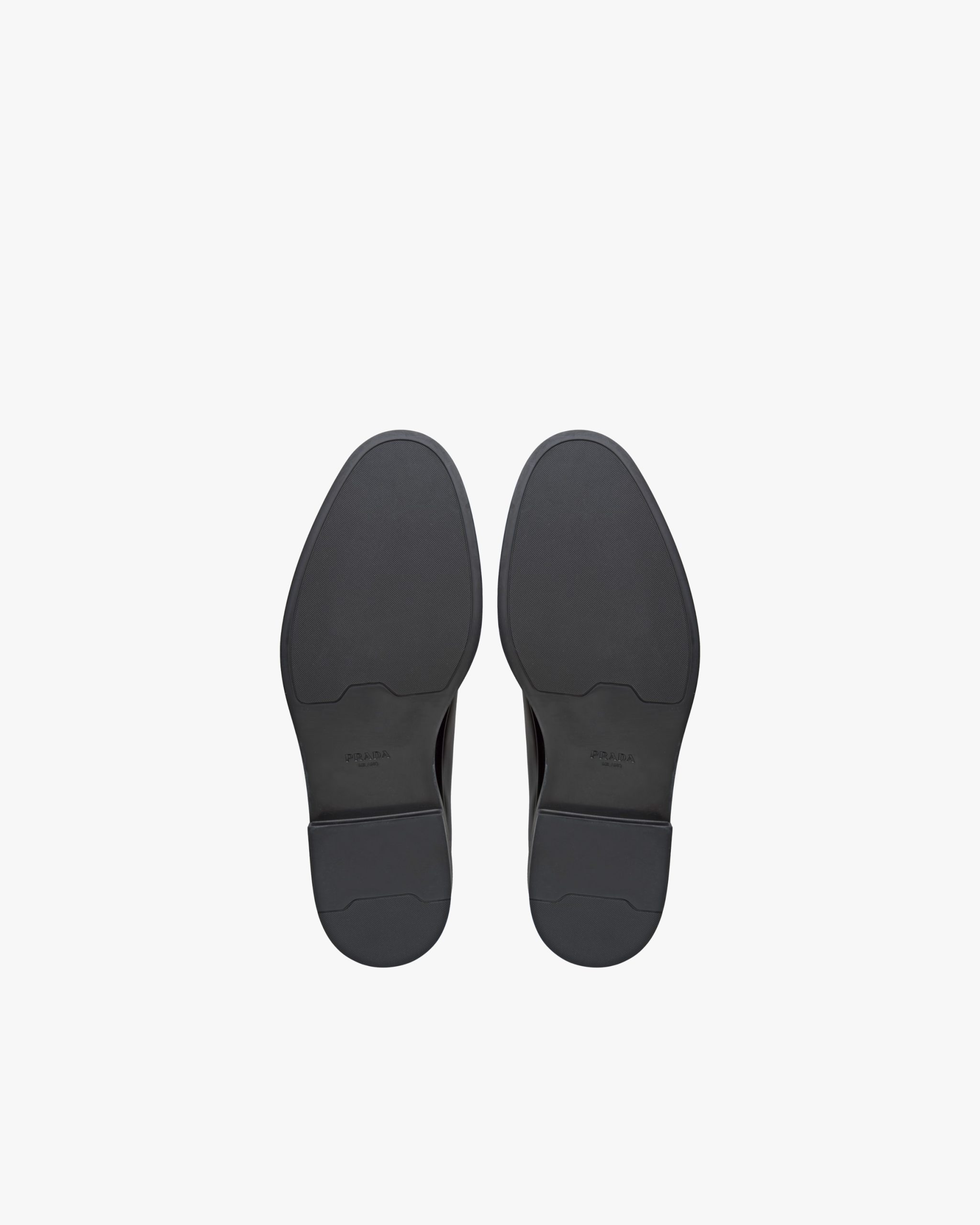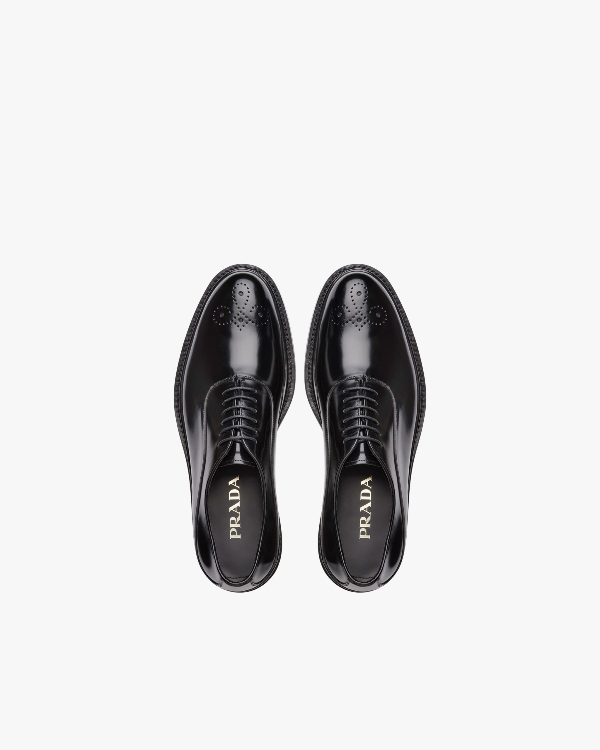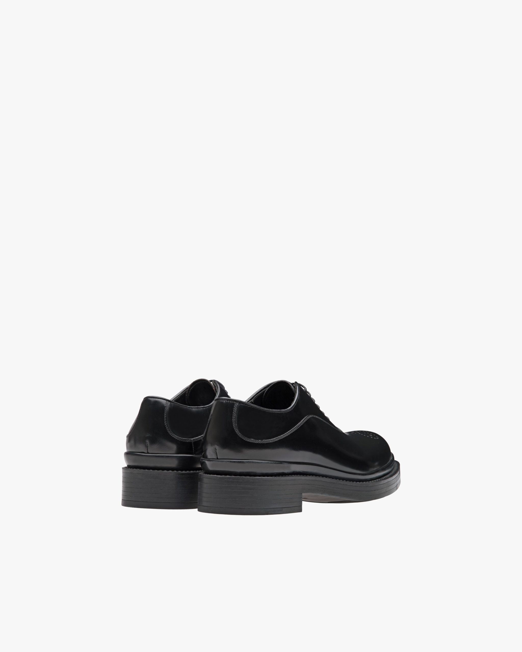 The shiny brushed calf leather accentuates the clean lines of these laced shoes. The perforated motif on the toe and rubber sole give these classic Oxford laced shoes a contemporary touch.