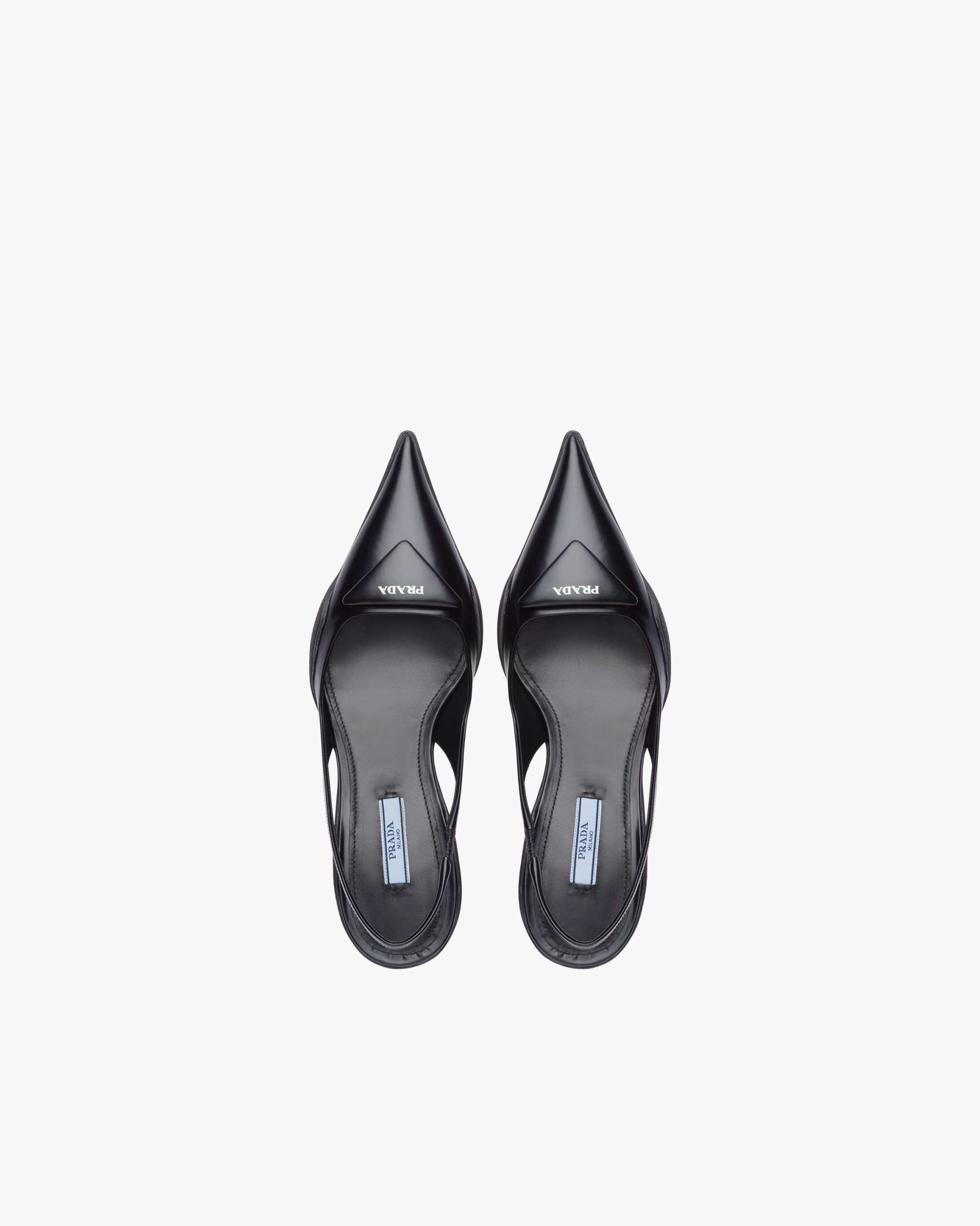 Revisiting a design from the Prada archives of the ’90s, the rubber shell sole envelops the upper of these brushed leather slingback pumps, creating a hybrid silhouette that blends a feminine pointy shape and sporty references. A distinctive element of the Spring Summer 2021 collectsion is the comma heel, inspired by styles from the same decade. New variations arrive for the iconic triangle, which turns into a slightly padded leather detail featuring the screen-printed Prada logo.