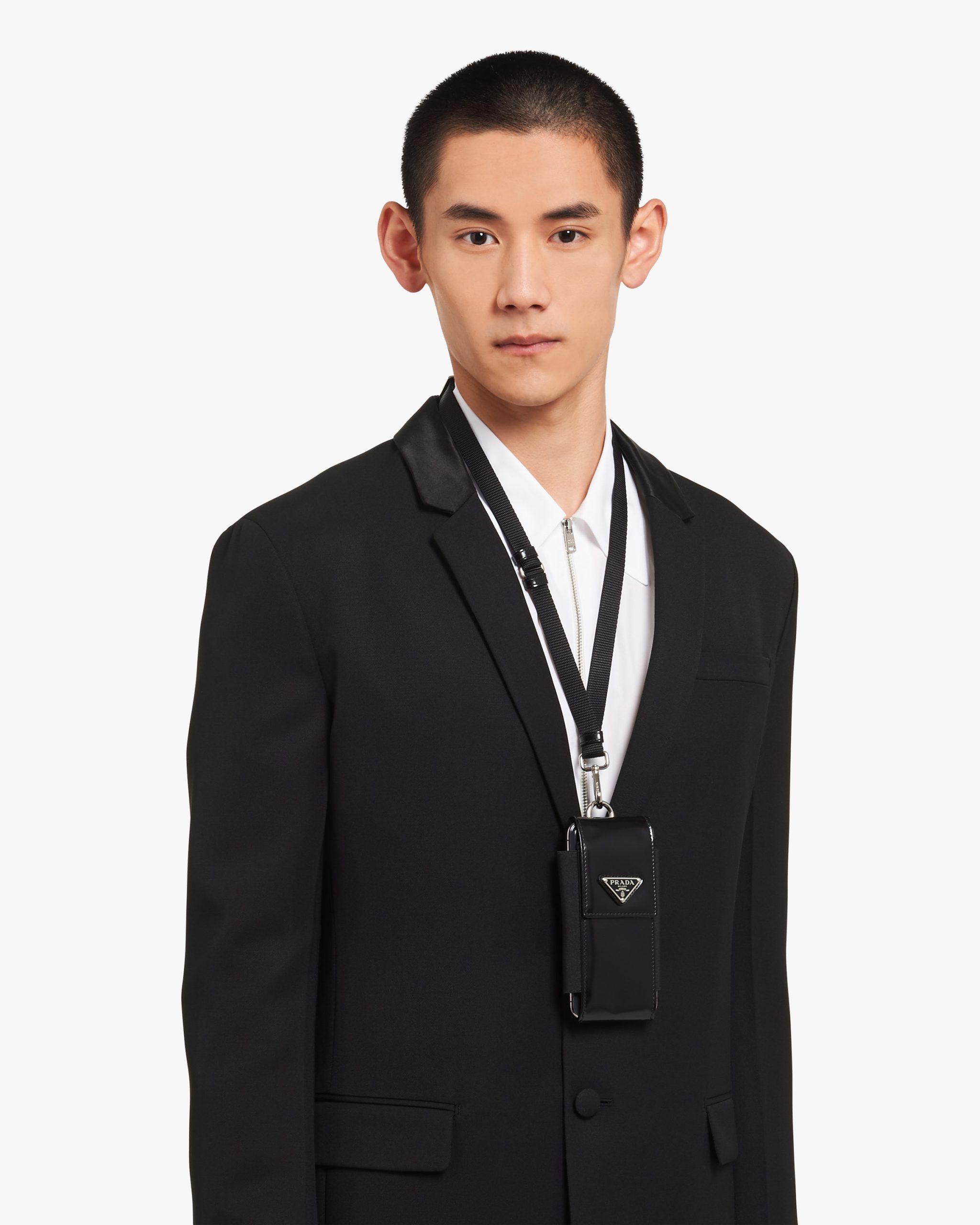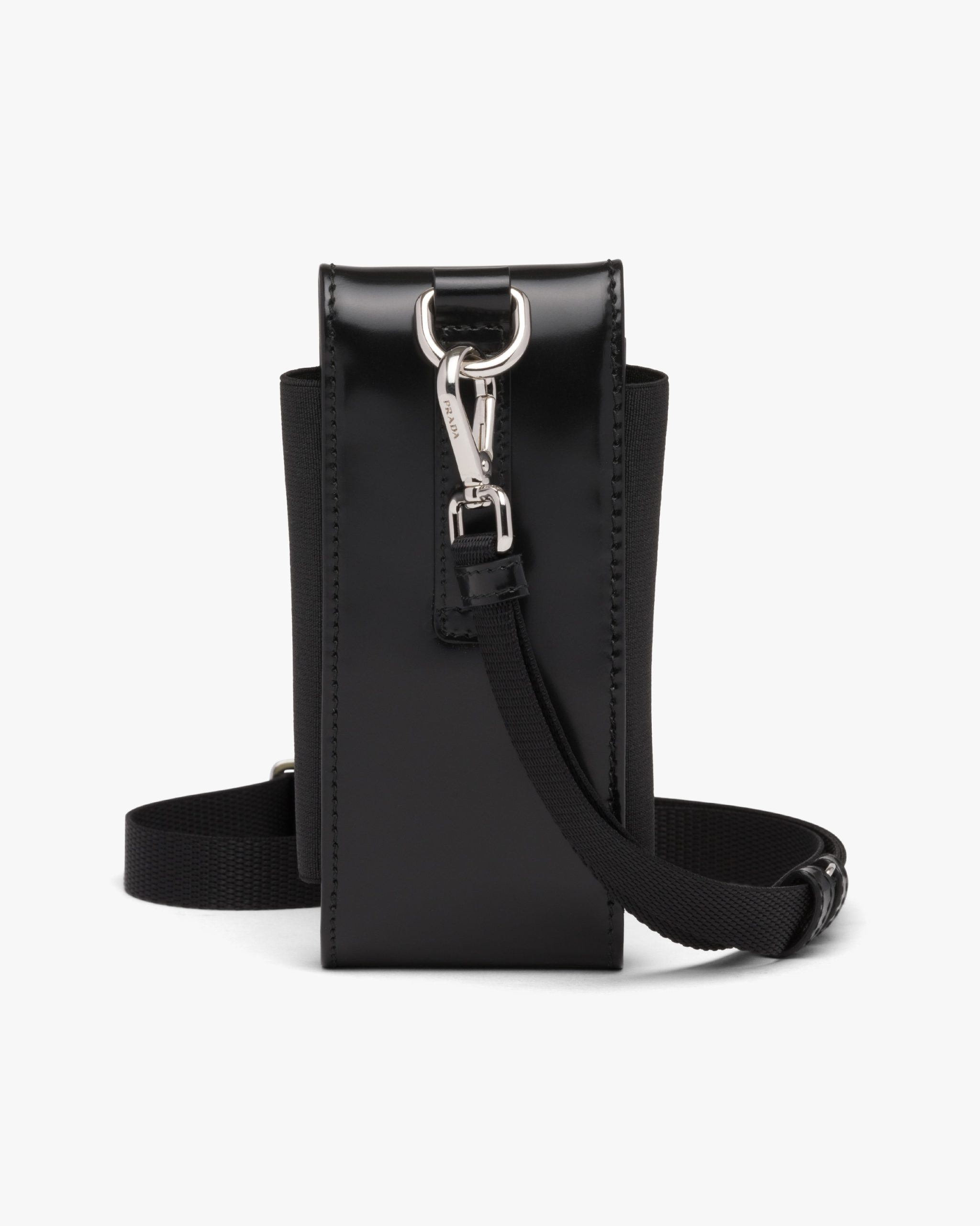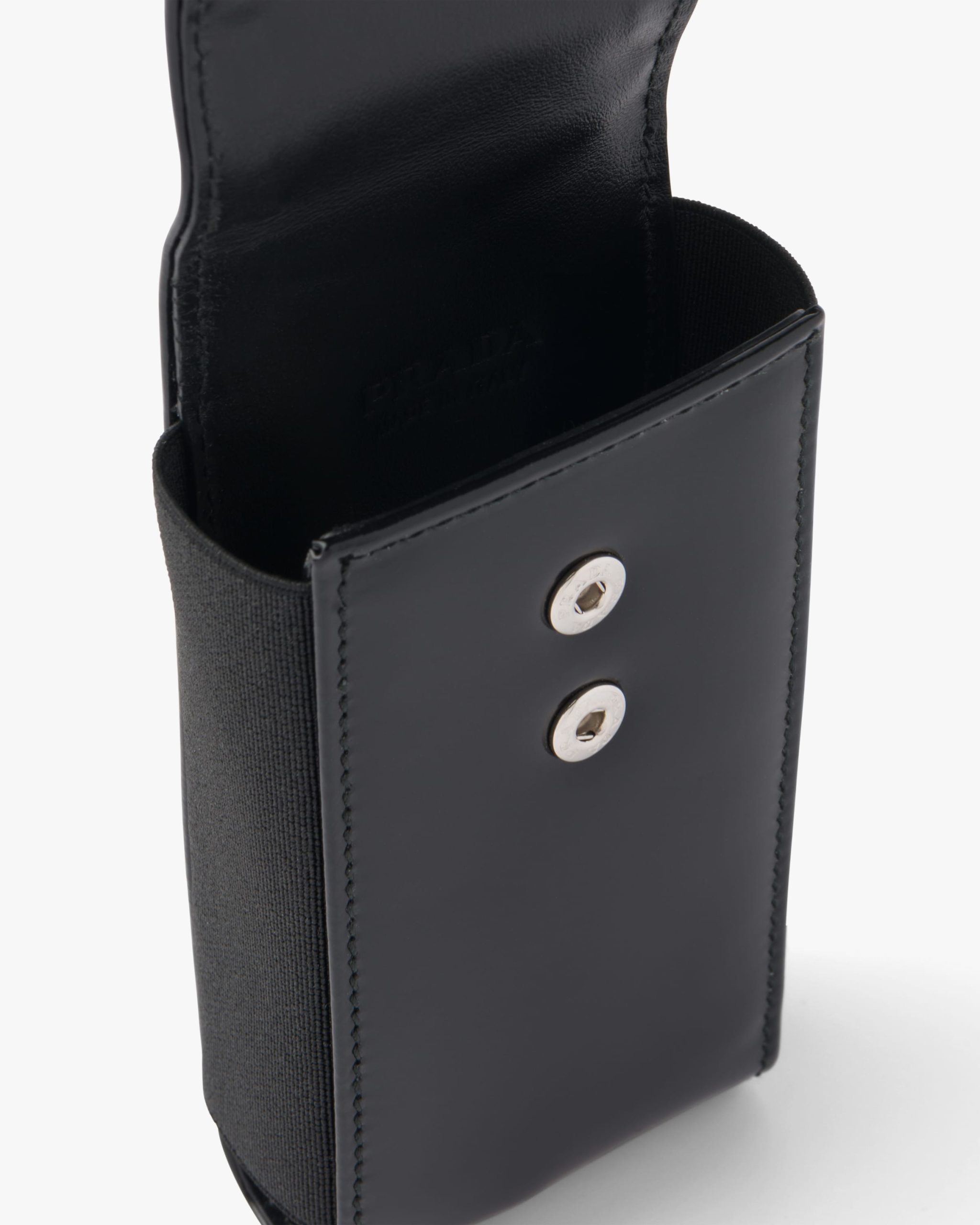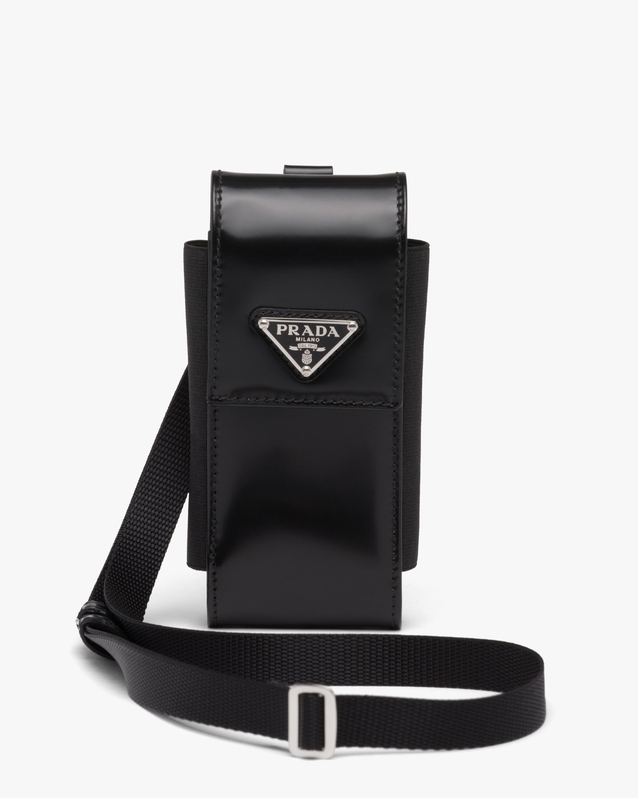 Technology, innovation and tradition come together in this smartphone case made of brushed leather: an iconic material of the brand since the ’90s and historically linked to the luxury world. The accessory is decorated with the enameled metal triangle logo.