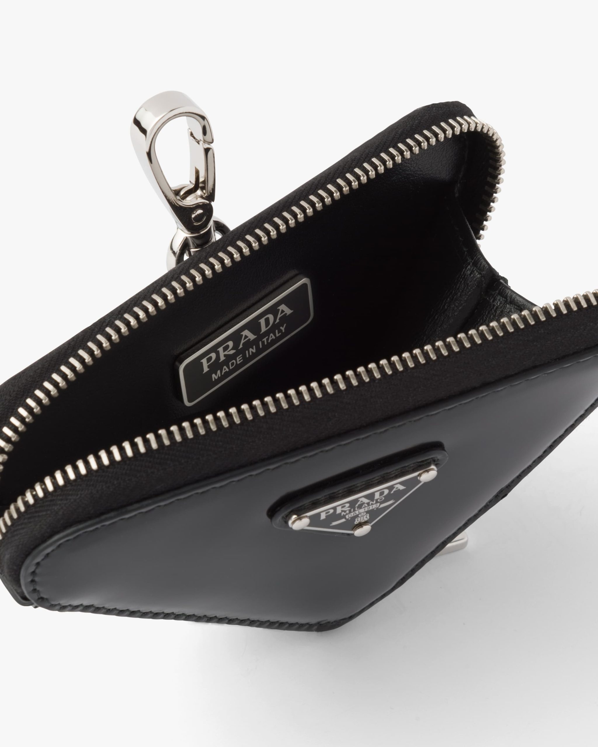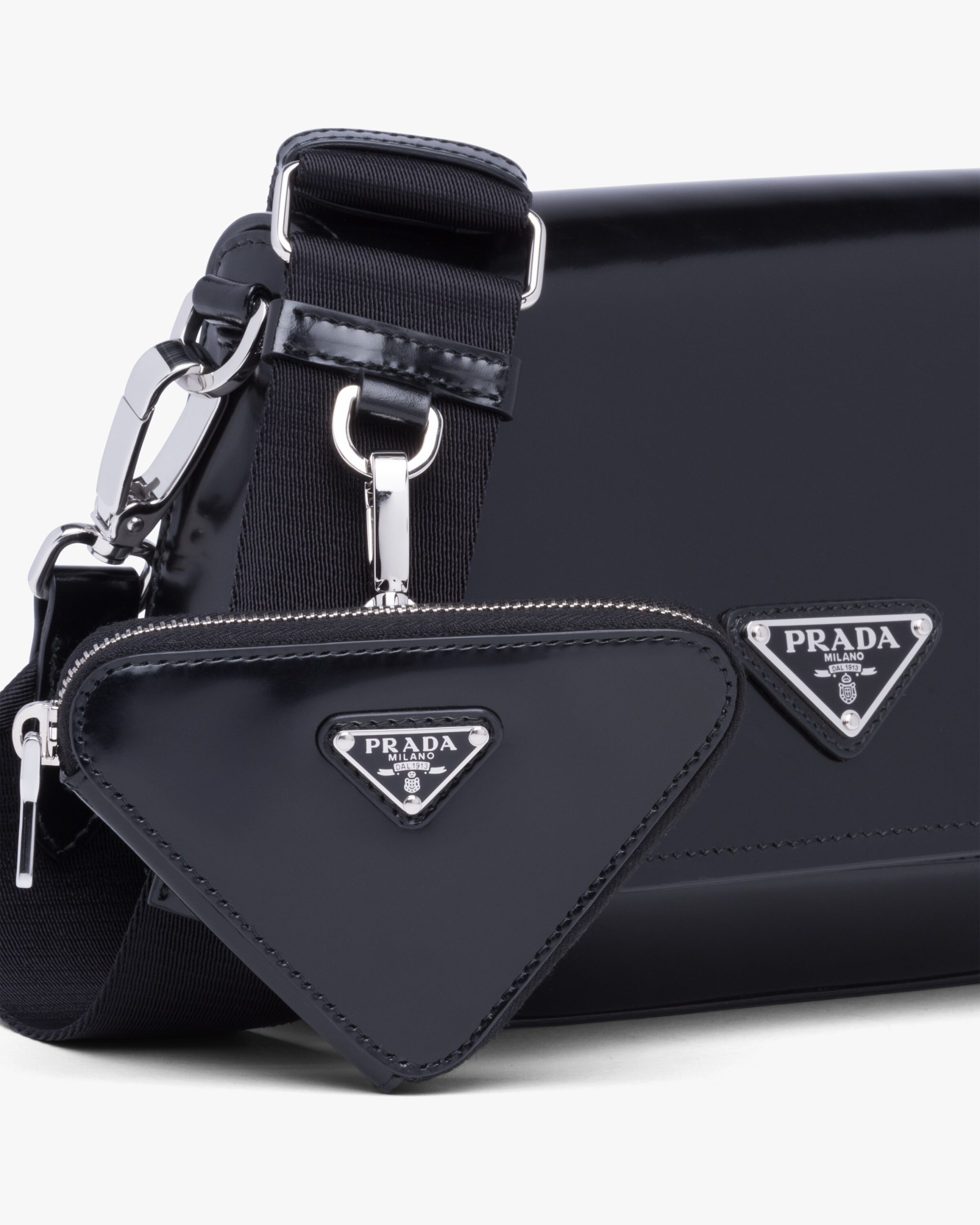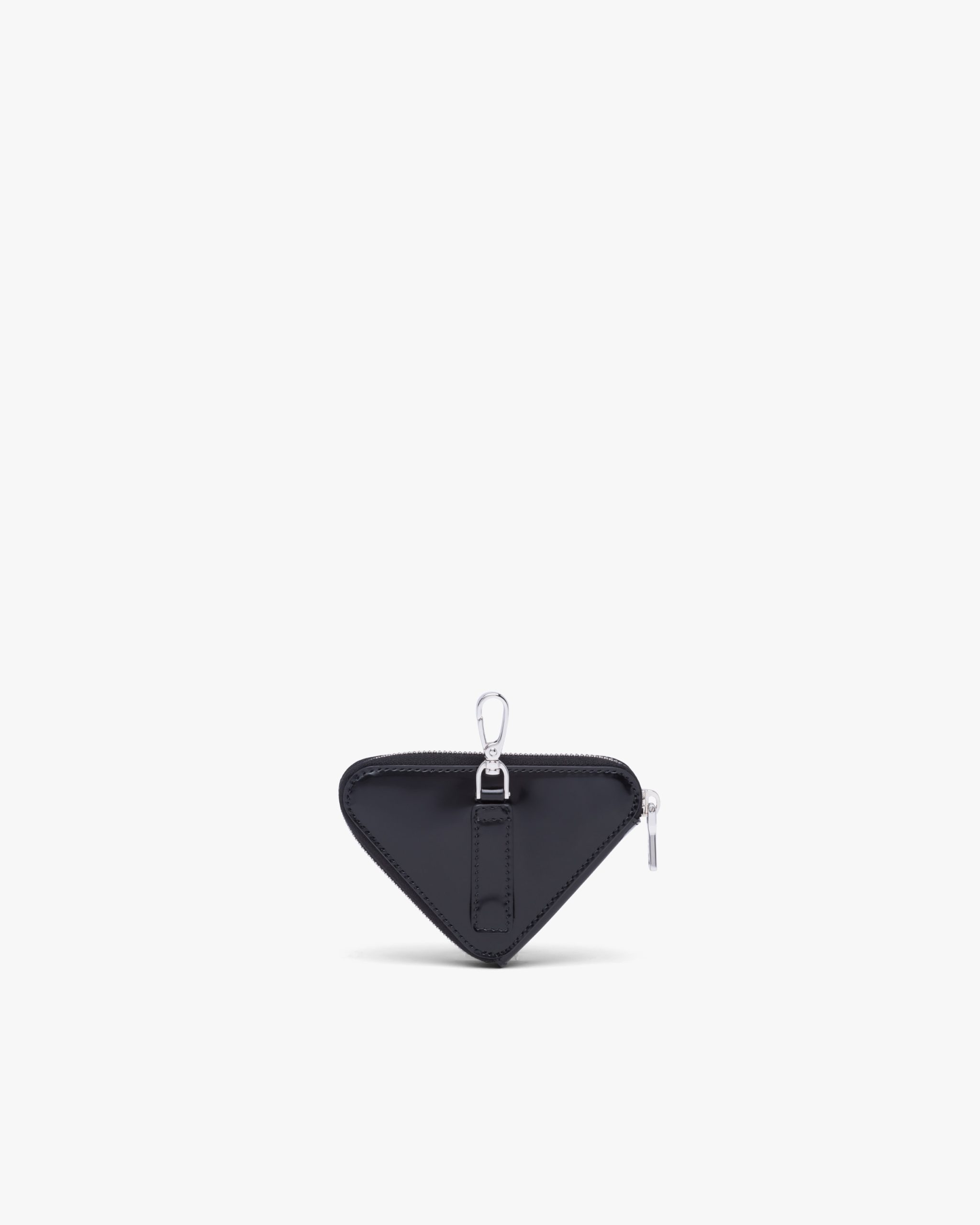 This triangle-shaped mini pouch is made from brushed leather, an exquisite and classic material that Prada has been reinterpreting in unusual designs since the nineties, creating a hybrid result that reflects the dual nature of the brand. The enameled metal triangle logo adorns the accessory.