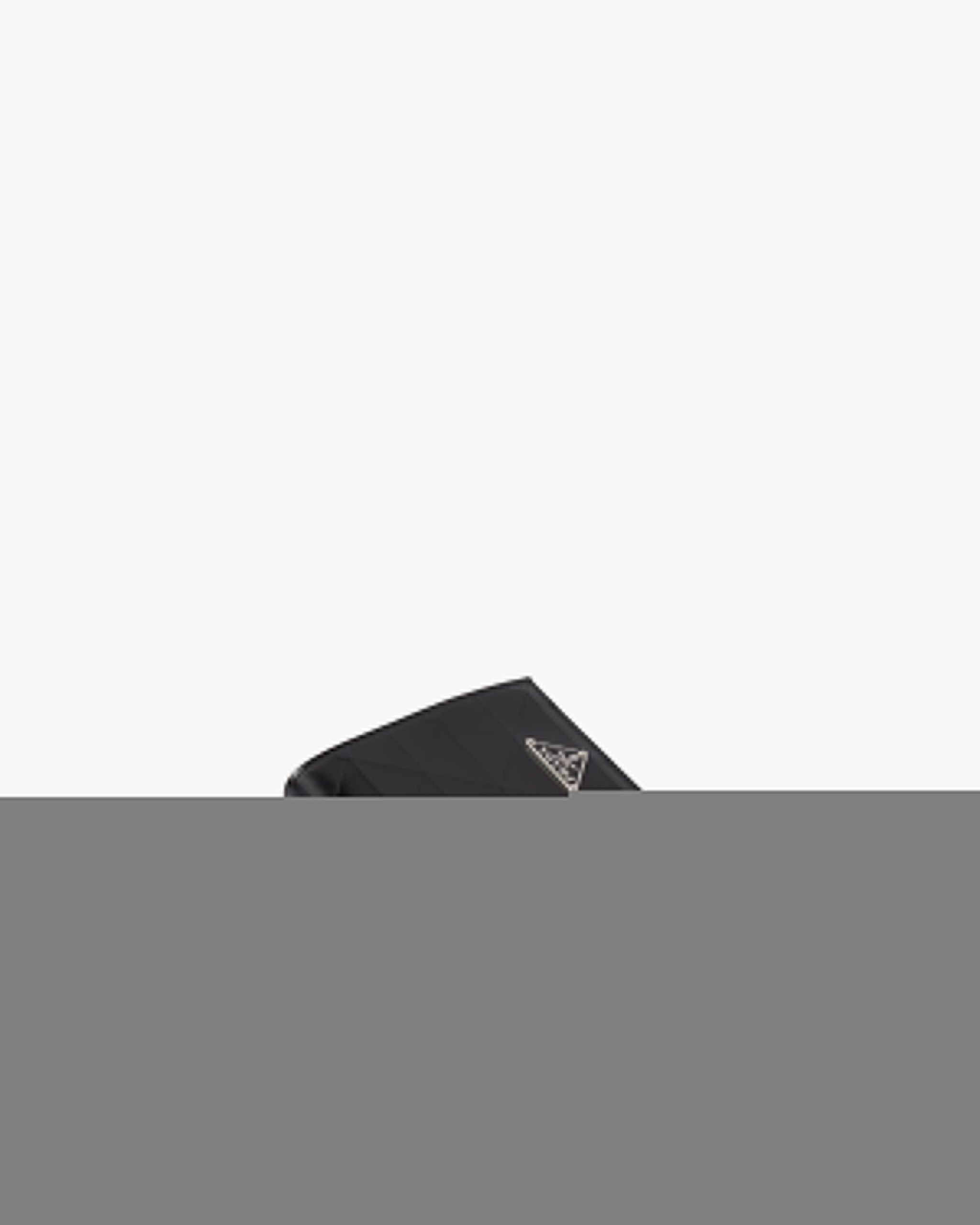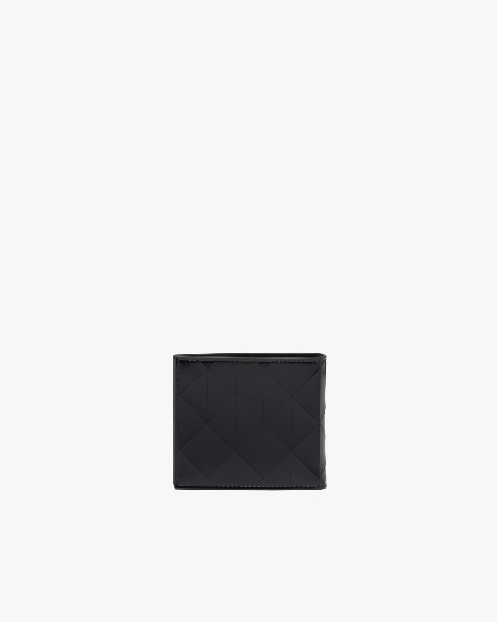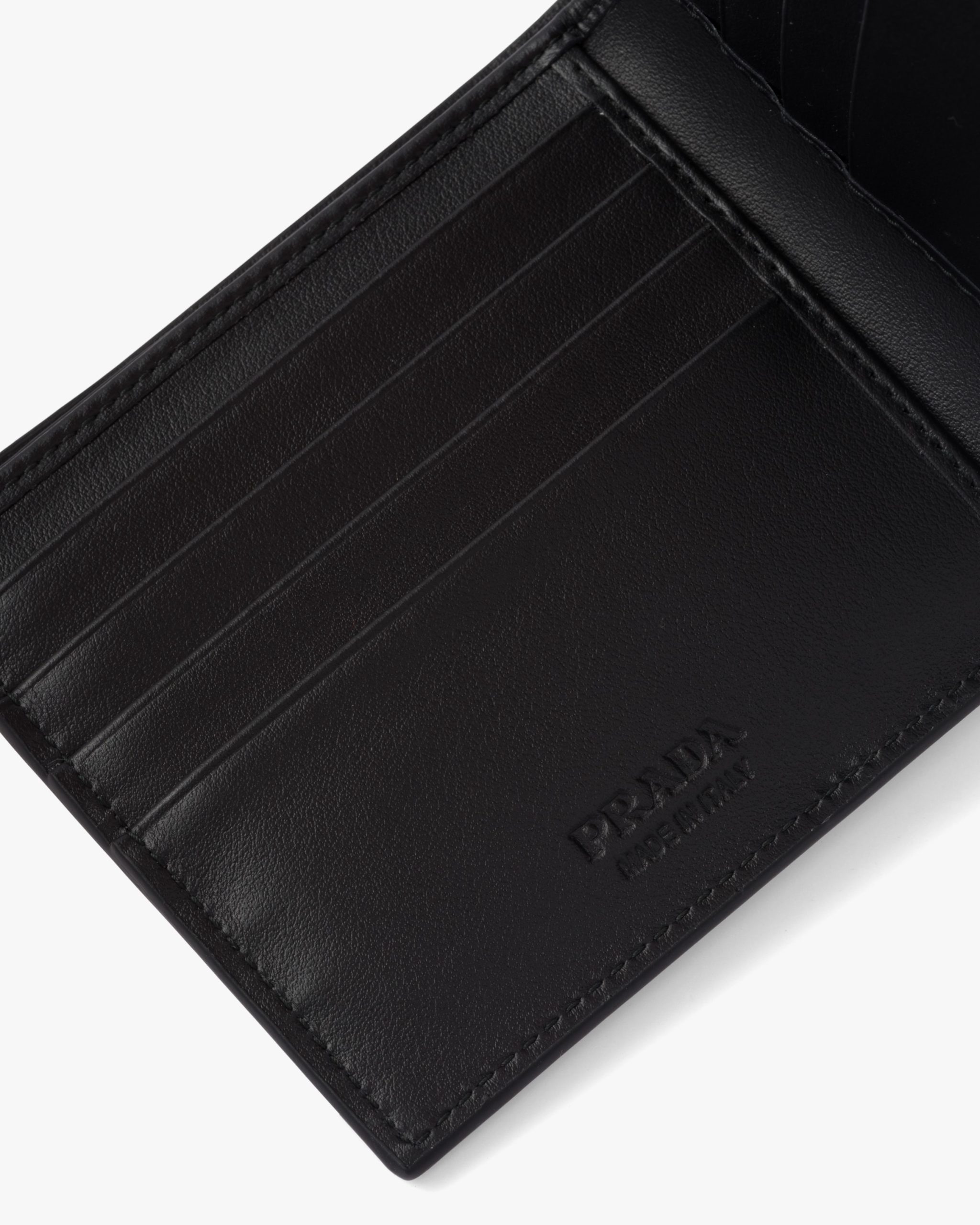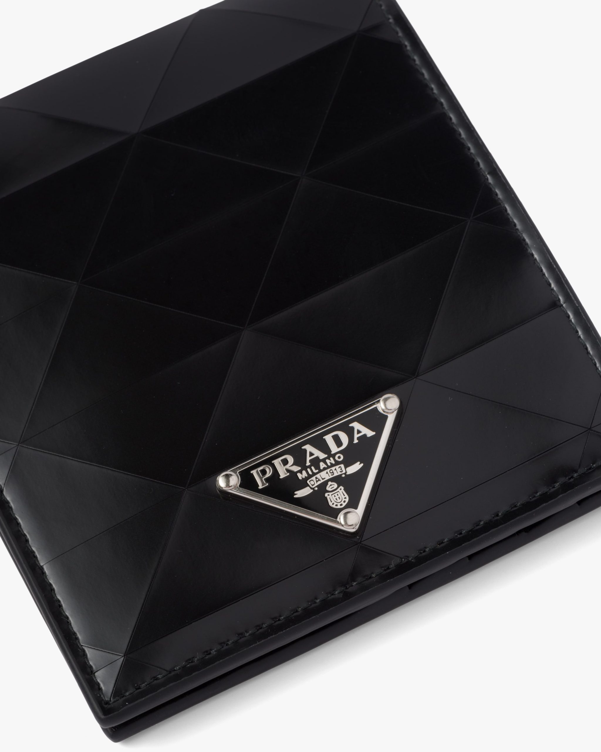 This refined, modern wallet is characterized by the geometric pattern that emphasizes the leather with a brushed finish, an elegant material of quality emblematic of Prada since the nineties. The accessory is decorated with the iconic enameled metal triangle logo.