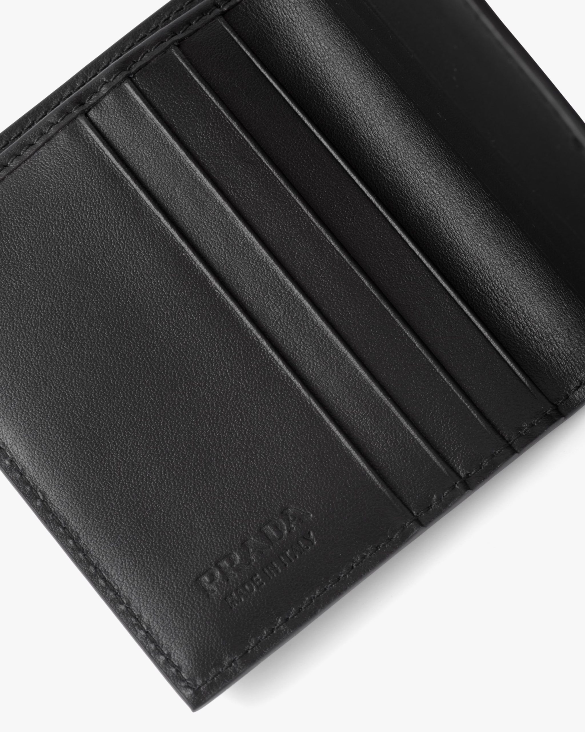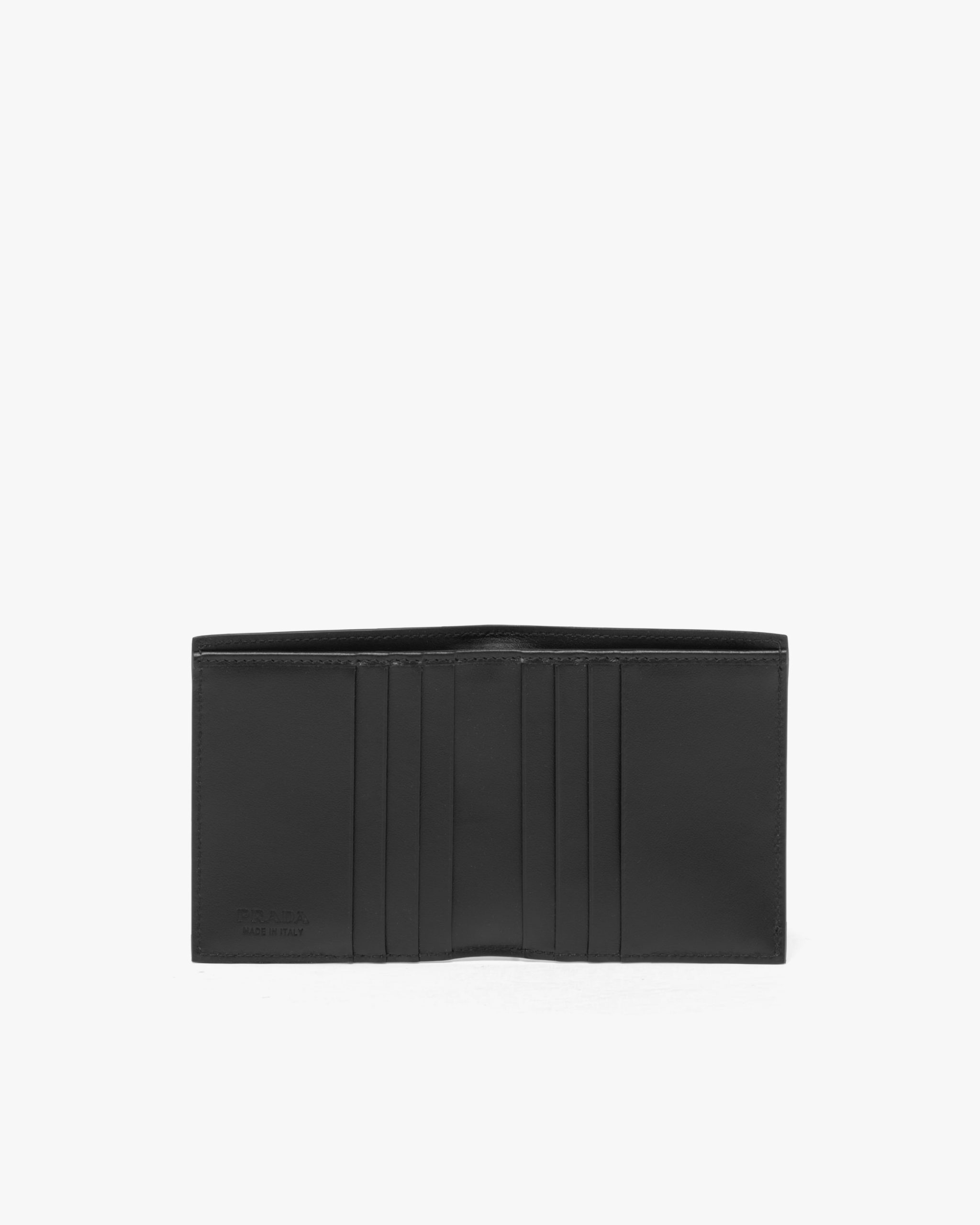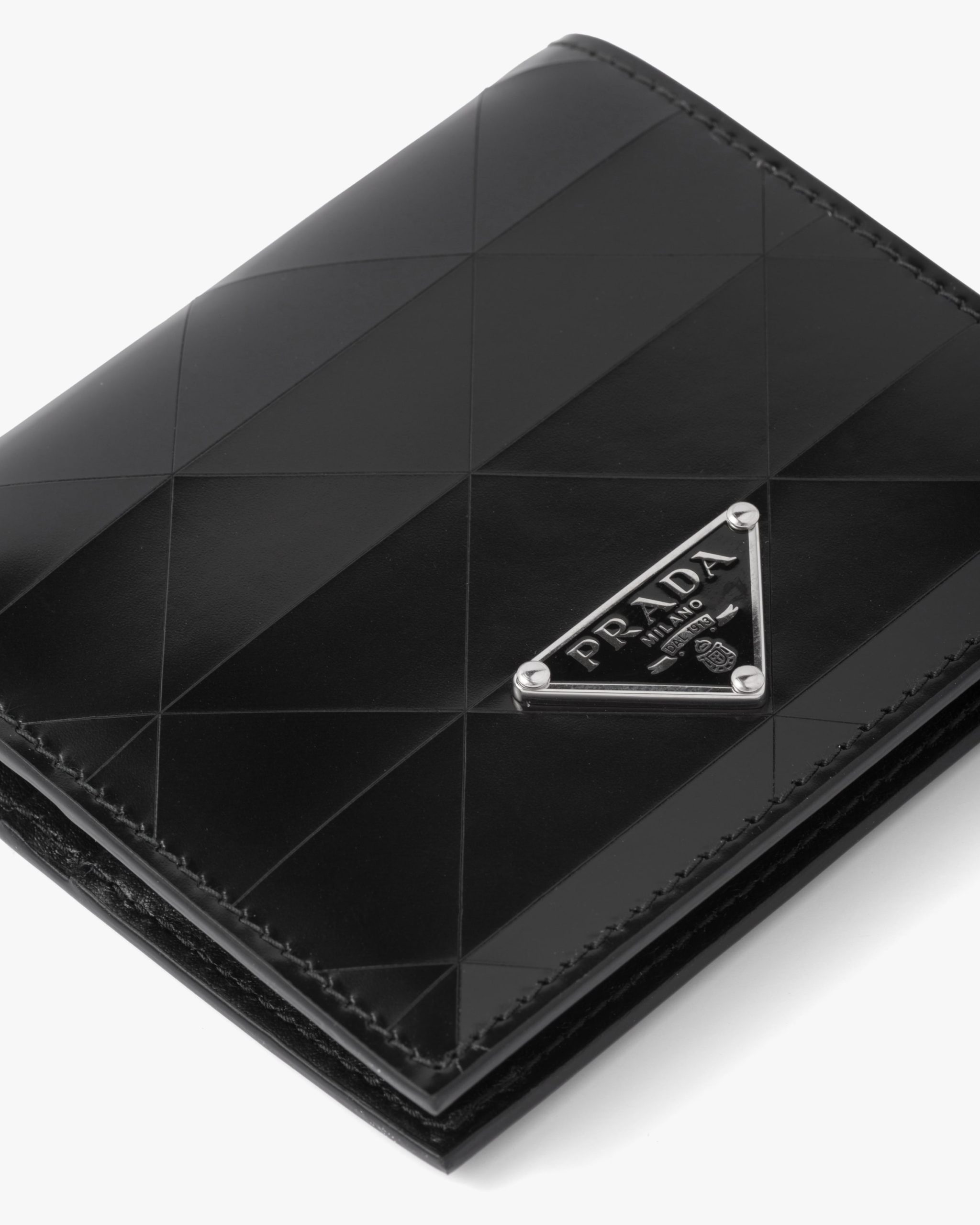 The compact, versatile design of this wallet is enhanced by an elegant interpretation of the iconic triangle that creates an original motif, accentuating the lustrous finish of the material. The enameled metal triangle logo decorates the accessory.