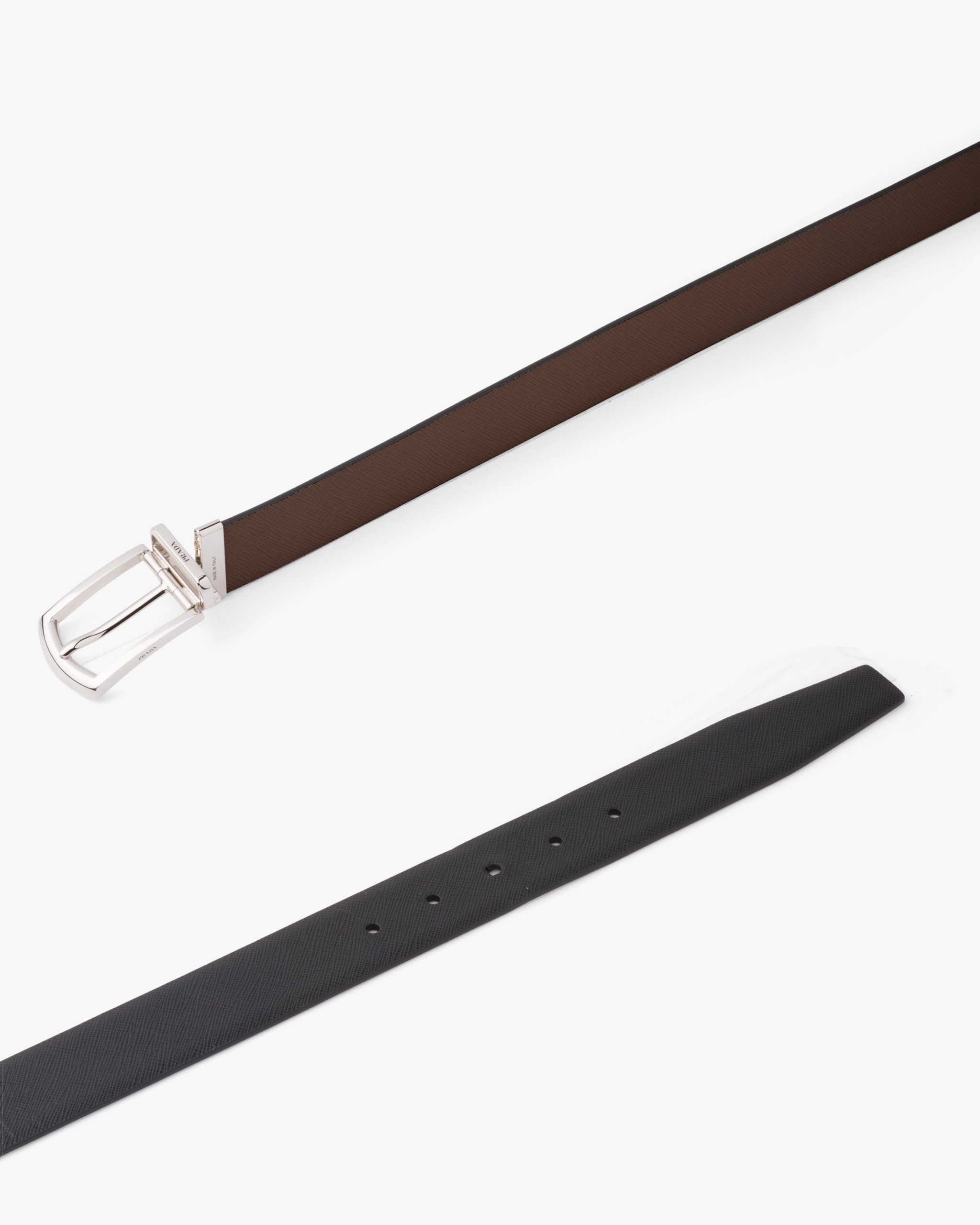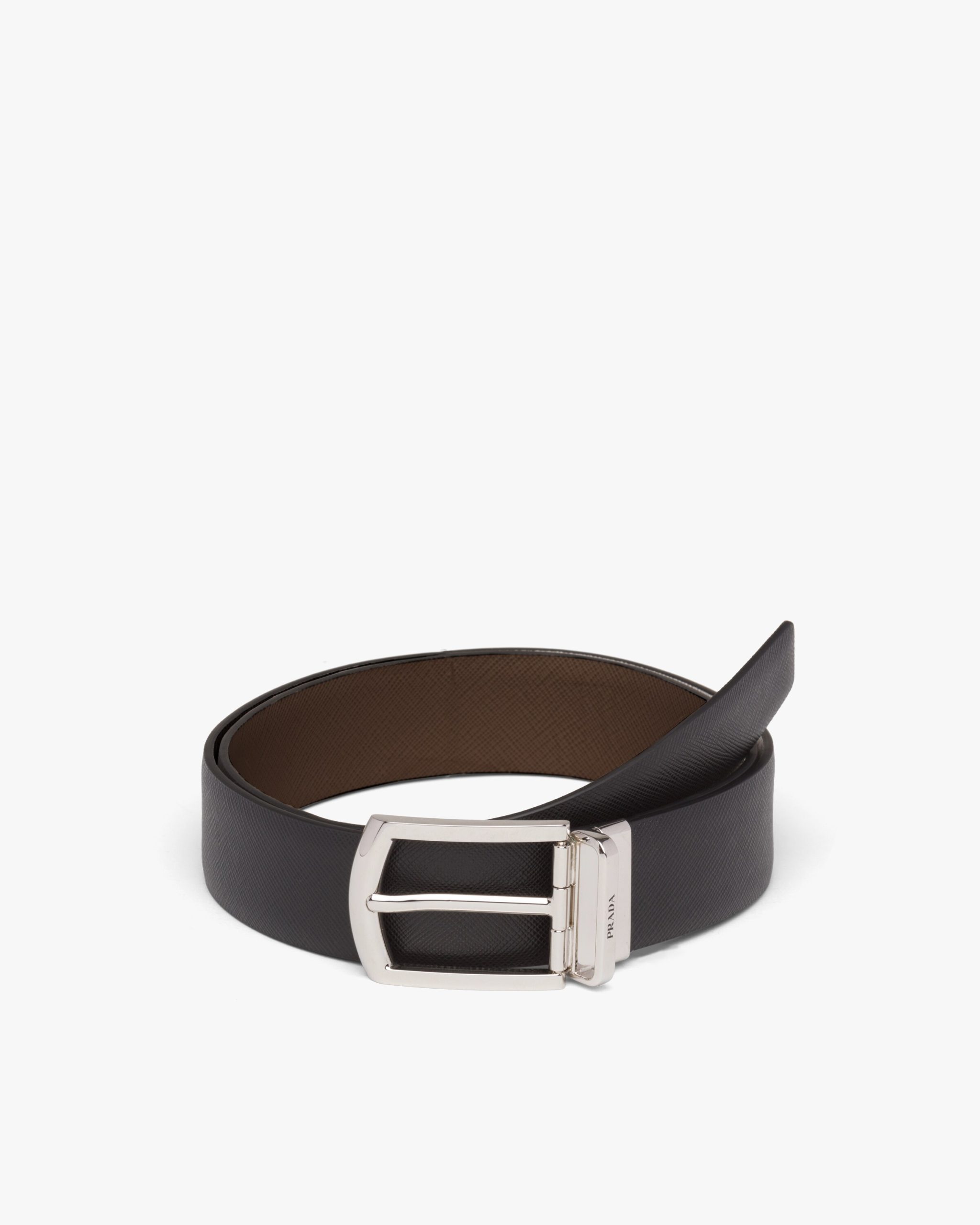 This fine Saffiano leather belt characterized by its reversible design has an elegant metal buckle.
