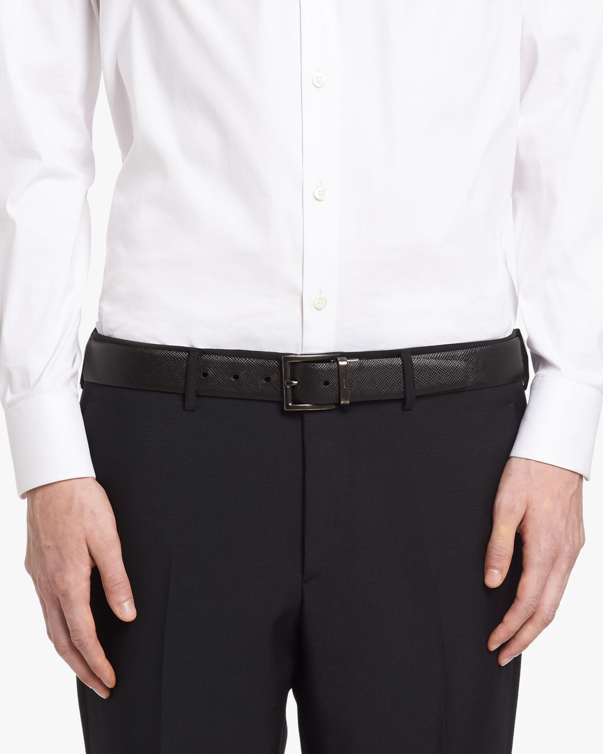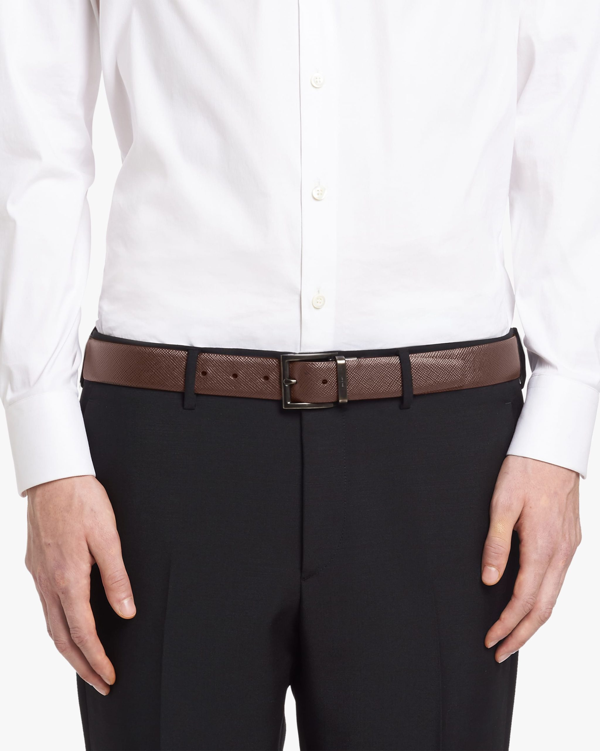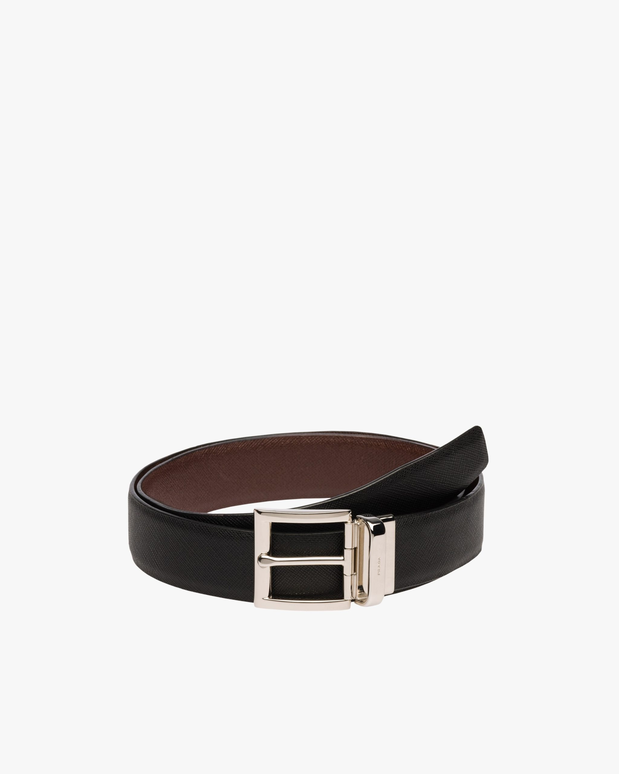 With a different shade on the reverse side, this 3.3cm belt can be reversed to match different outfits. The polished steel buckle is branded with the Prada logo.