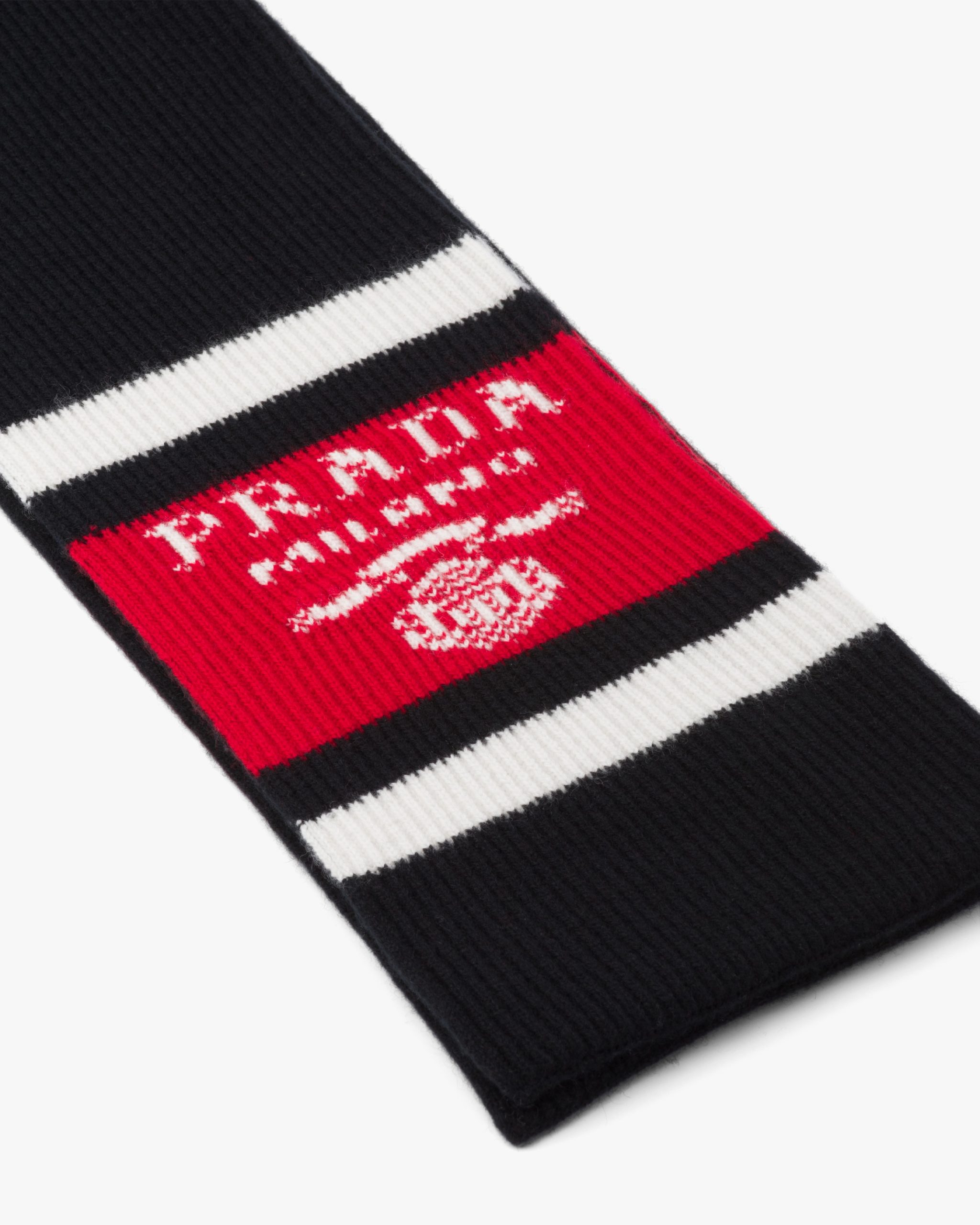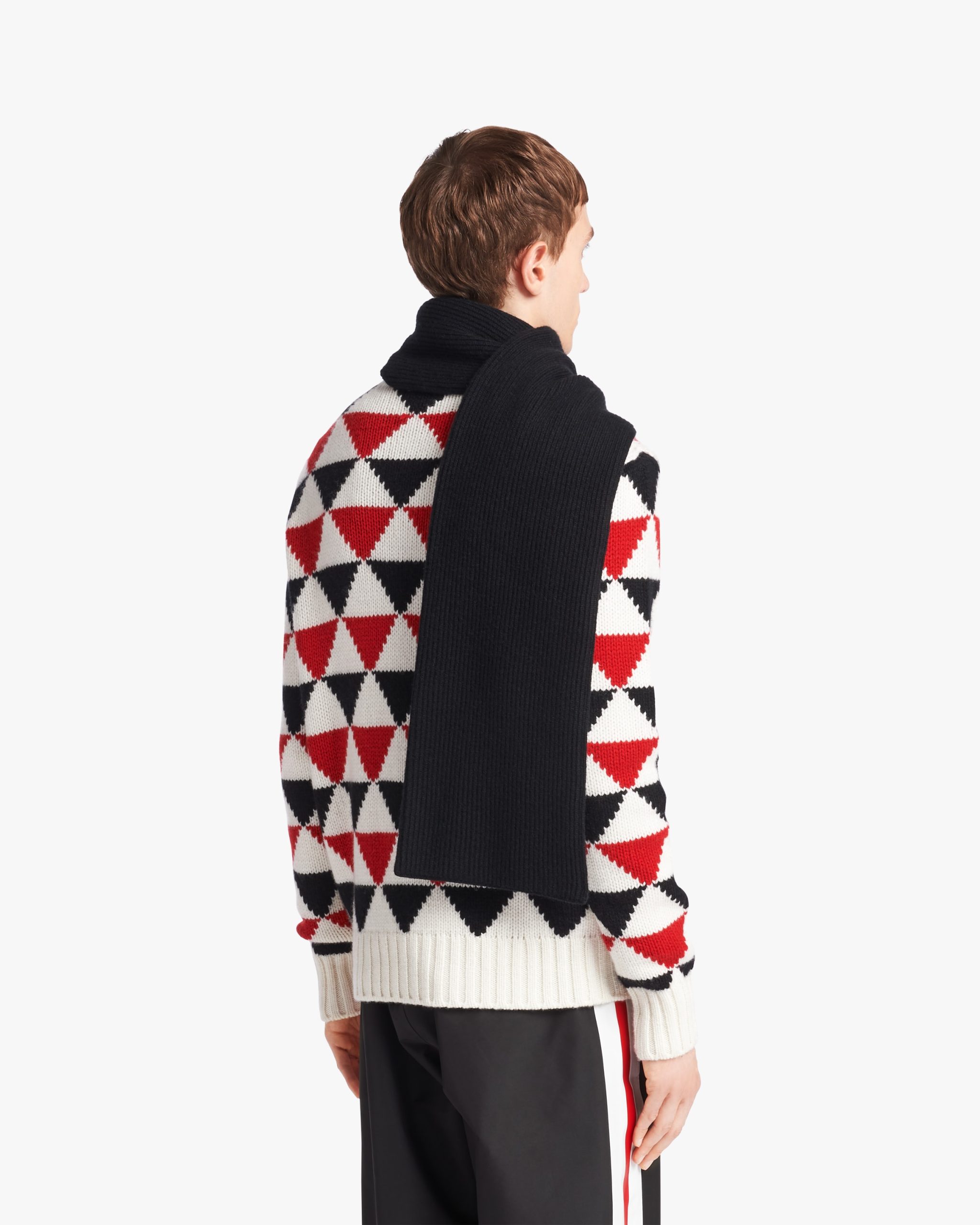 This sporty yet refined scarf is made of soft, fine cashmere. The accessory that recalls a vintage design of an alpine wardrobe is decorated with the jacquard lettering logo.