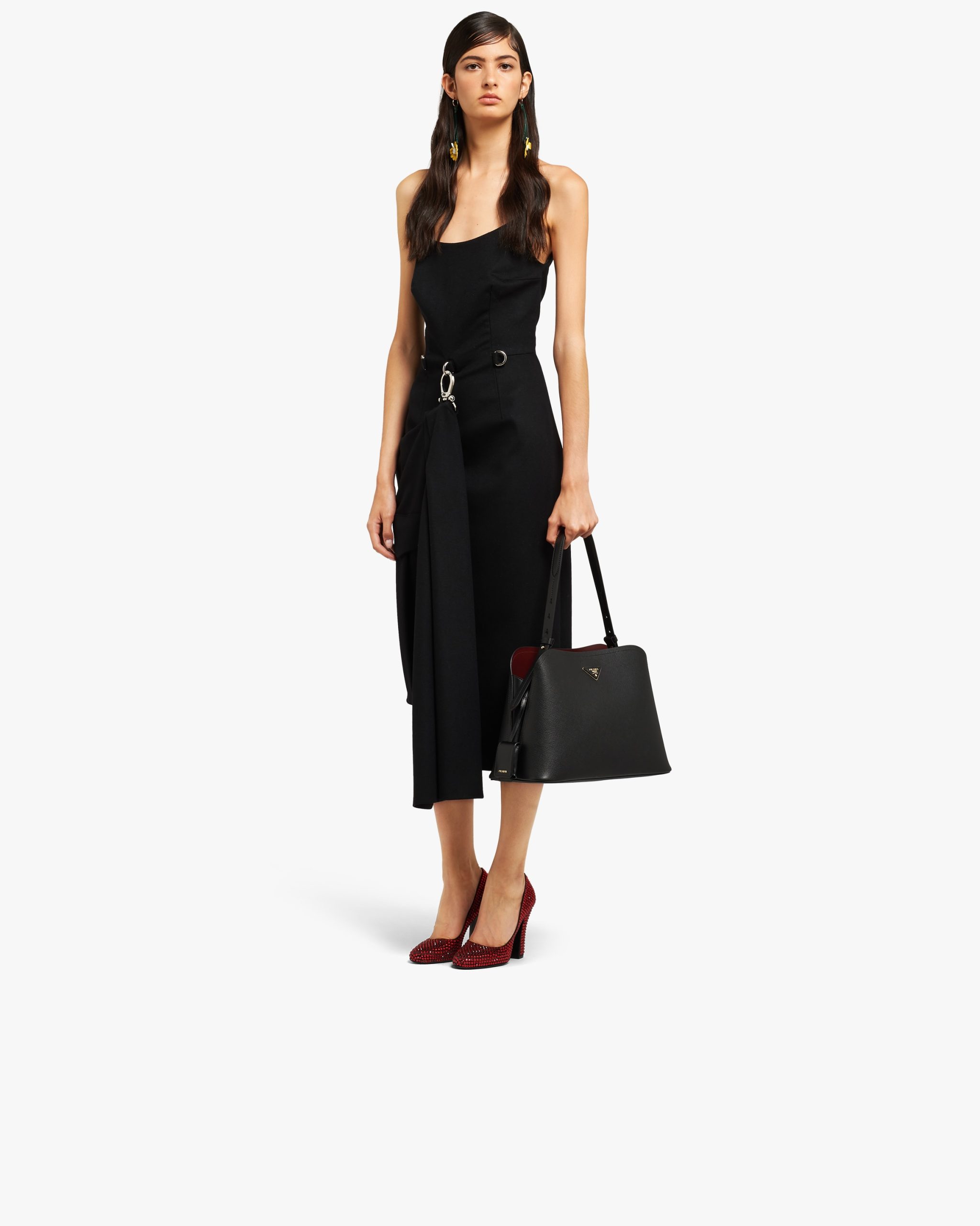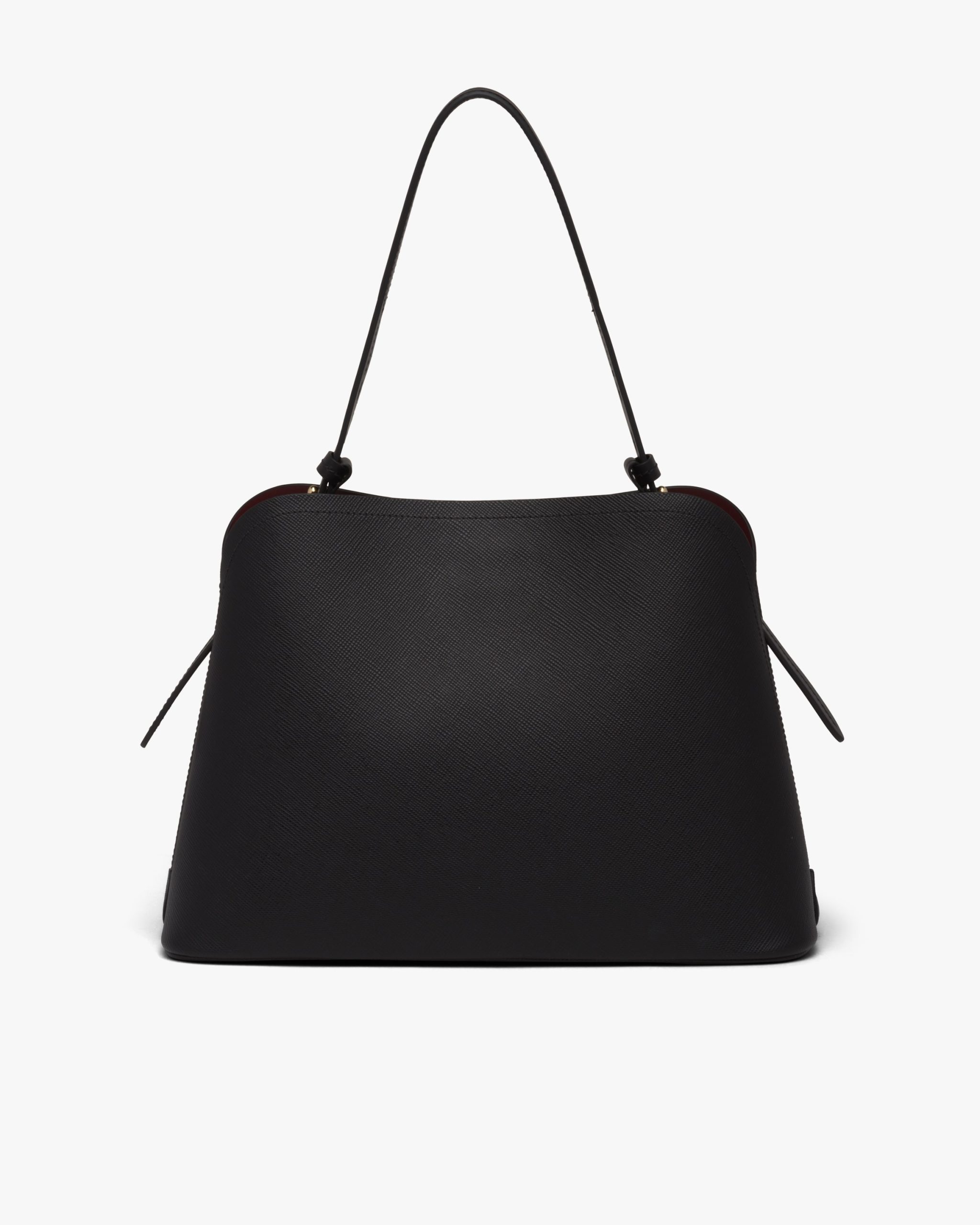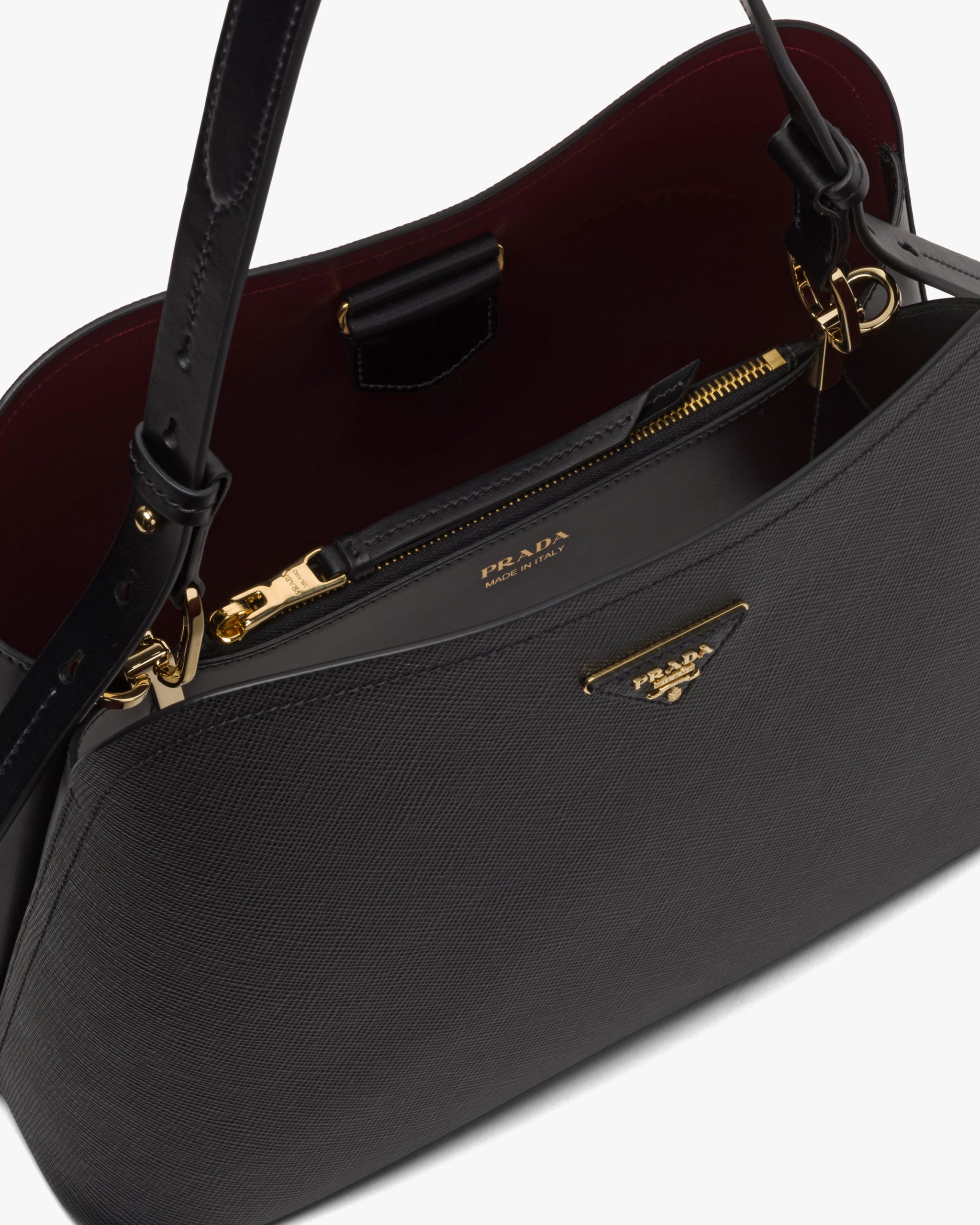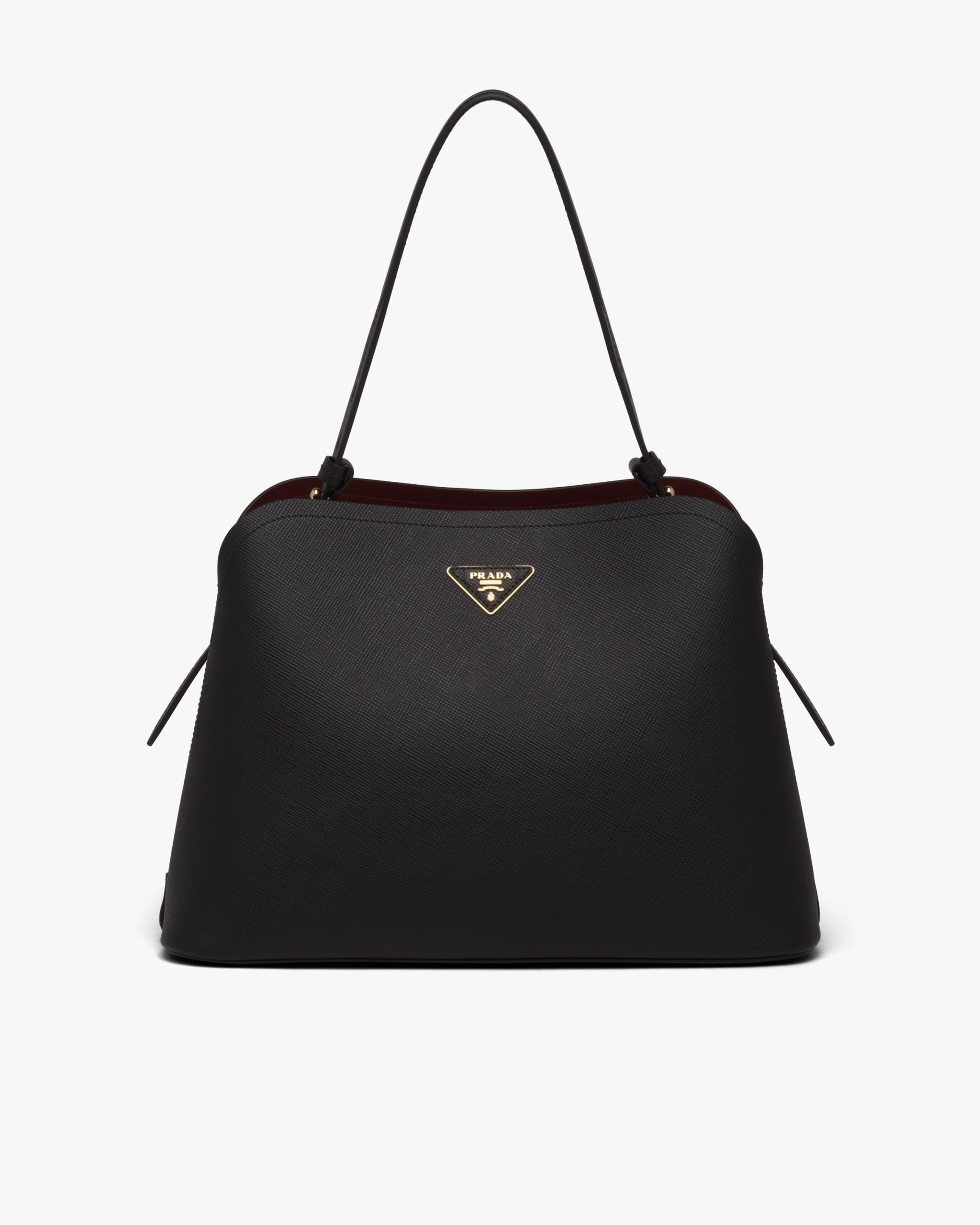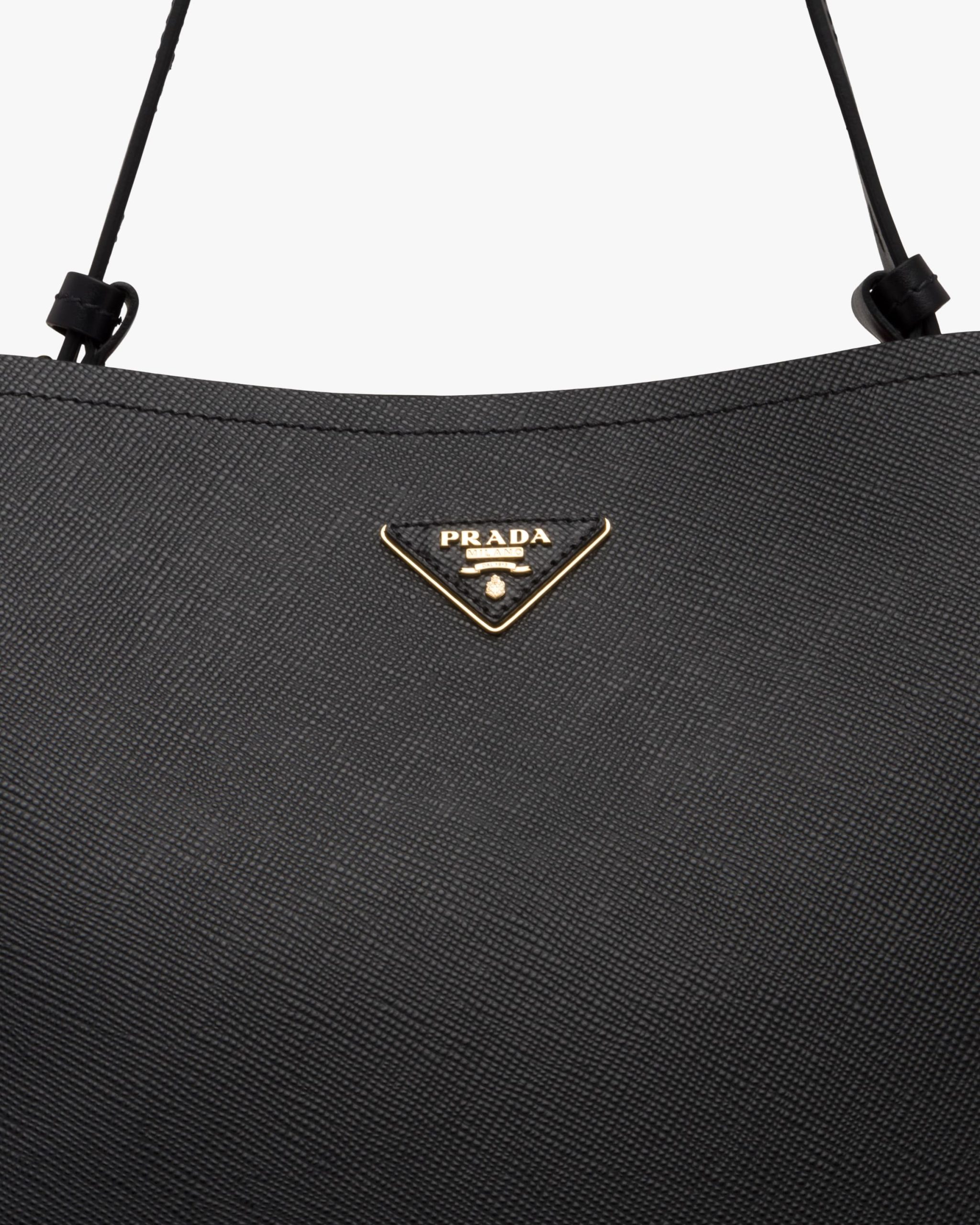 The Prada Matin?e handbag made of Saffiano leather stands out for its metal triangle logo and detachable adjustable leather shoulder strap.