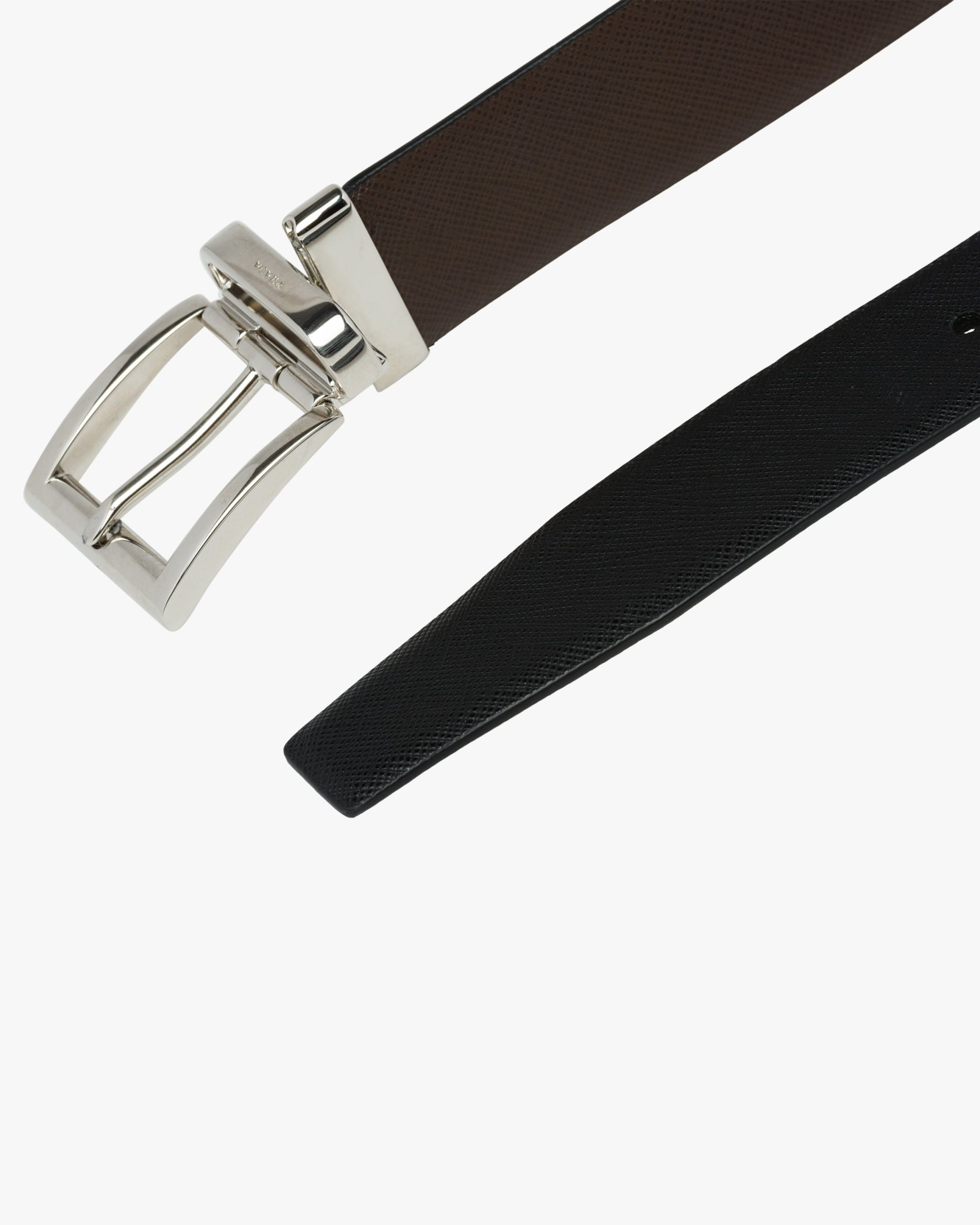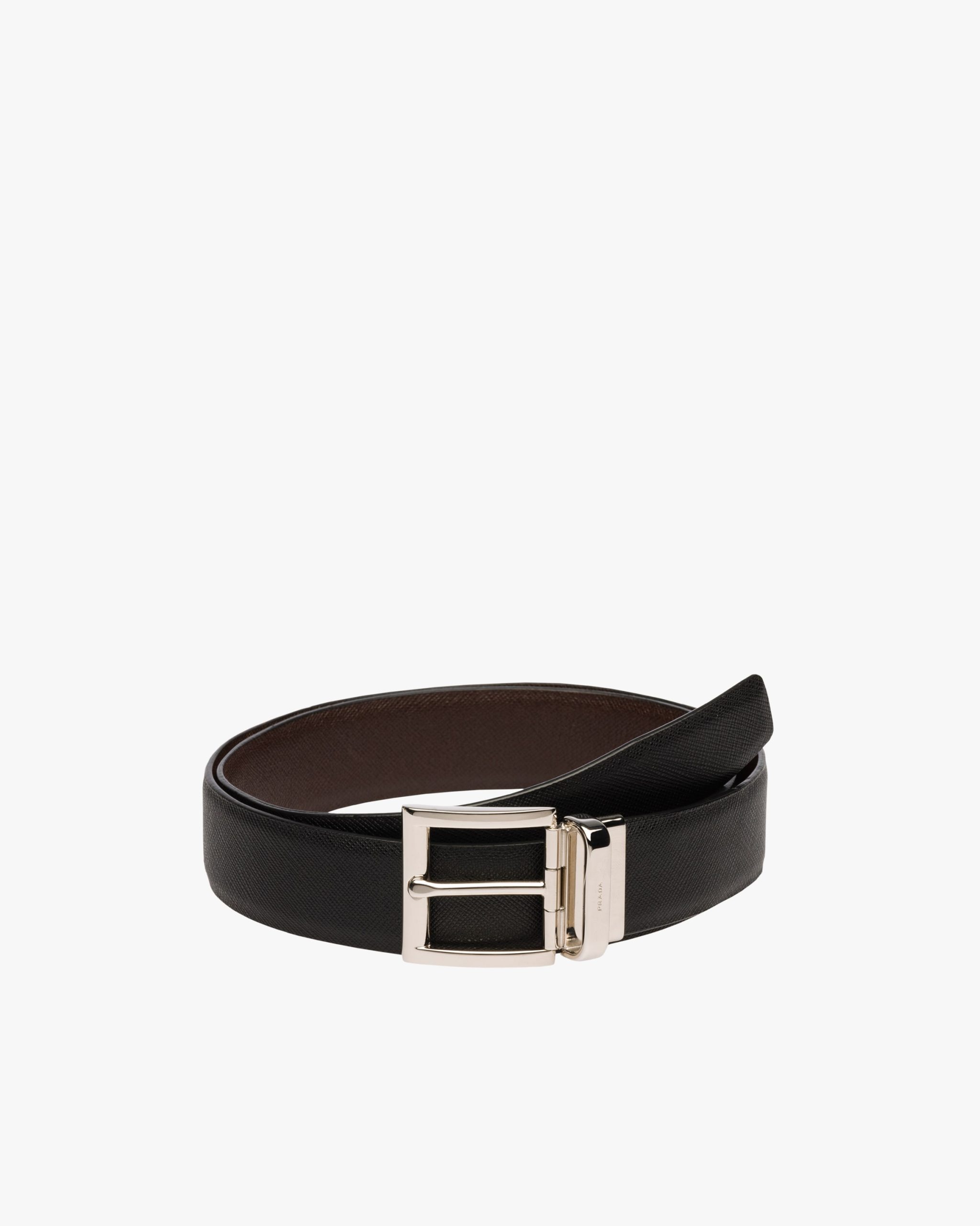 With a different shade on the reverse side, this 3.3cm belt can be reversed to match different outfits. The polished steel buckle is branded with the Prada logo.