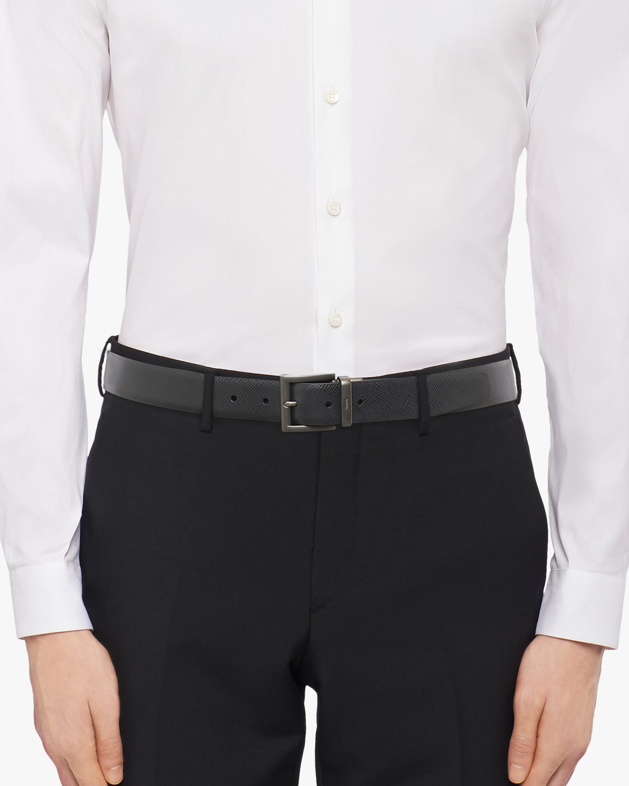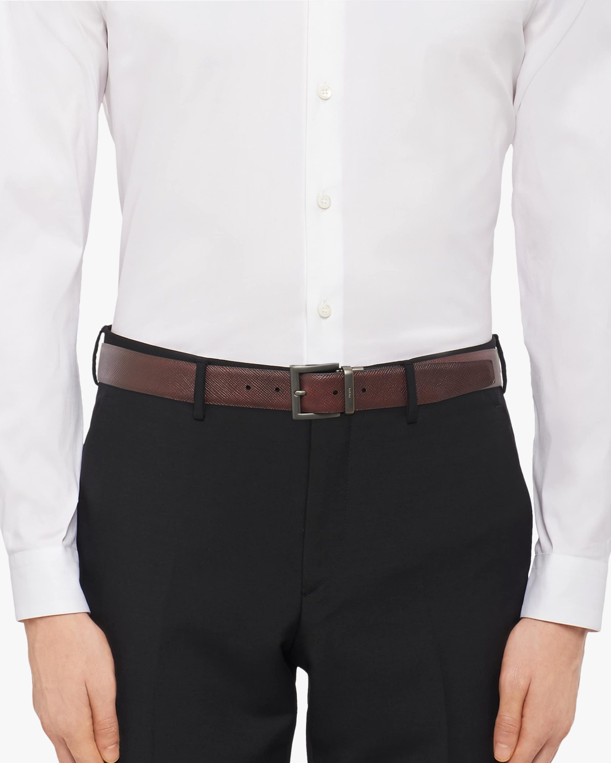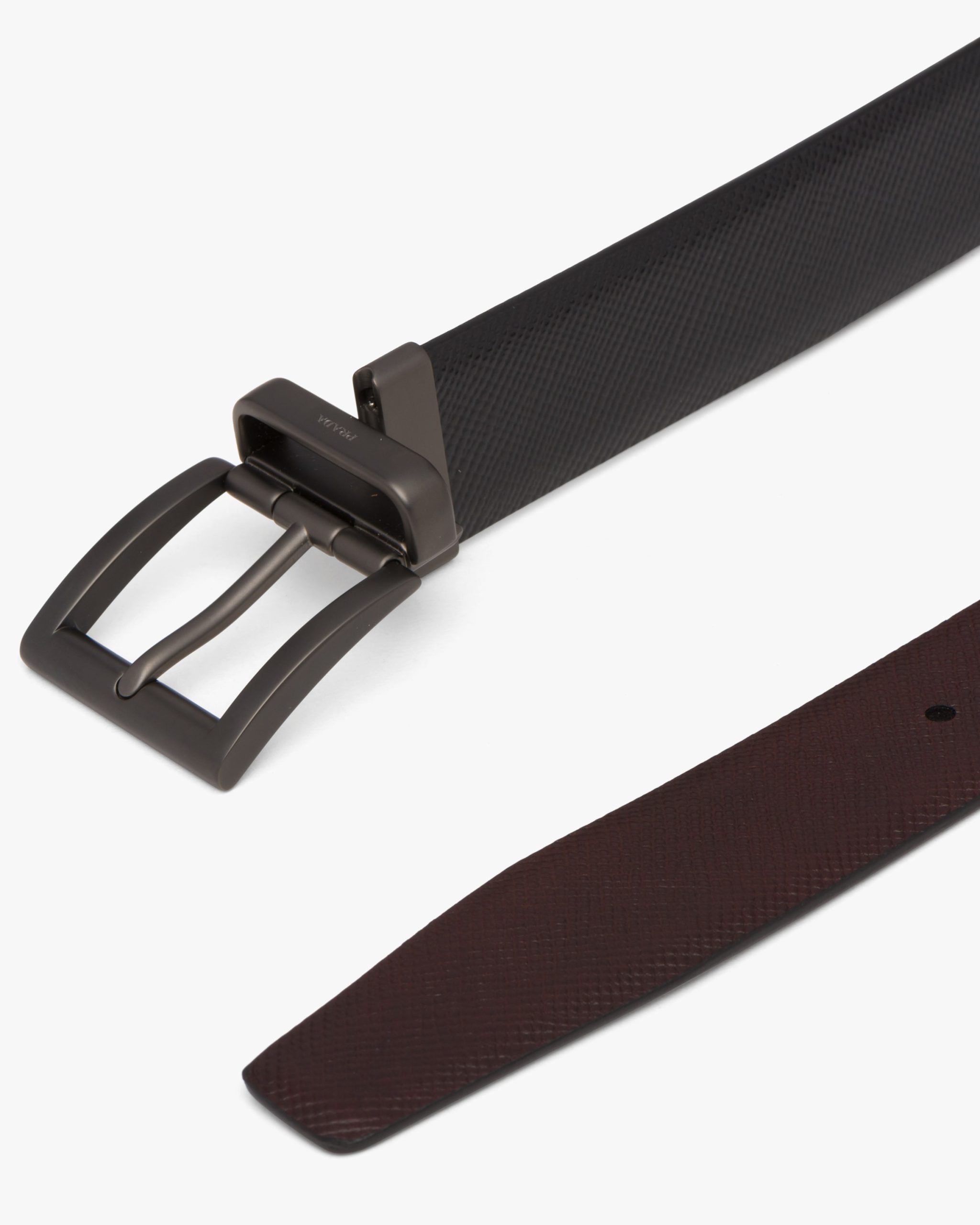 This two-toned Saffiano leather reversible belt can be worn with different outfits. The 3.3cm accessory features a black palladium finish buckle stamped with the Prada logo.