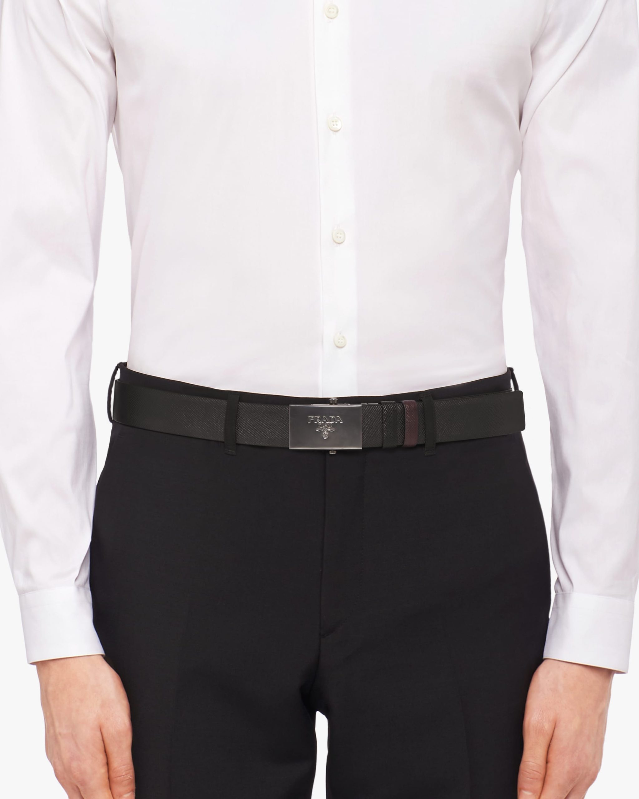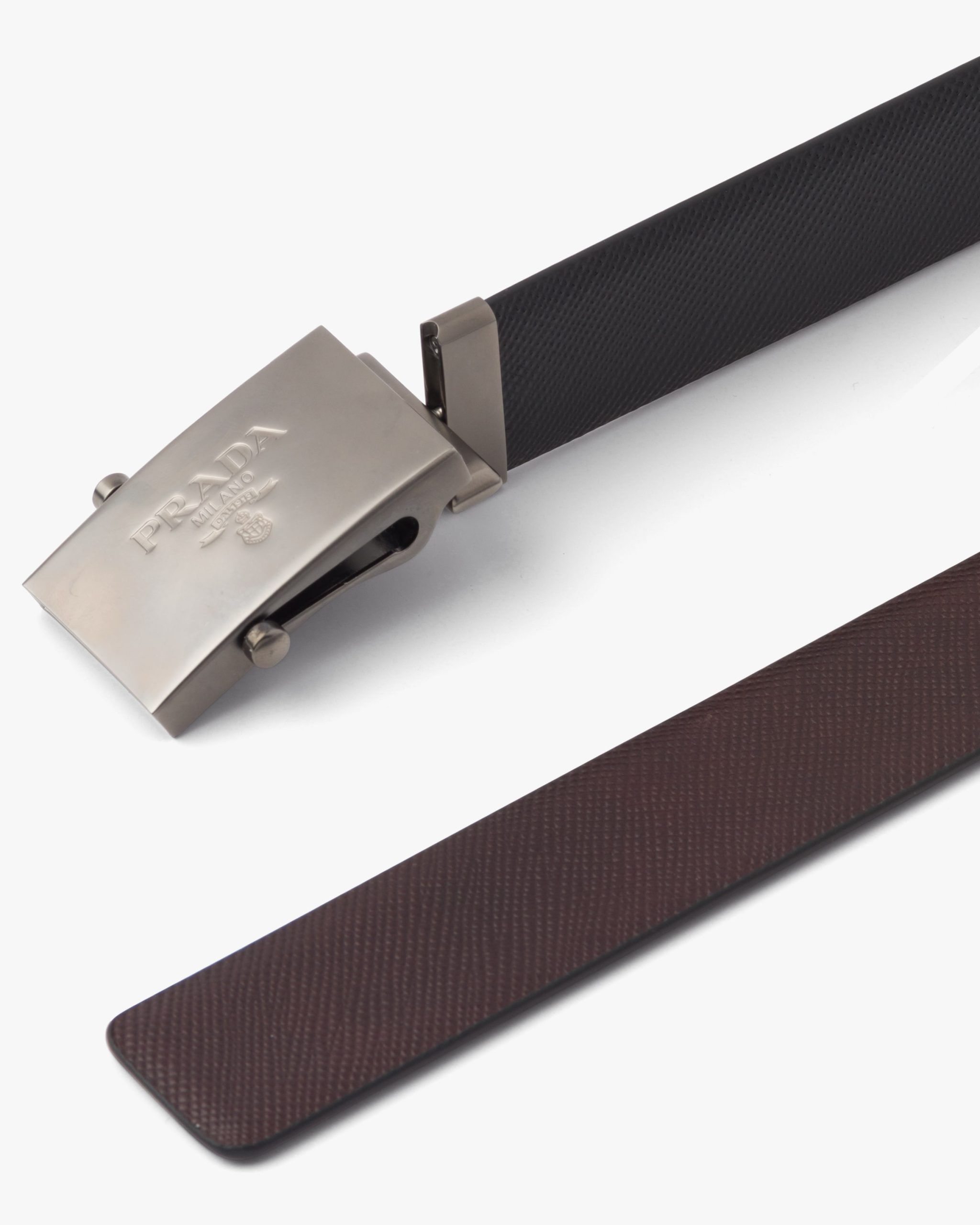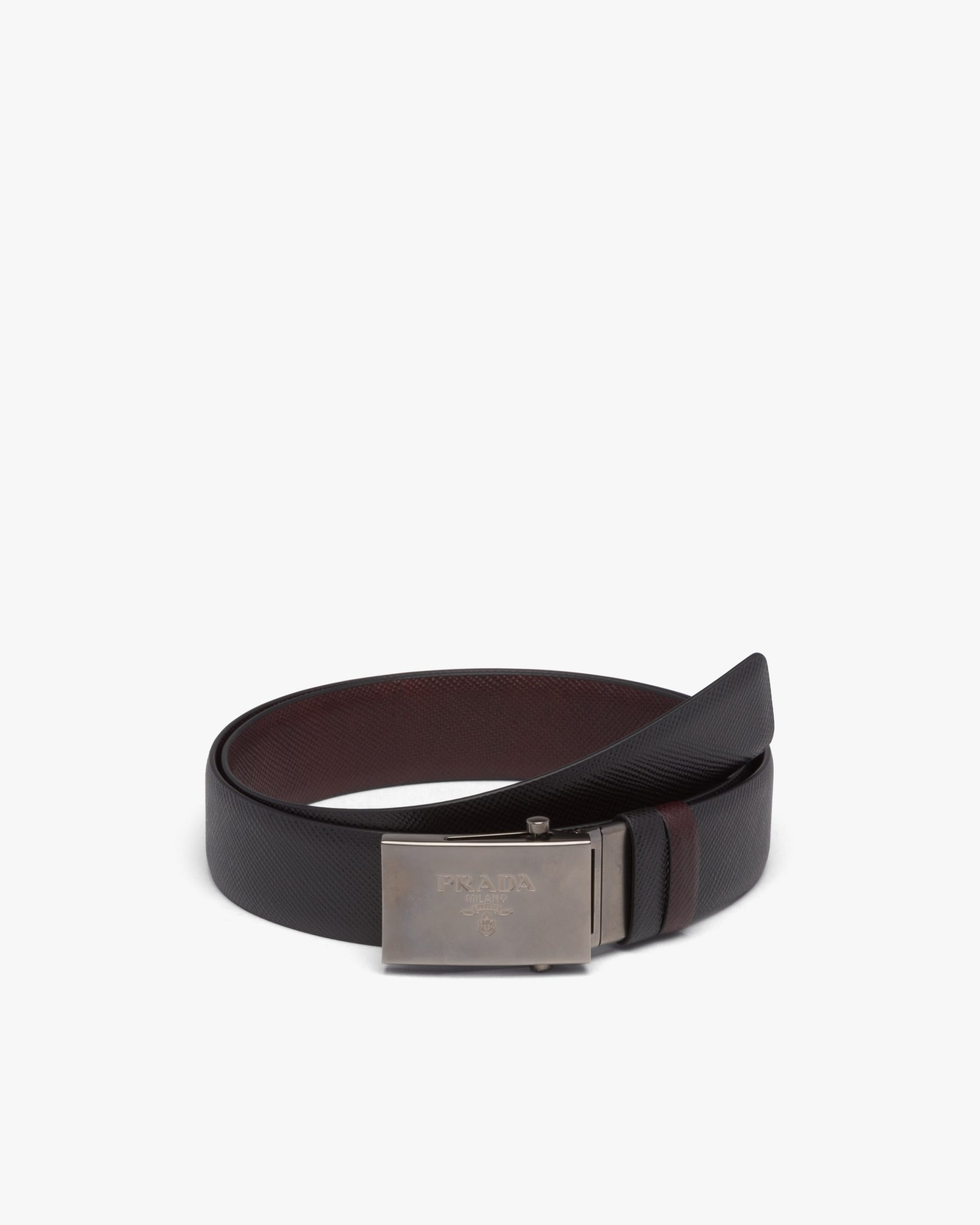 A 3.5cm reversible leather belt. Finished in black palladium and bearing a Prada logo engraving, the plate buckle detaches to reverse sides.