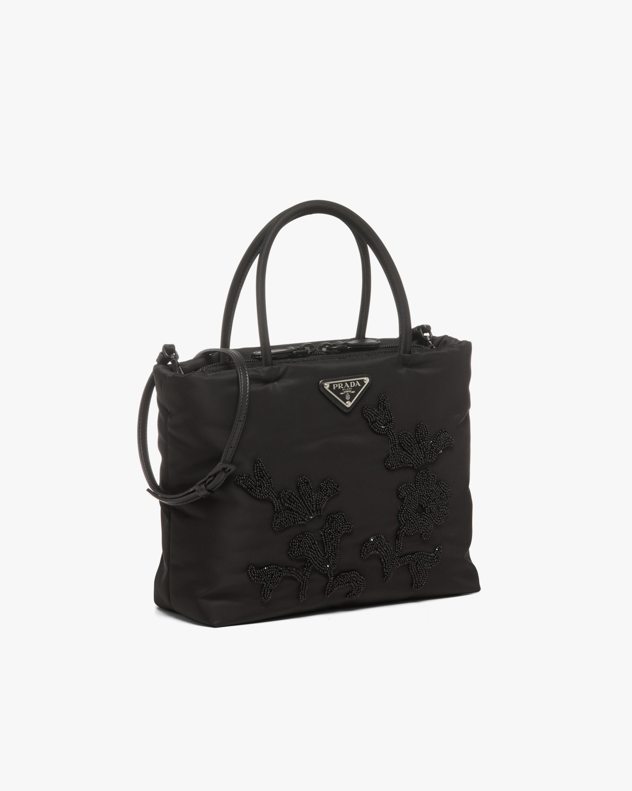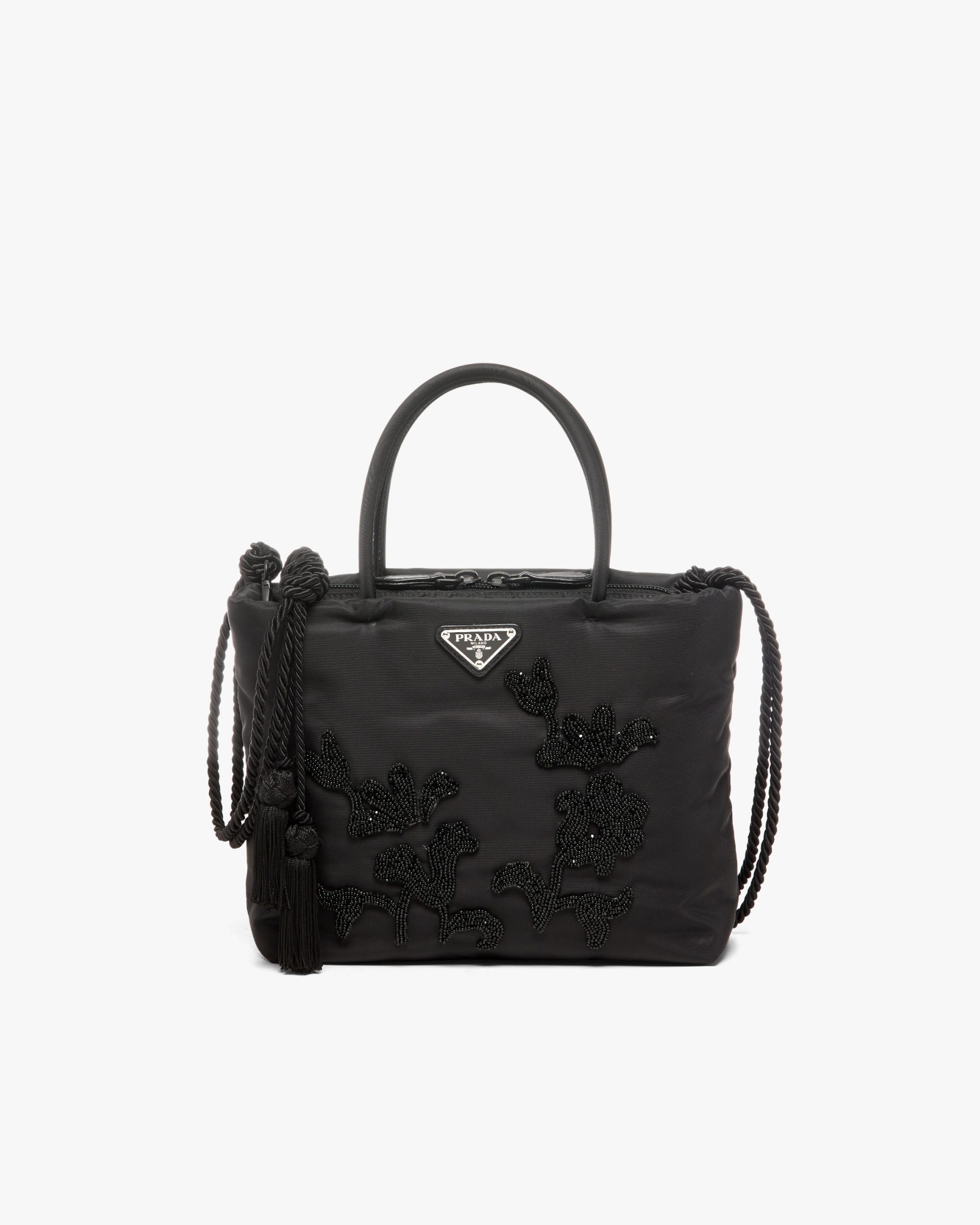 Precious embroidery and trim decorate the bags of the Fall Winter collectsion 2020, creating an unexpected combination of details and materials. This handbag made of nylon ; one of the iconic fabrics of the brand ; is accented with tonal floral embroidery and a twisted braid shoulder strap with tassels, which lets the accessory be worn as a crossbody or shoulder bag.