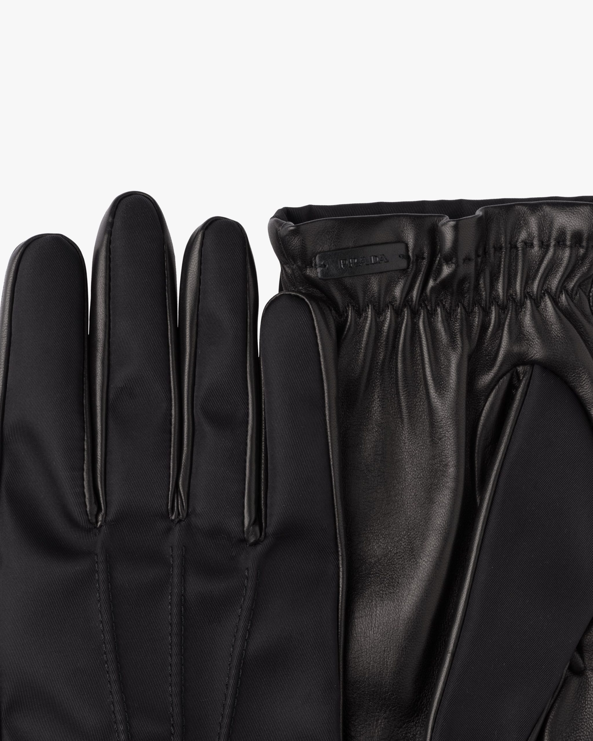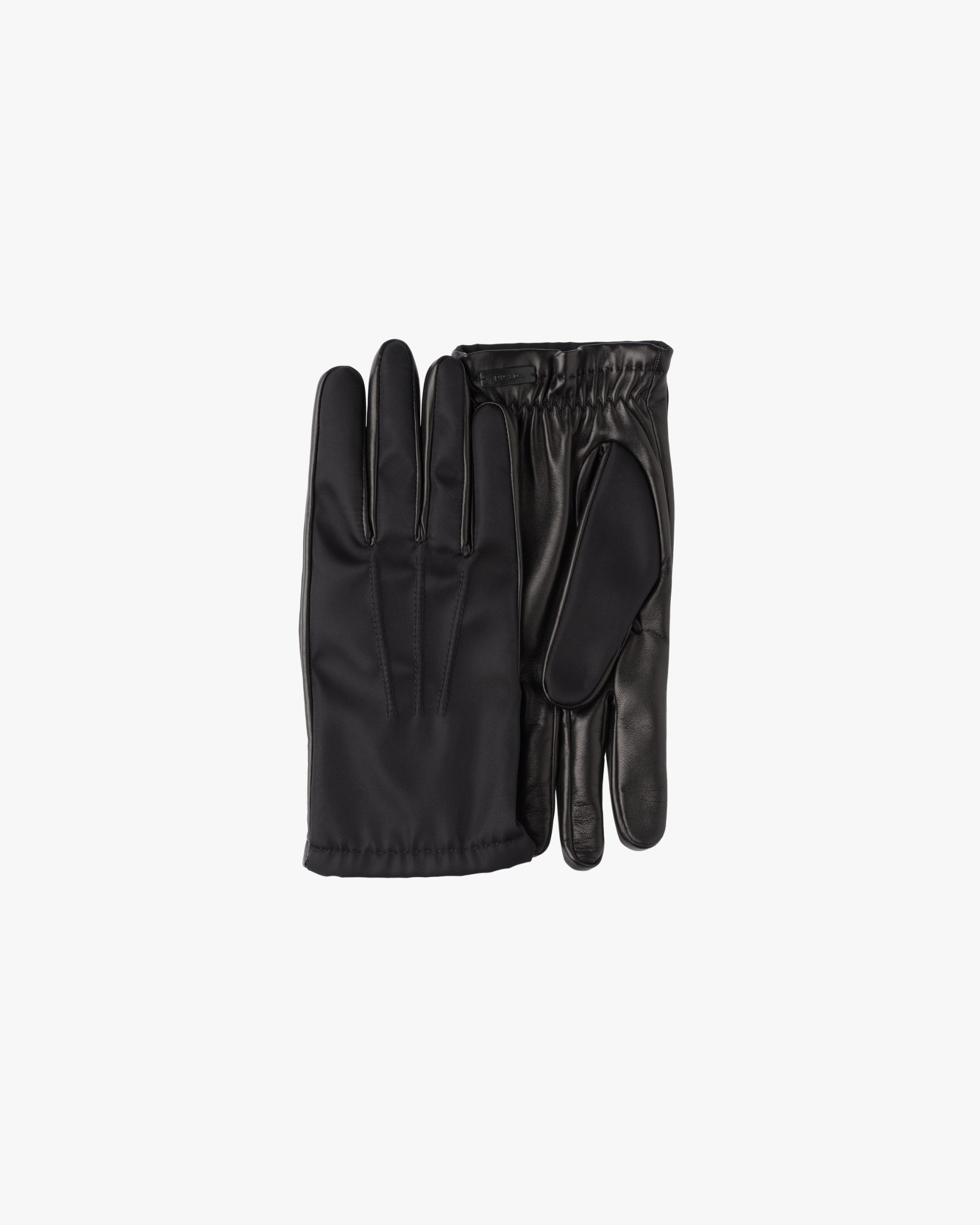 These gloves are defined by the stitched detail on the back of the hand and their contrasting materials ; nylon and leather.