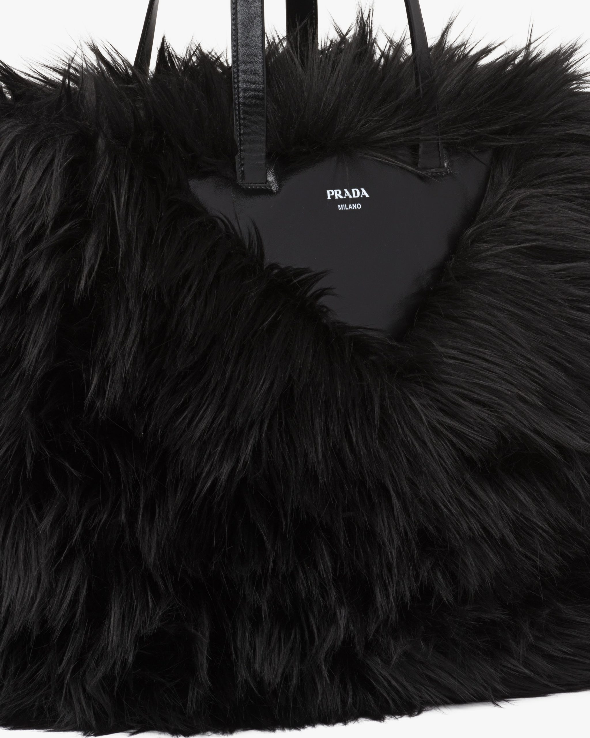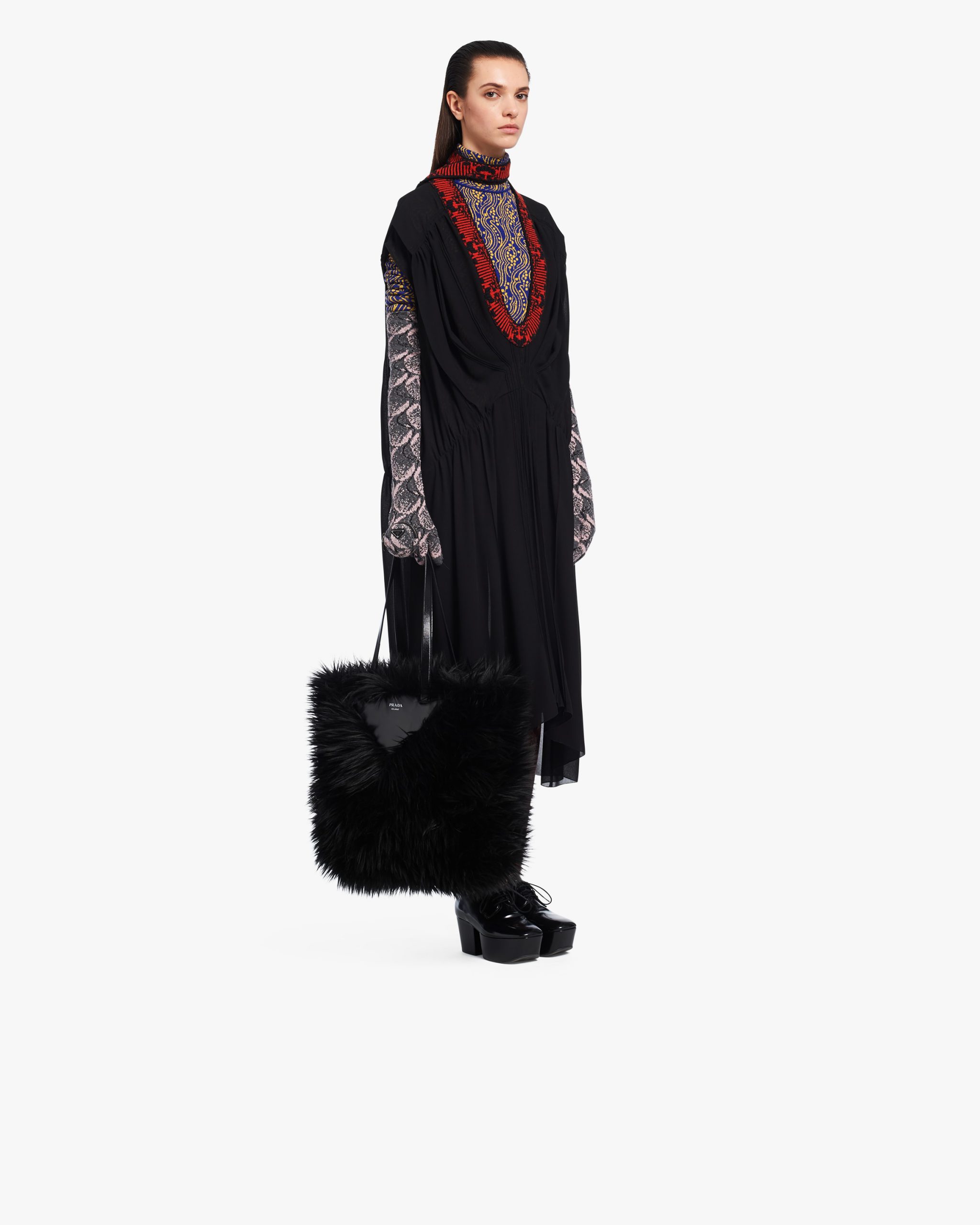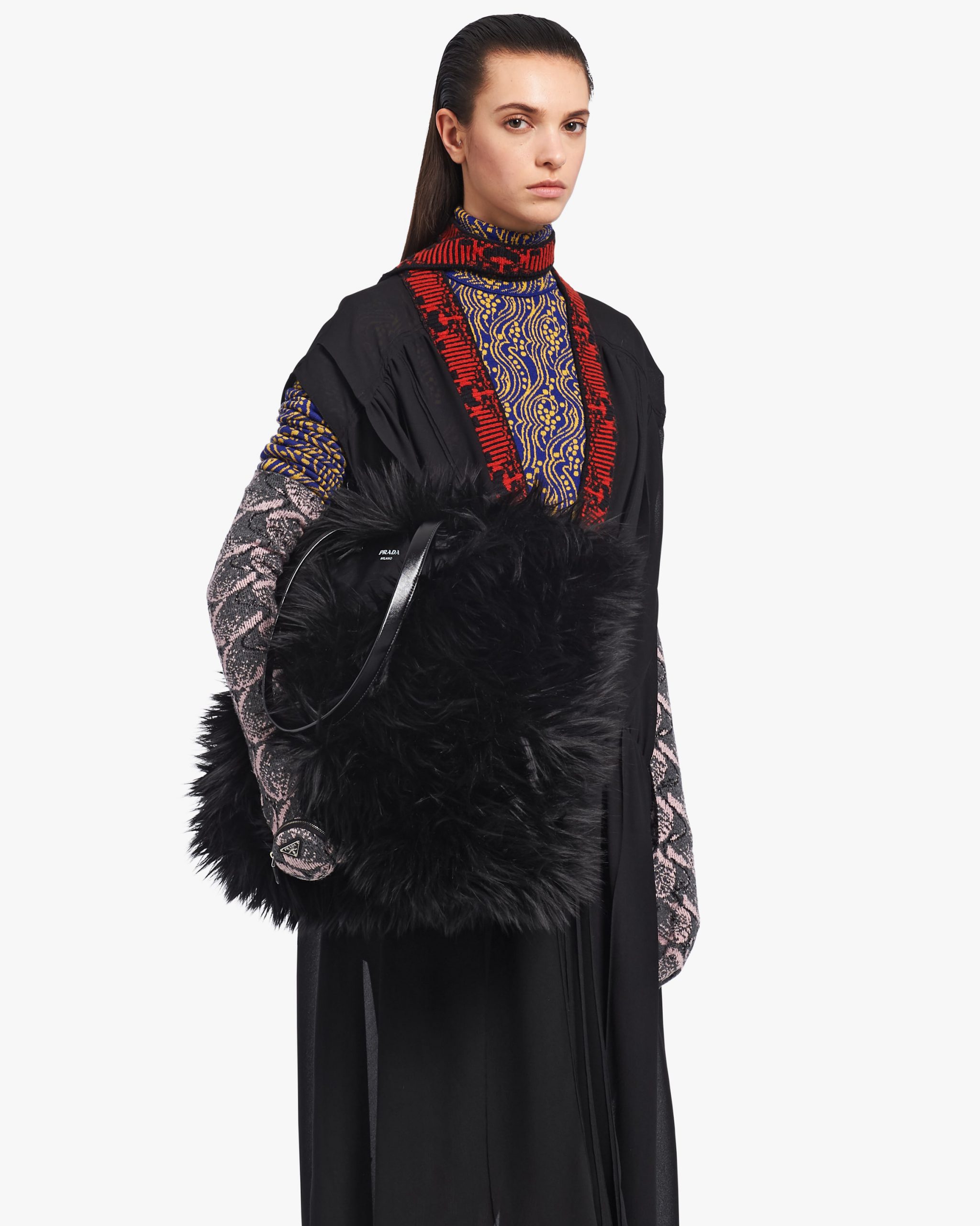 New volumes in soft faux fur fabric characterize this tote bag from the Fall Winter 2021 collectsion where the need for sensations and the pleasure of tactility translate into a panoply of textures and fabrics. The leather triangle with the iconic lettering logo that decorates the accessory lengthens to become a double handle.