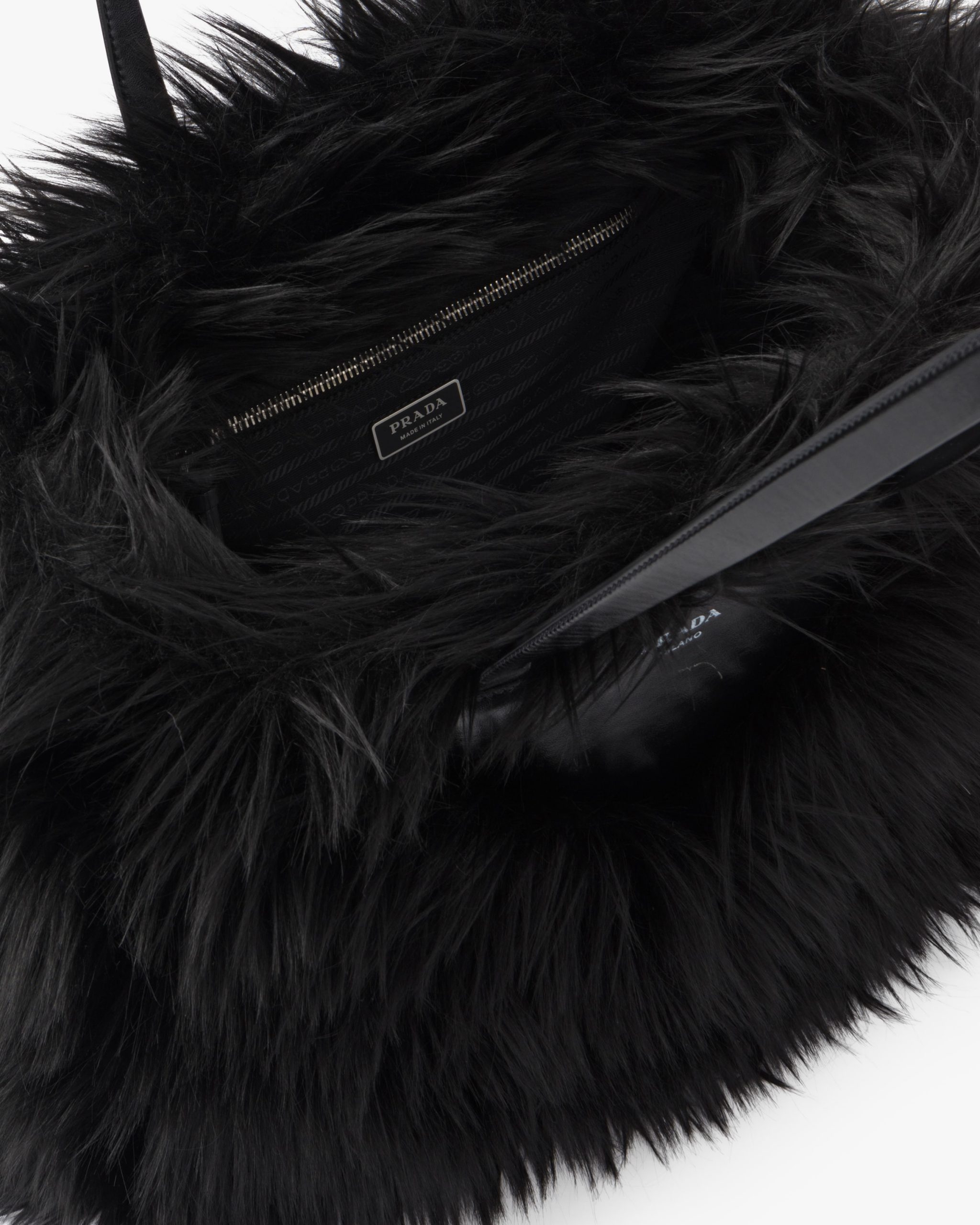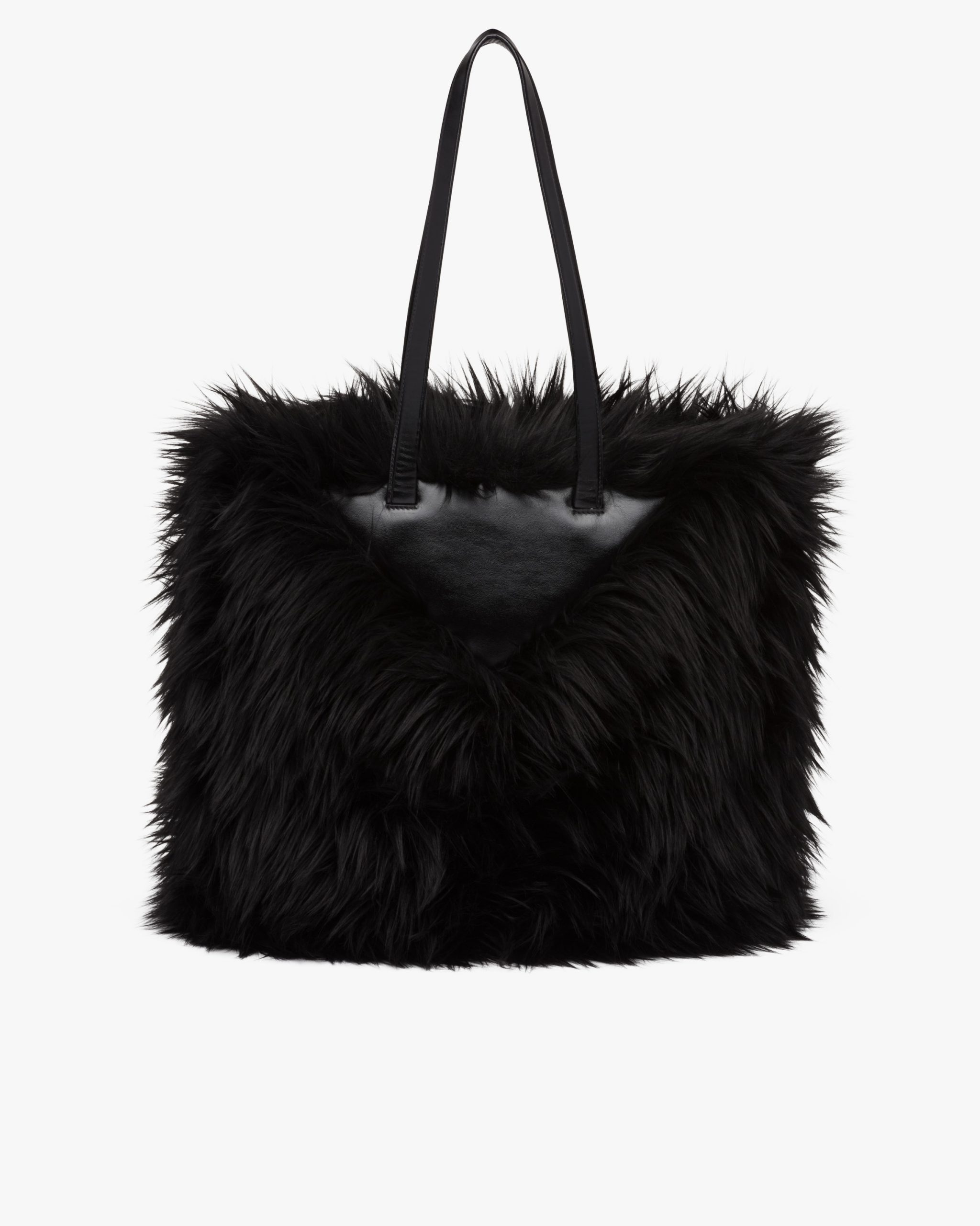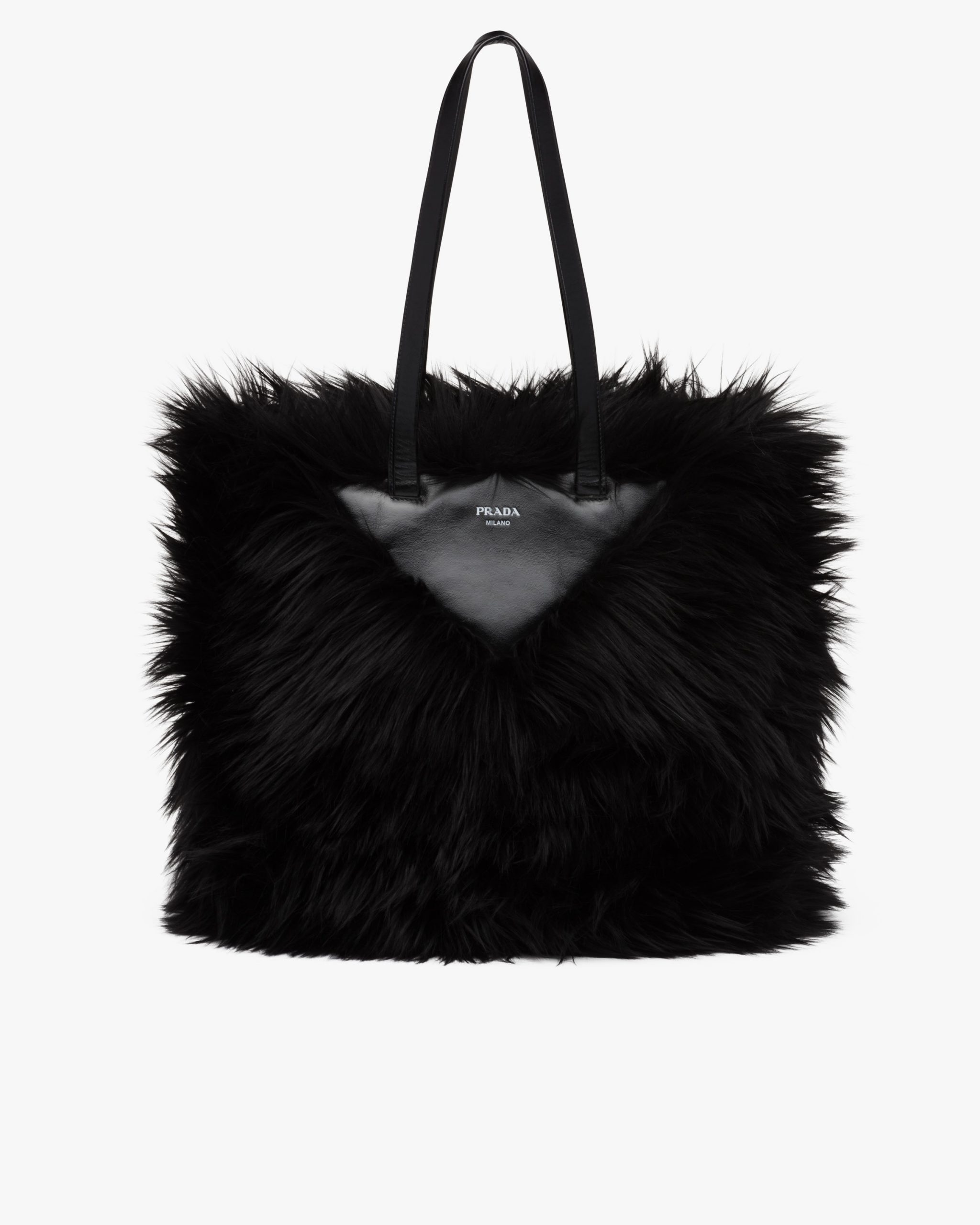 New volumes in soft faux fur fabric characterize this tote bag from the Fall Winter 2021 collectsion where the need for sensations and the pleasure of tactility translate into a panoply of textures and fabrics. The leather triangle with the iconic lettering logo that decorates the accessory lengthens to become a double handle.