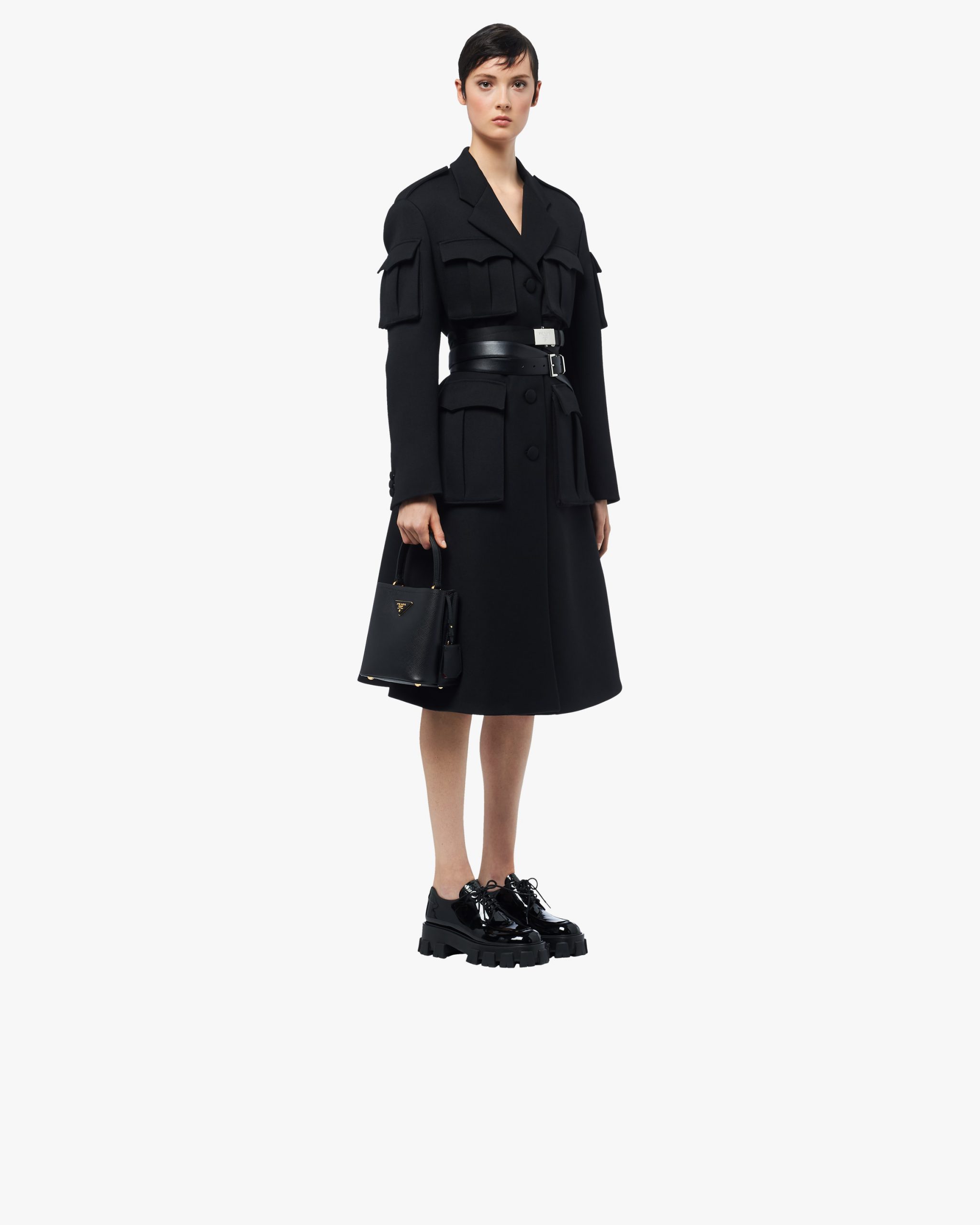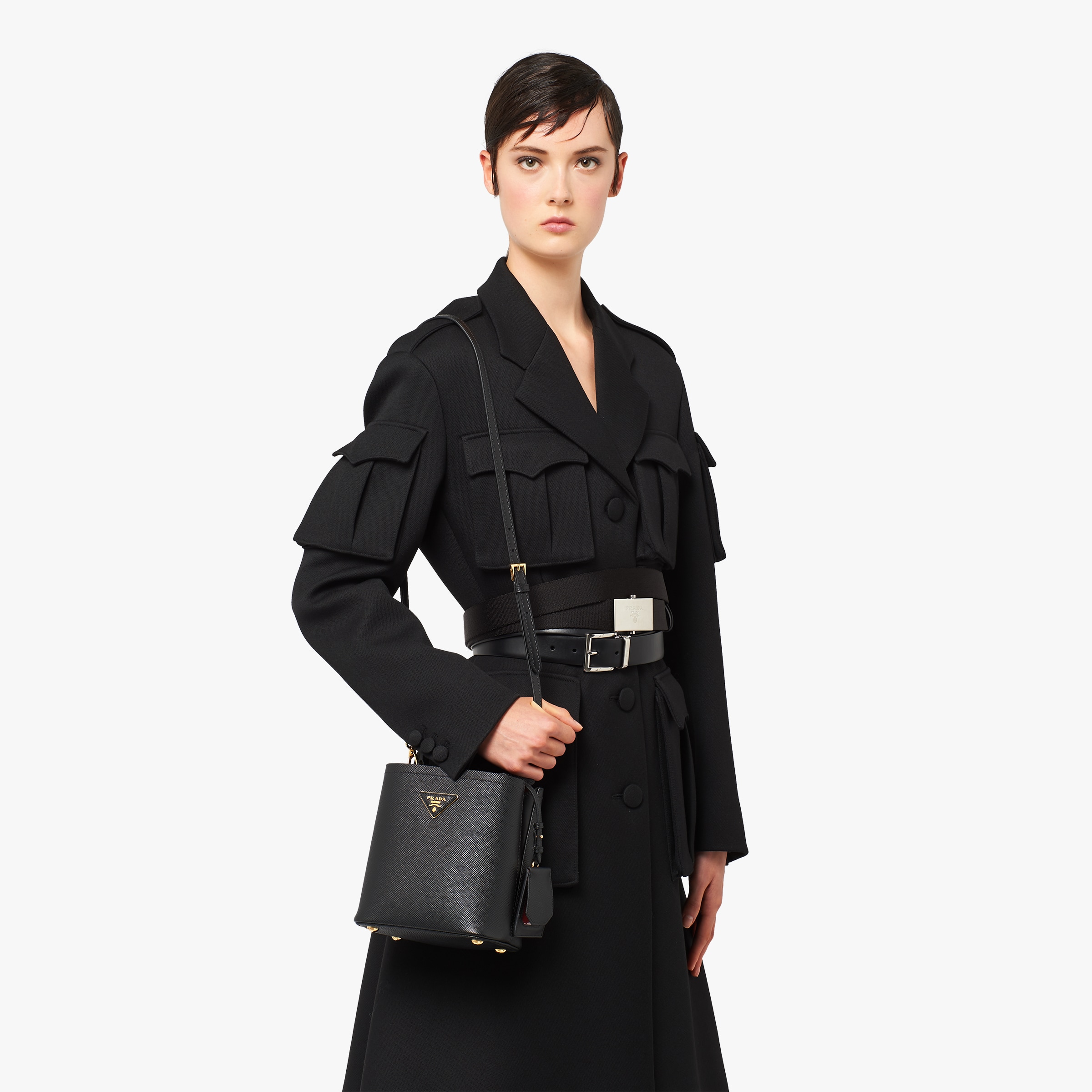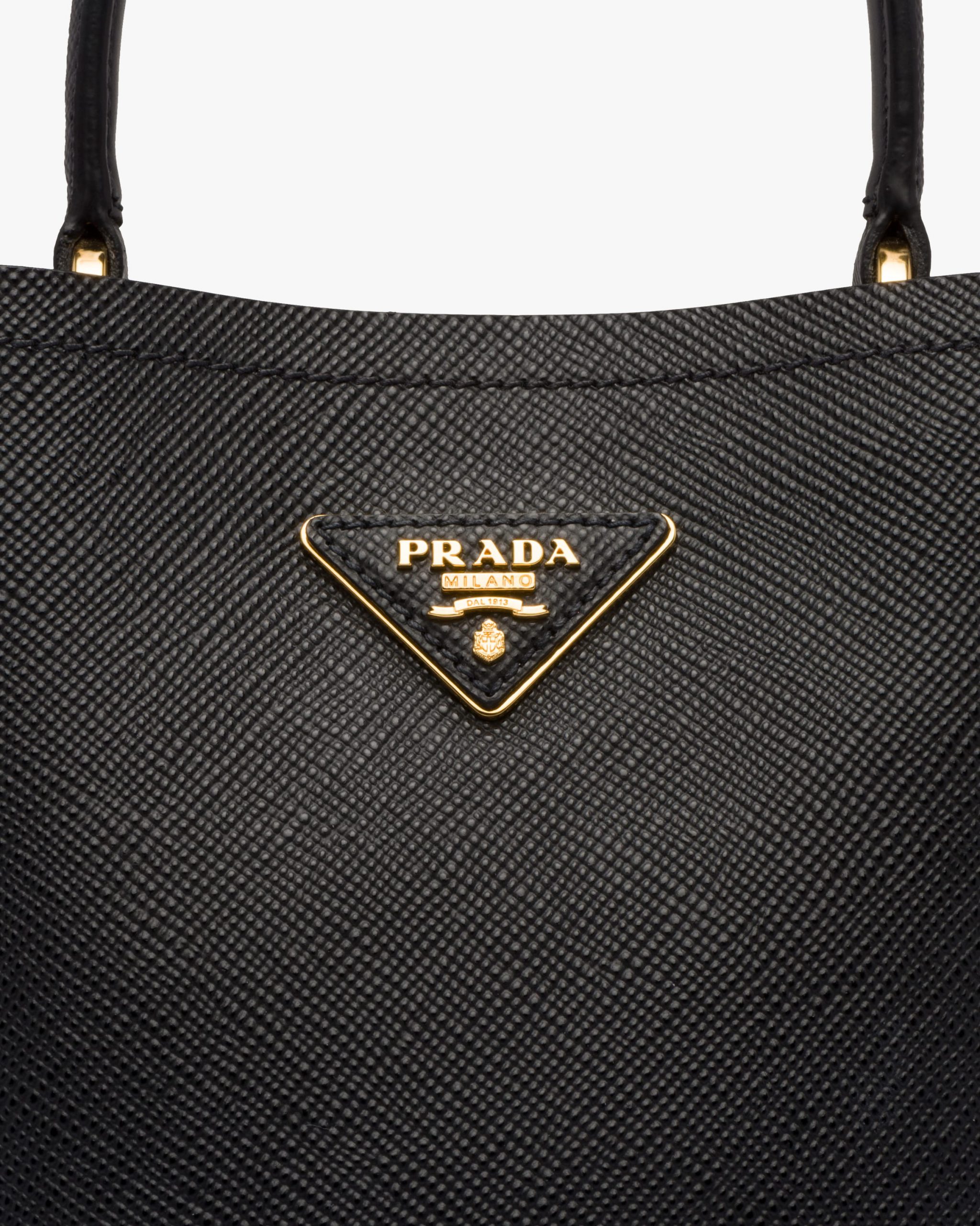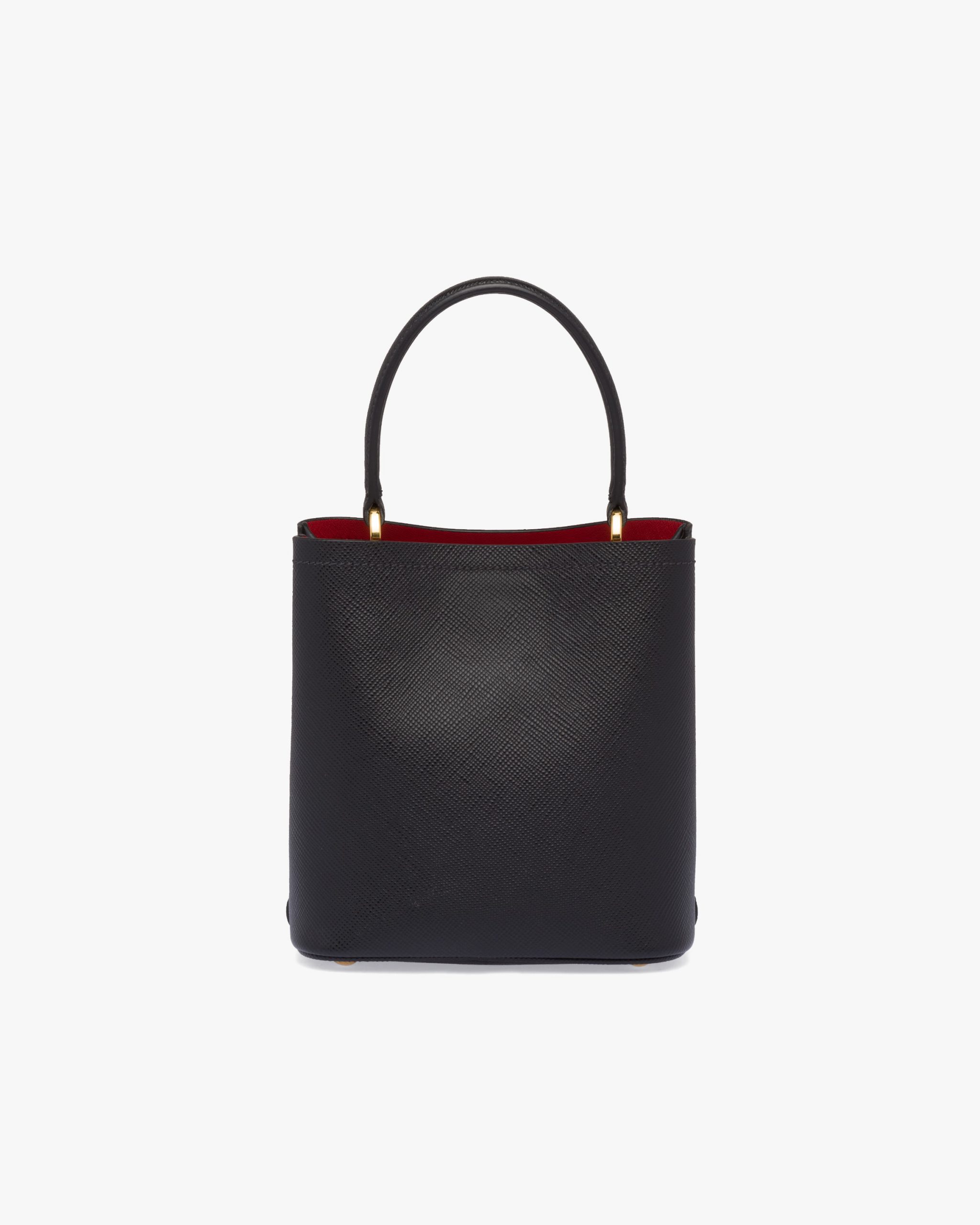 The iconic texture of Saffiano leather characterizes the compact Prada Panier bag. The elegant design of the bag with single handle is distinguished for the strap closure on the top.