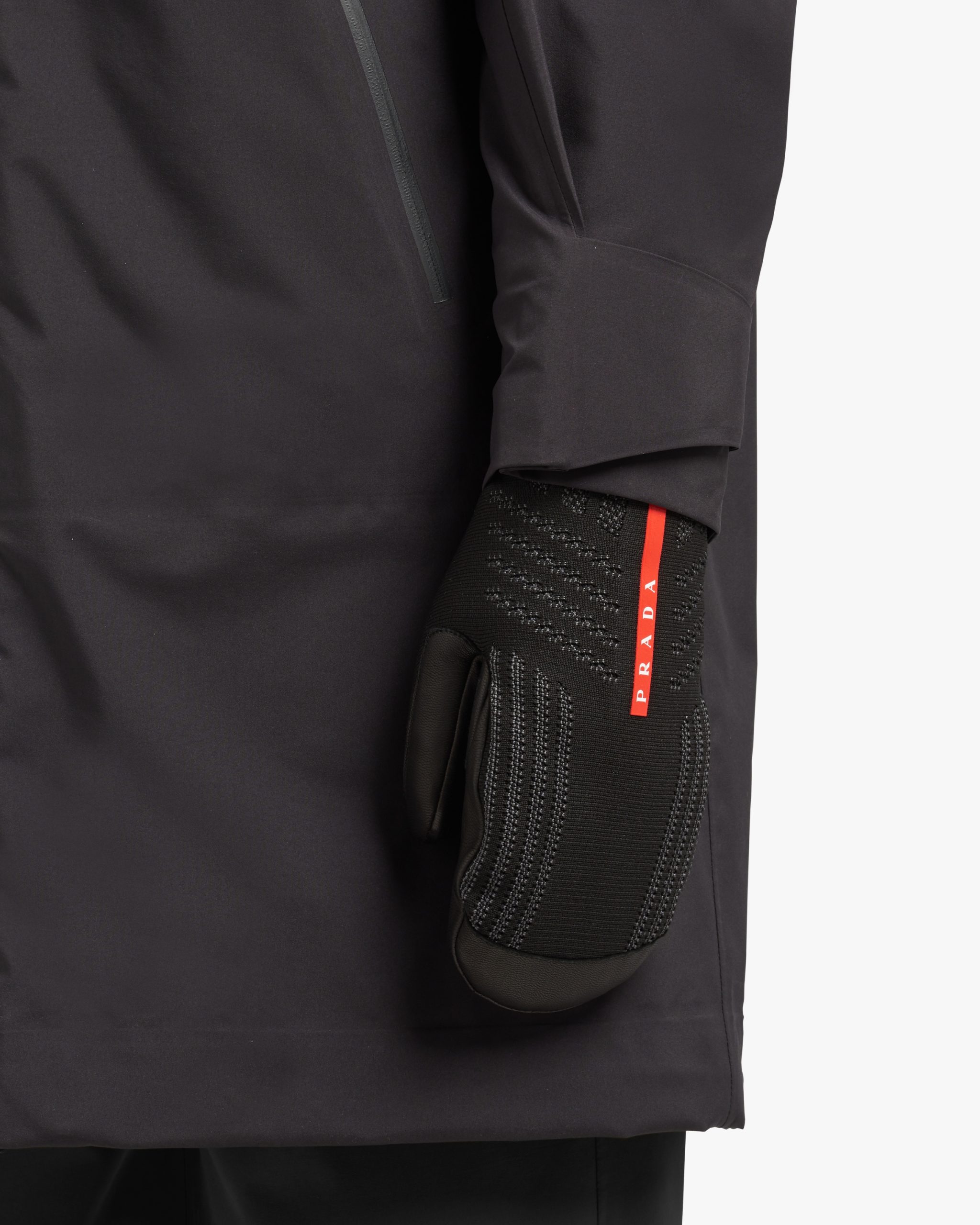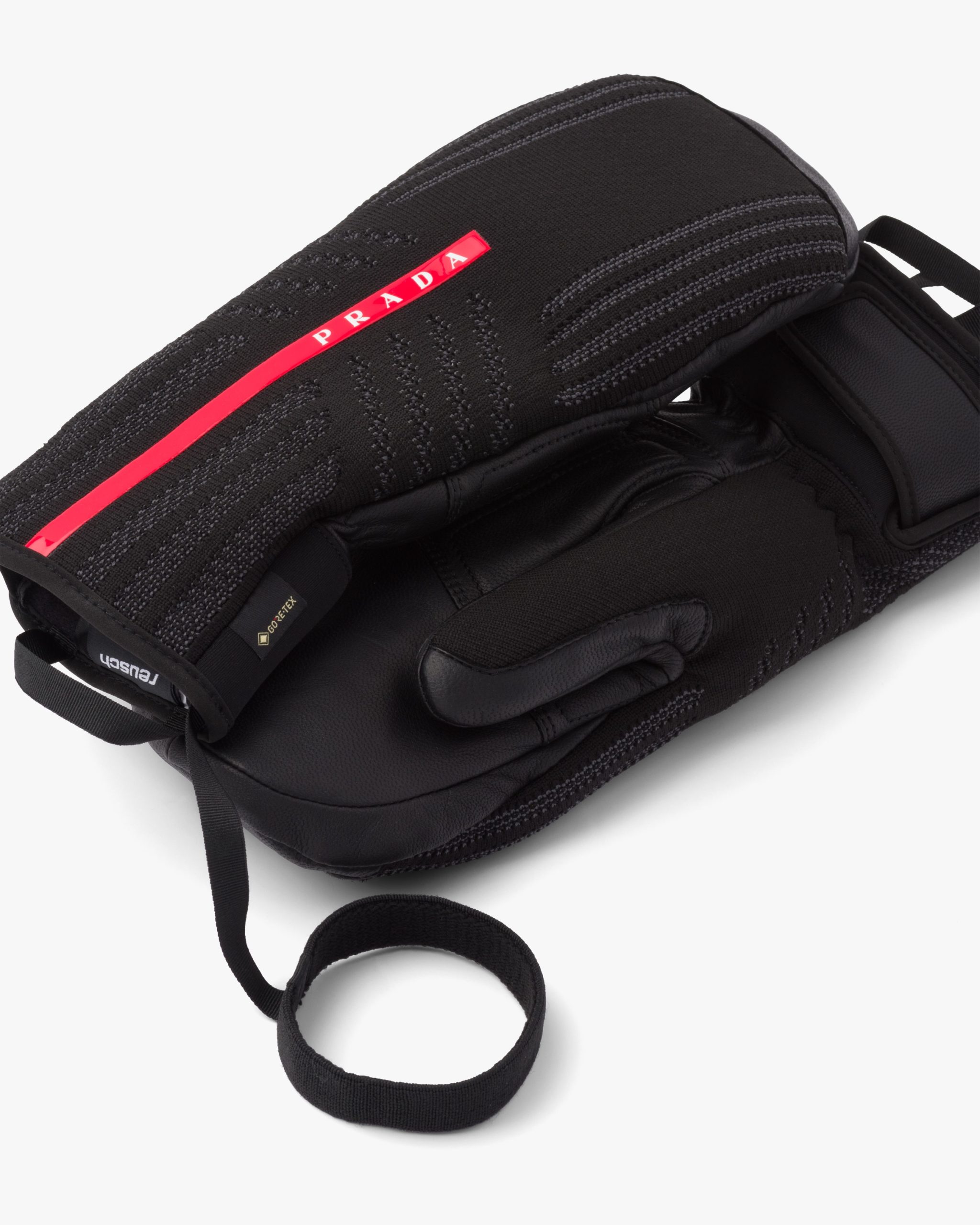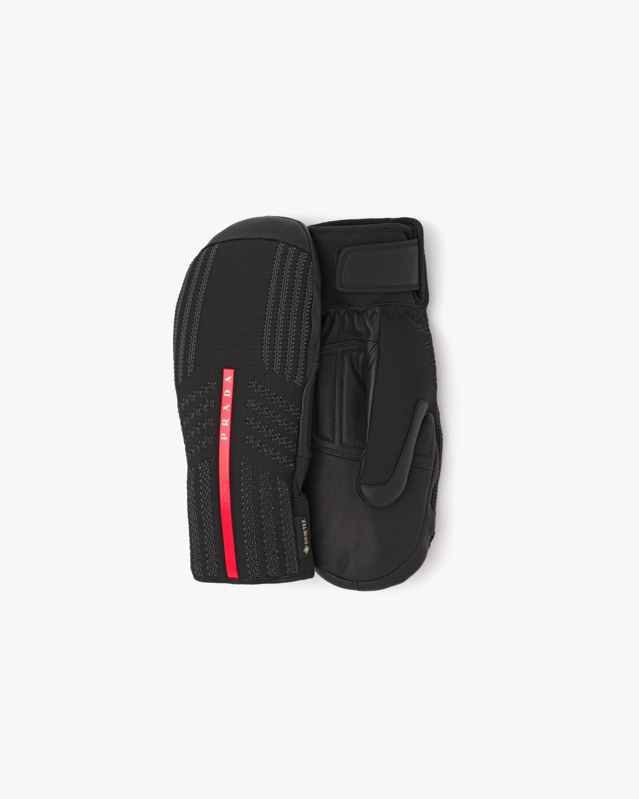 These three-dimensional knit mittens with a modern, functional design are decorated with the Prada Linea Rossa logo. The water-repellent, seamless knit back of the glove is like a second skin and is combined with a resistant goat leather palm and a waterproof, windproof GORE-TEX? membrane.