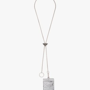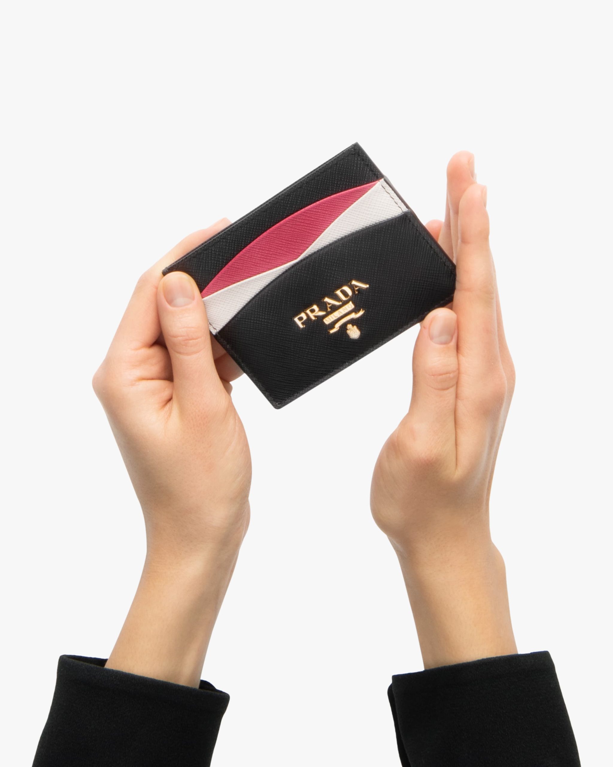 A sophisticated design with curved lines defines the multicolored Saffiano leather credit card holder. Practicality is ensured by the fabric-lined center pocket and card slots.