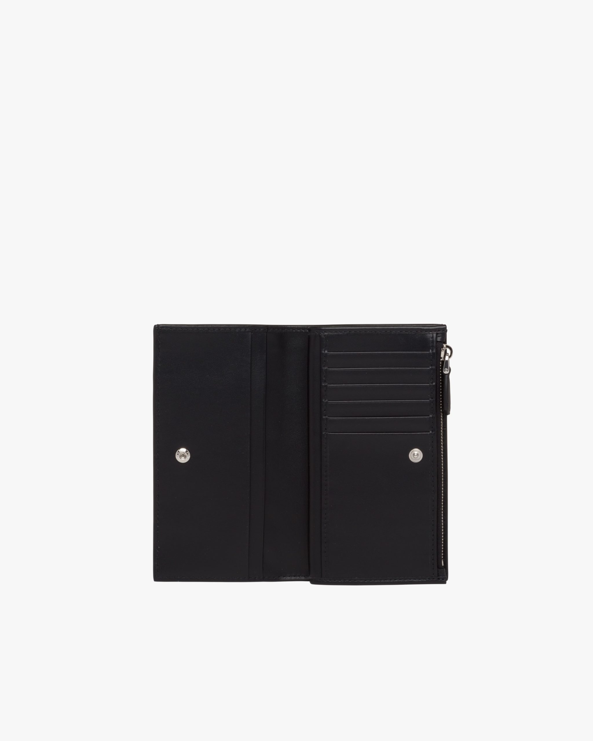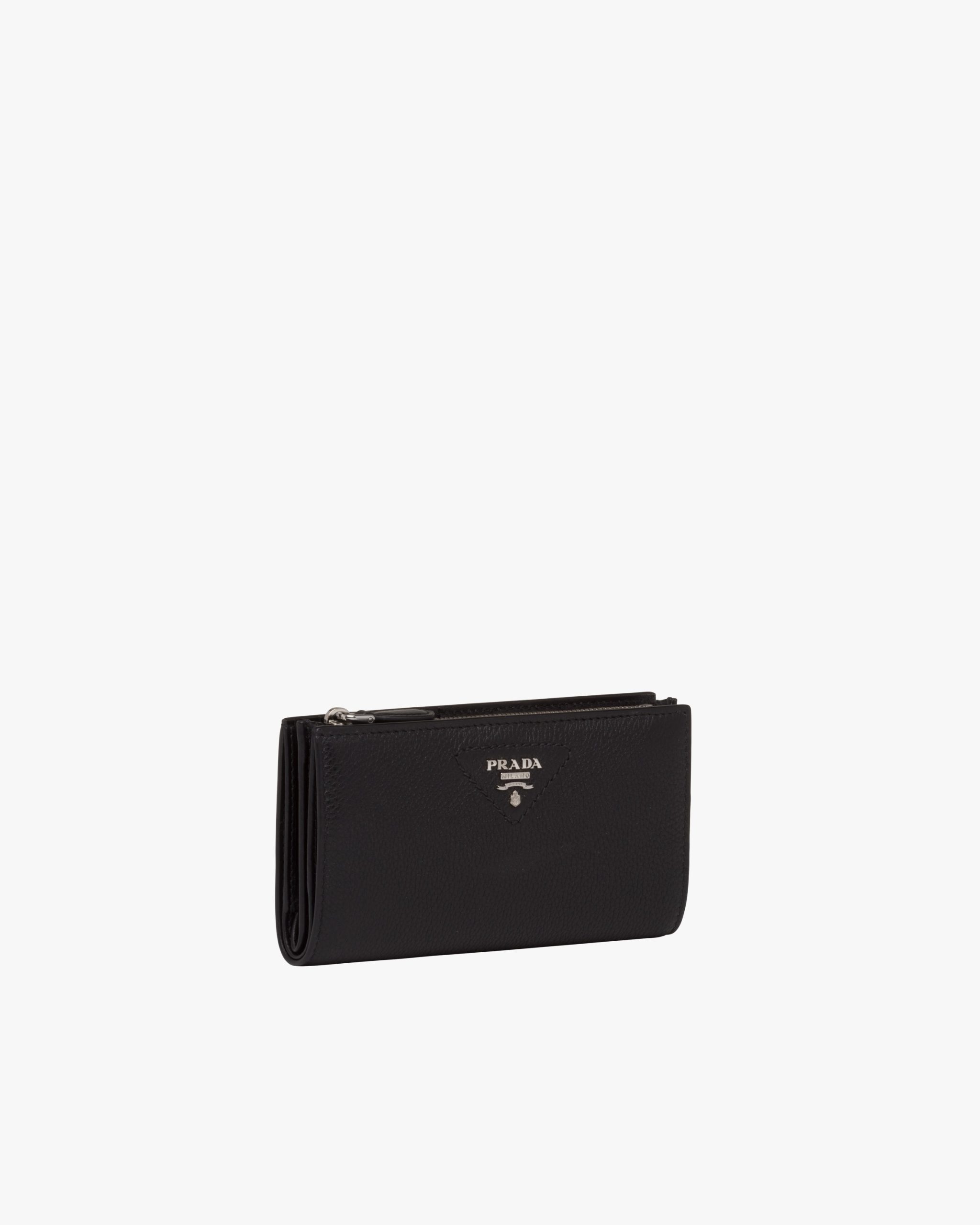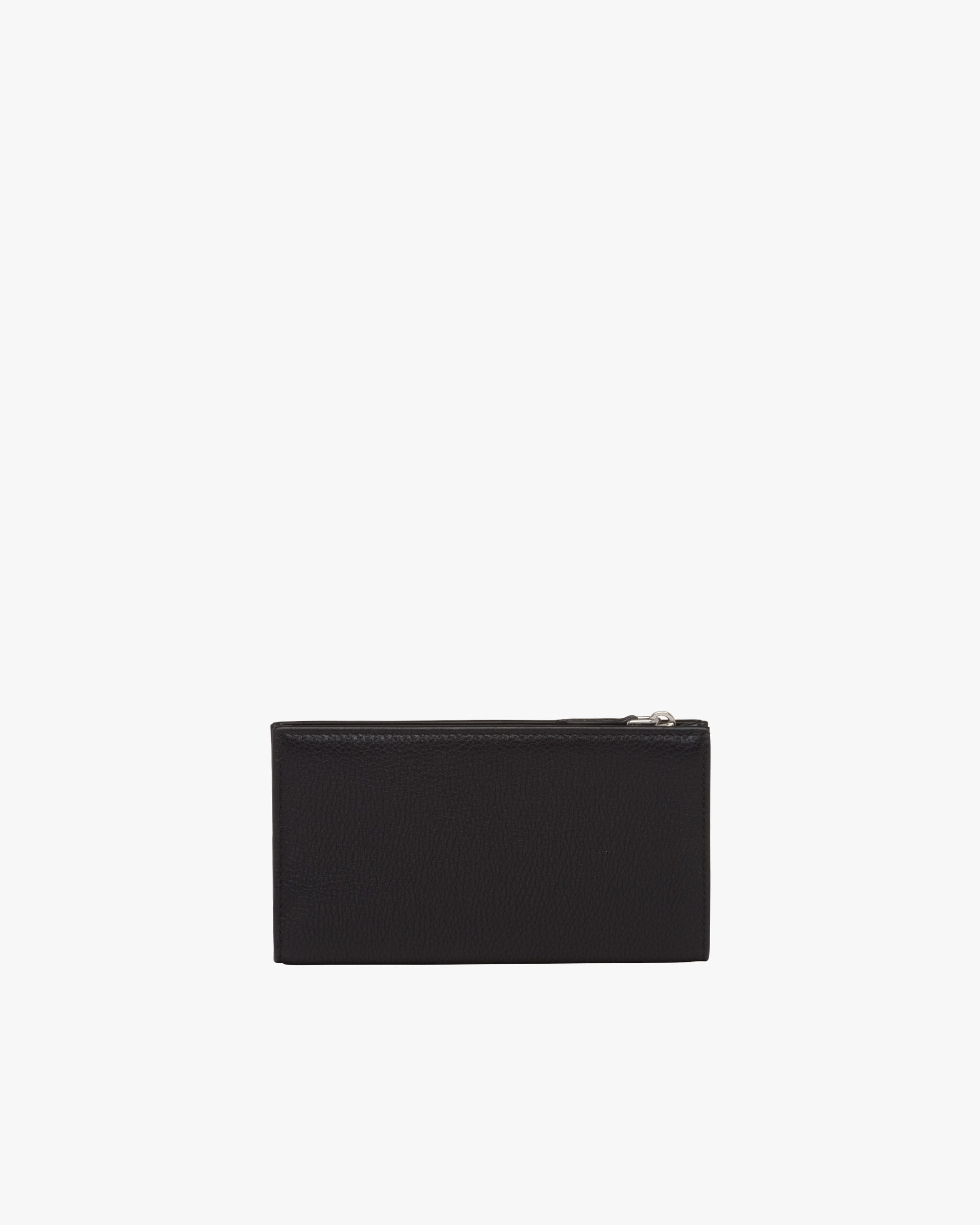 This large leather wallet has several internal pockets and card slots. The accessory is decorated with the metal lettering logo.