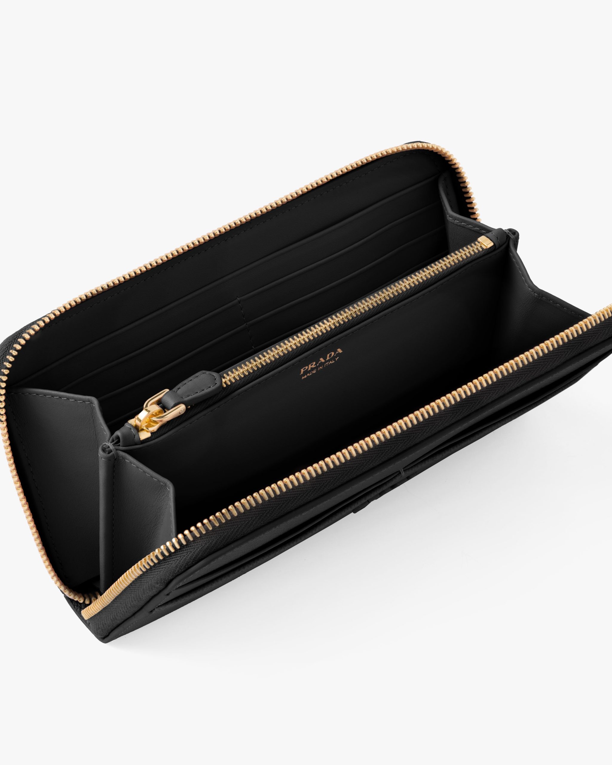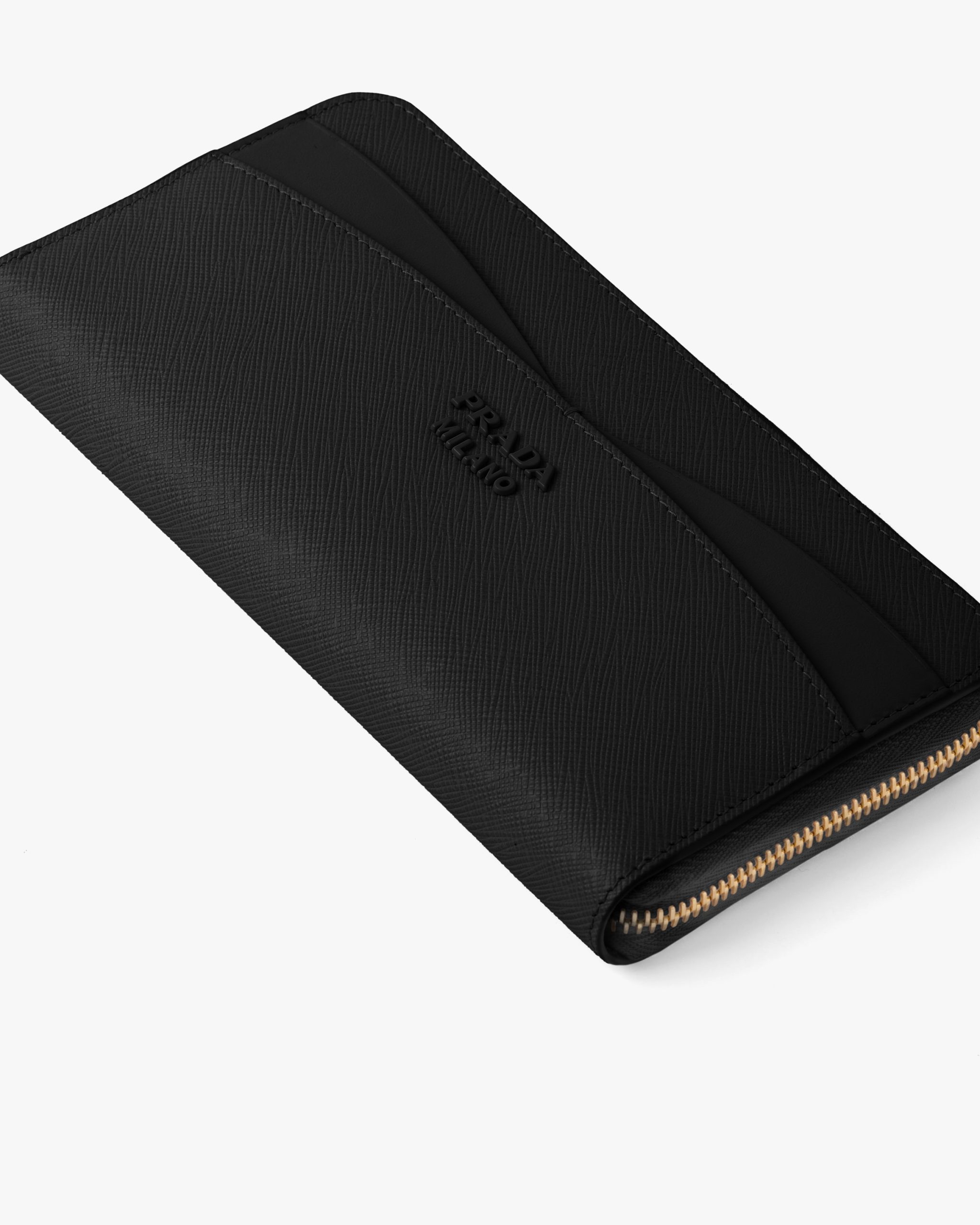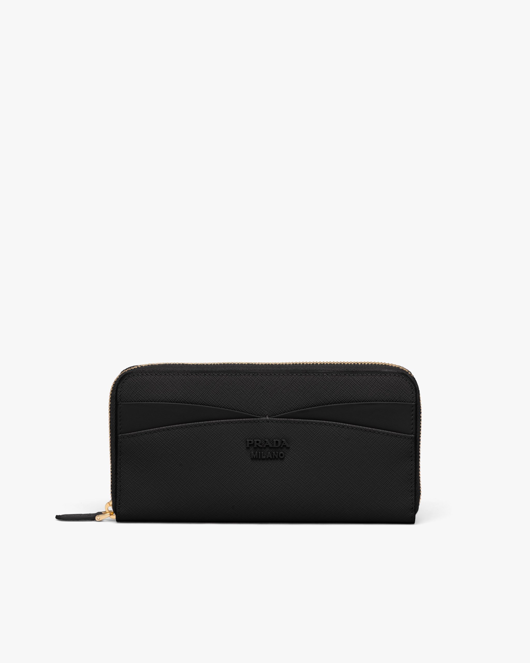 This sleek, elegant zipper wallet is made of a combination of smooth and Saffiano leather, an iconic Prada material with a crosshatch texture. The accessory, characterized by its minimalist design and featuring the varnished metal lettering logo, has pockets and compartments for bills, credit cards and documents.