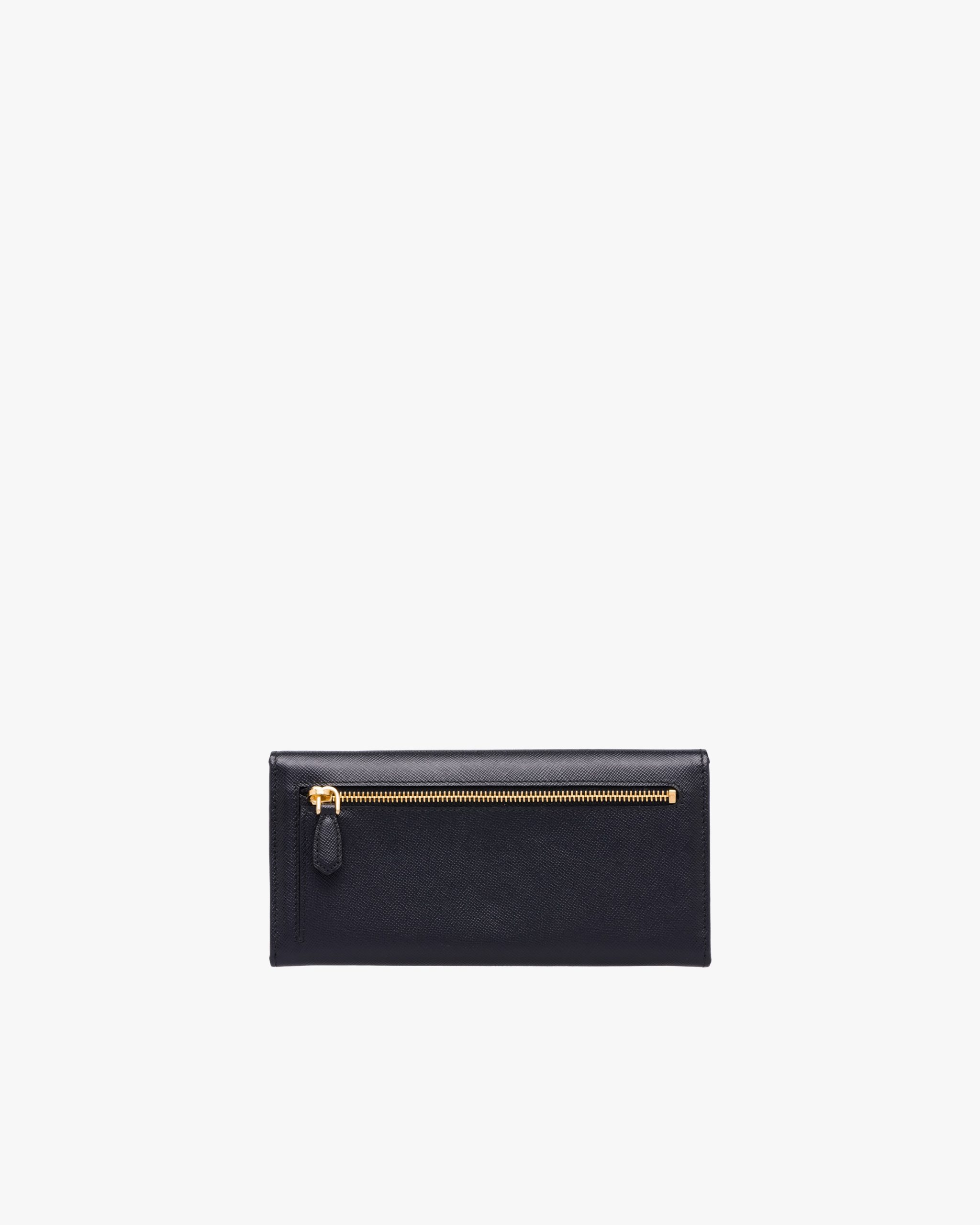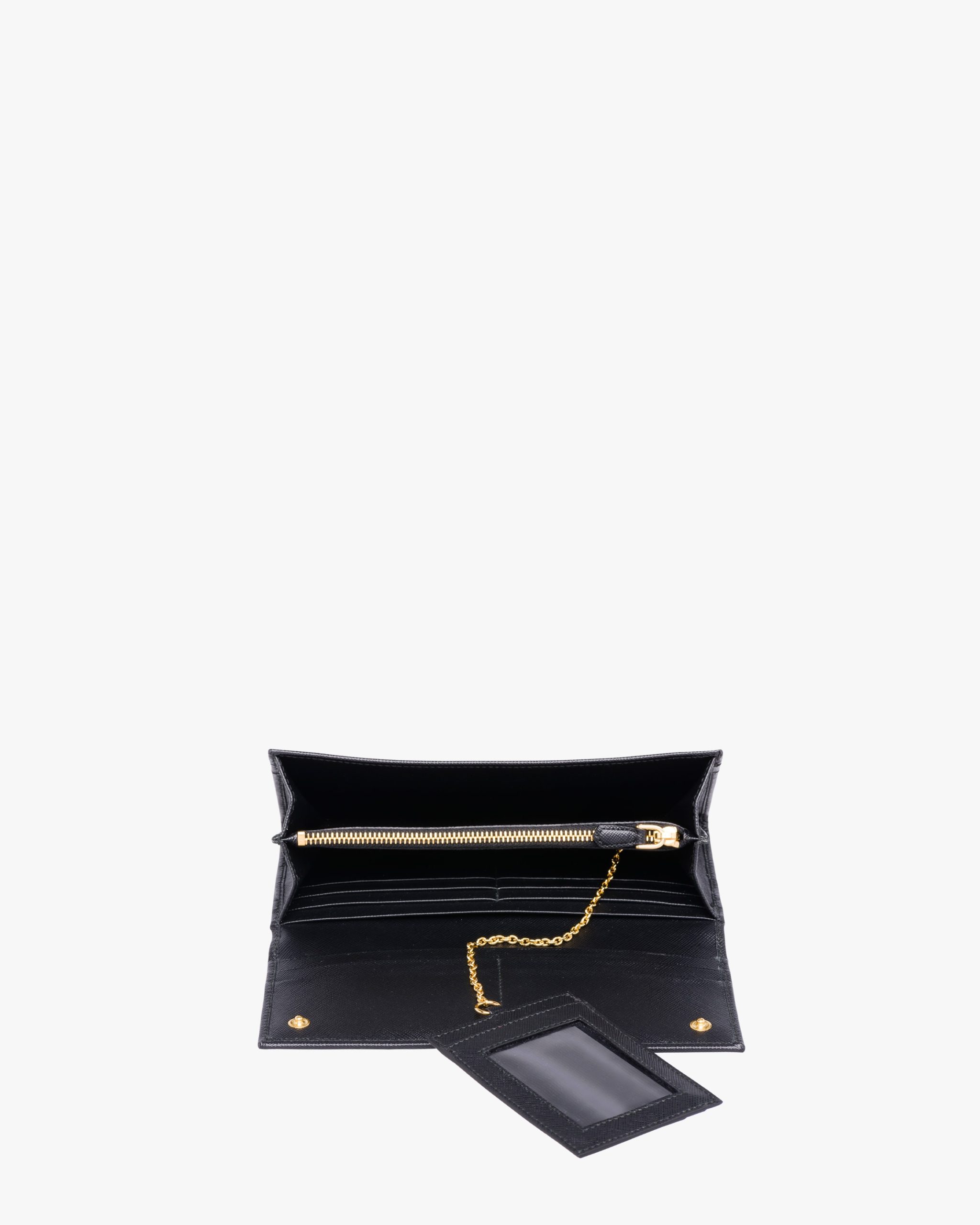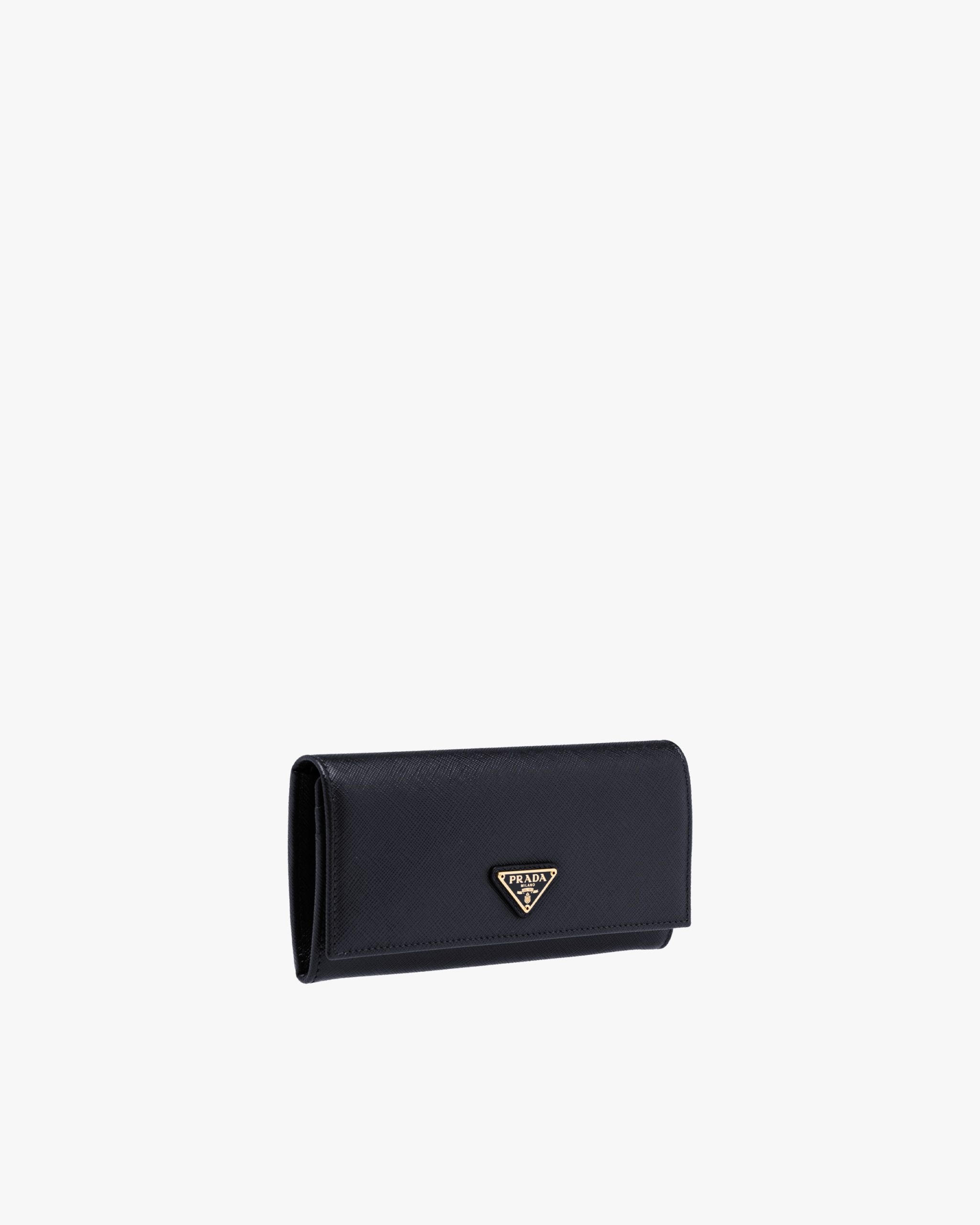 Decorated with the triangle Prada logo, this flap wallet is crafted in Saffiano leather. The snap closure opens to various pockets and an extractable badge holder with chain.