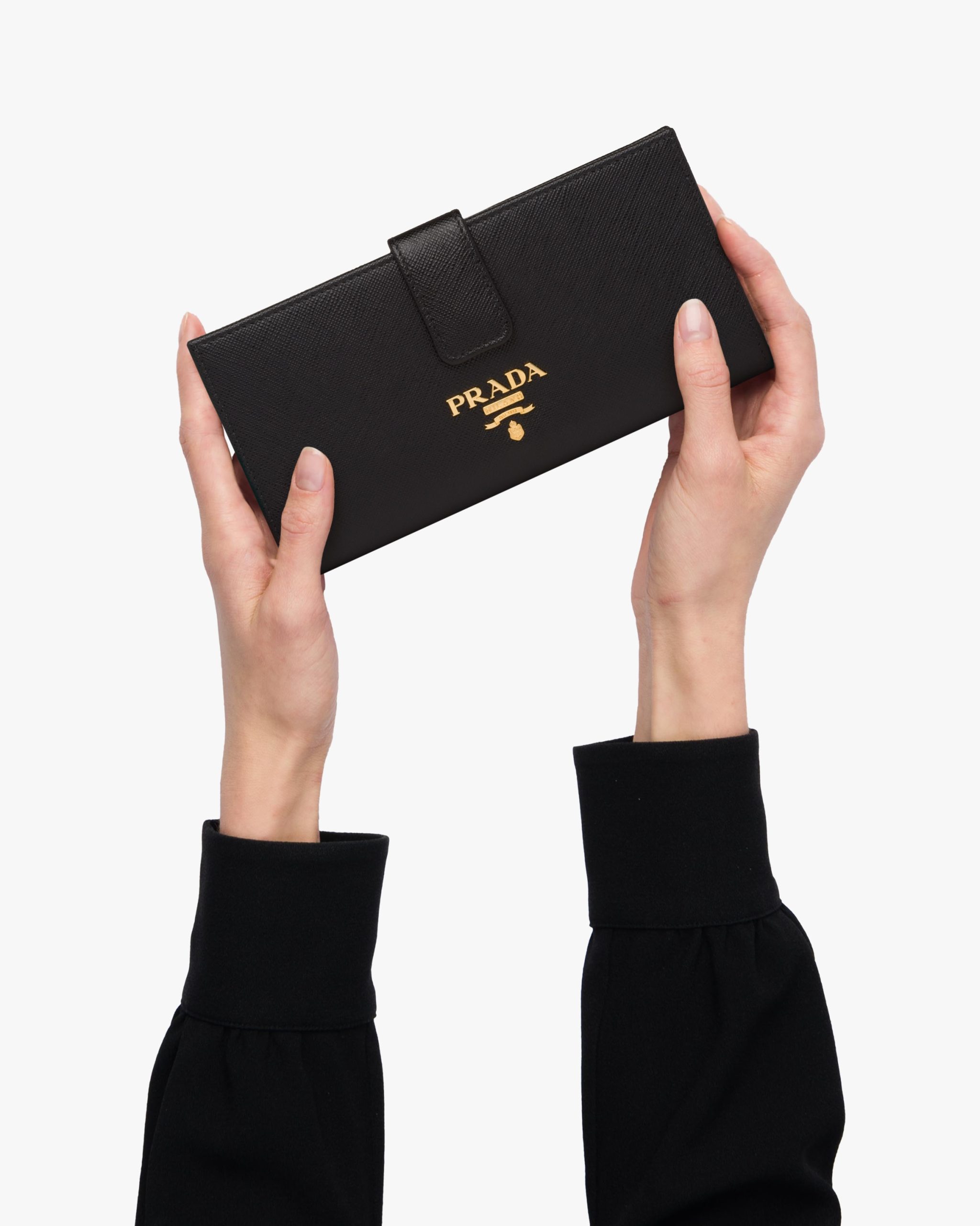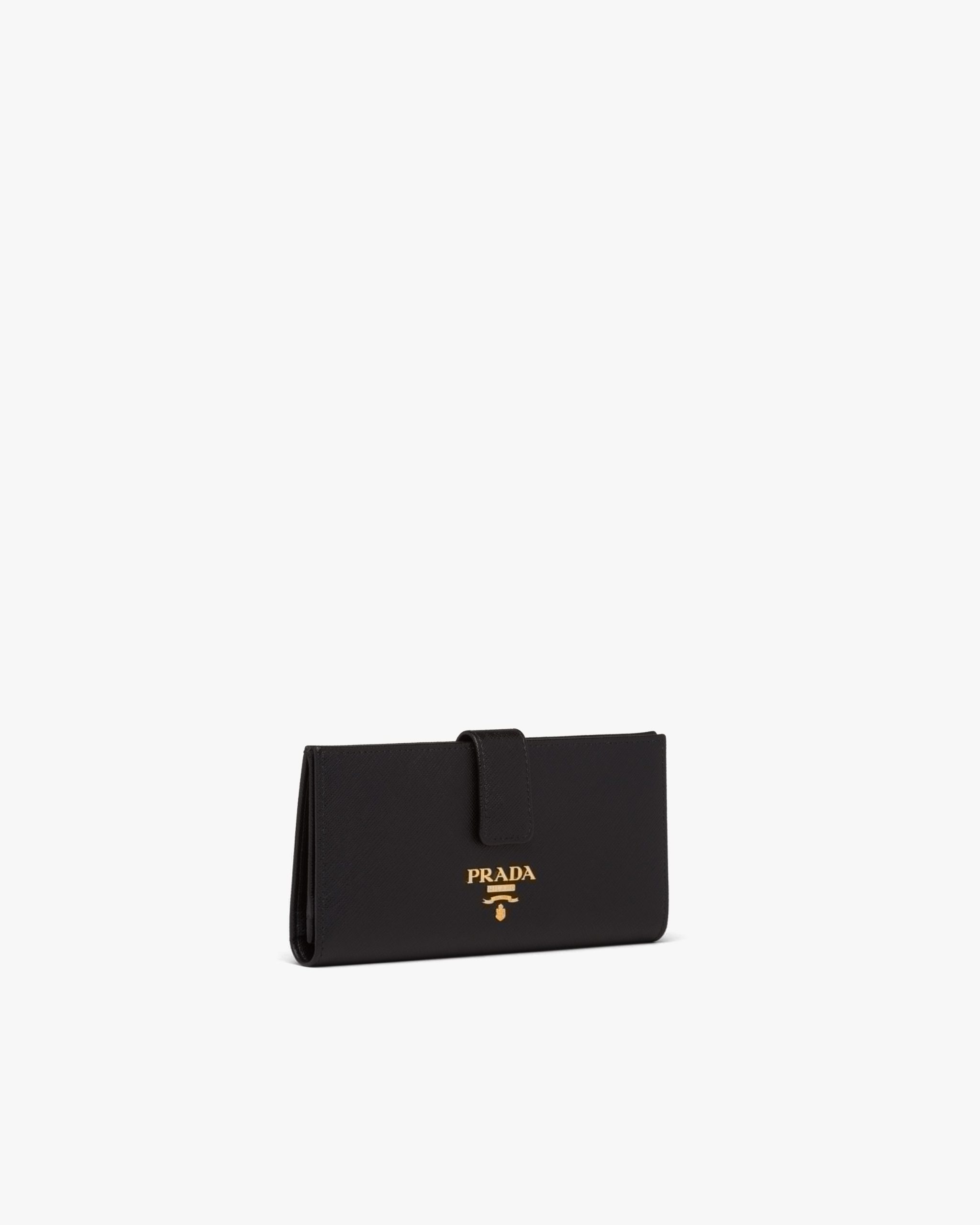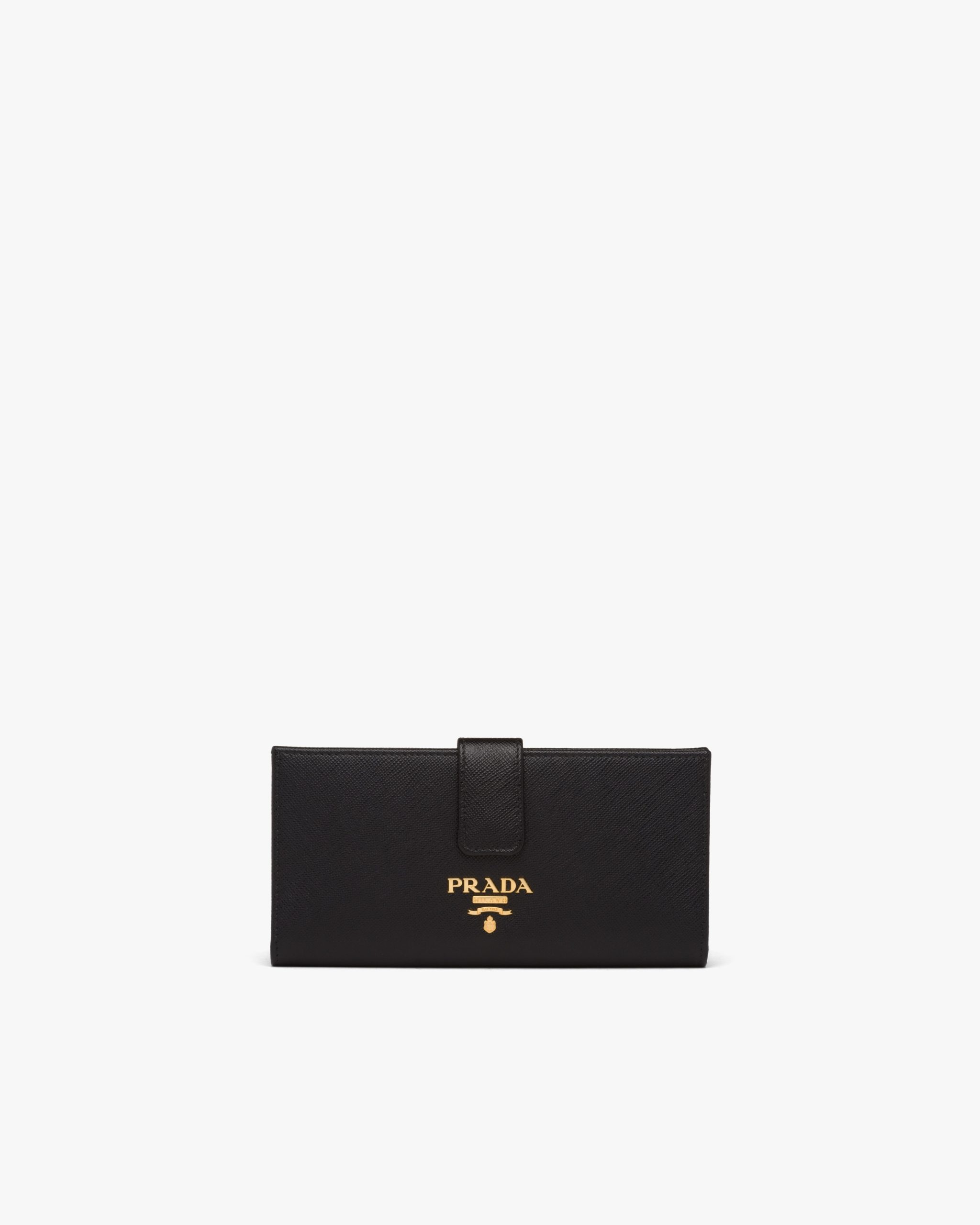 The wallet is made of Saffiano, an iconic Prada material: calf leather of the highest quality, defined by a crosshatch texture and a waxed finish. The lettering logo decorates the accessory.