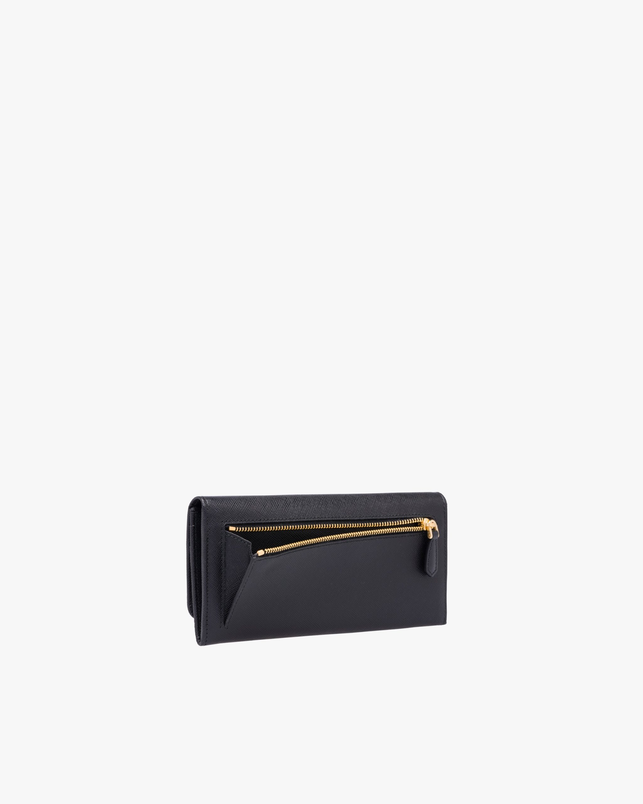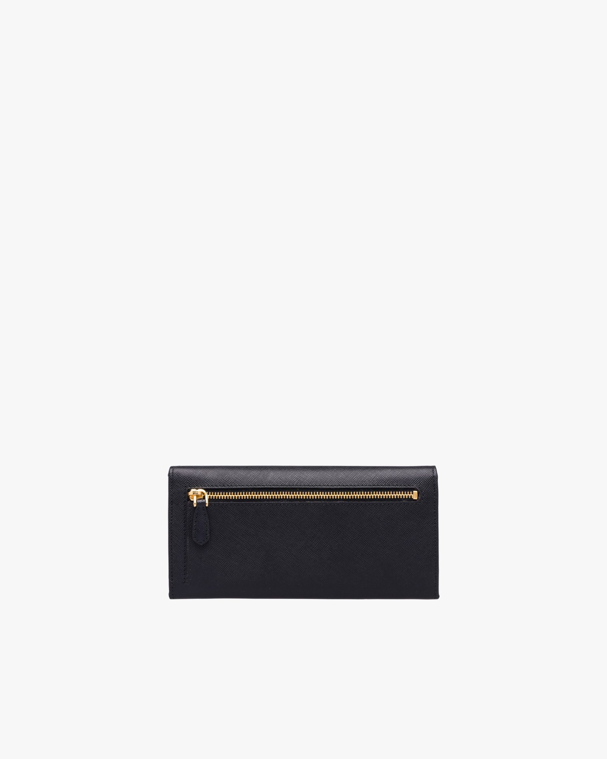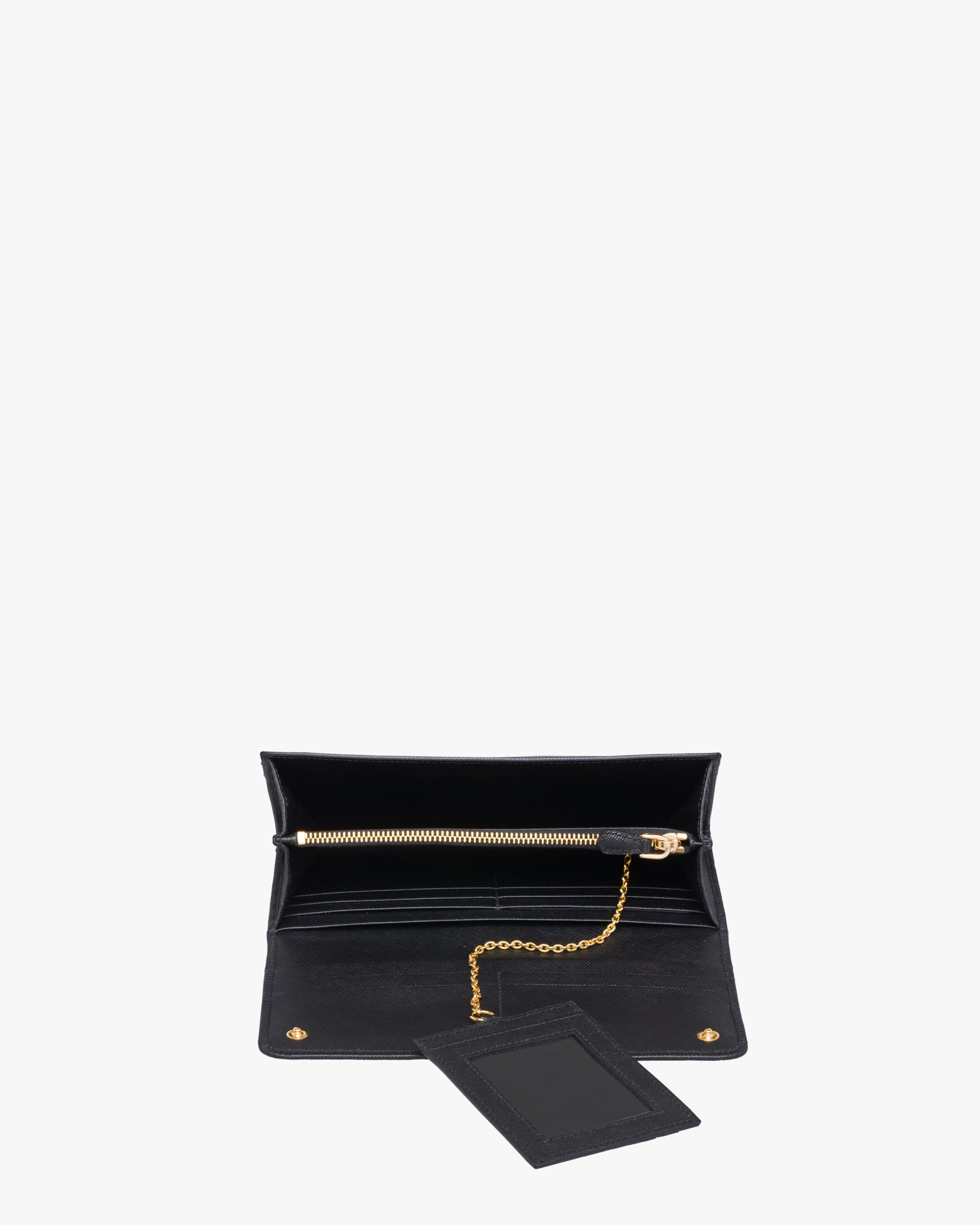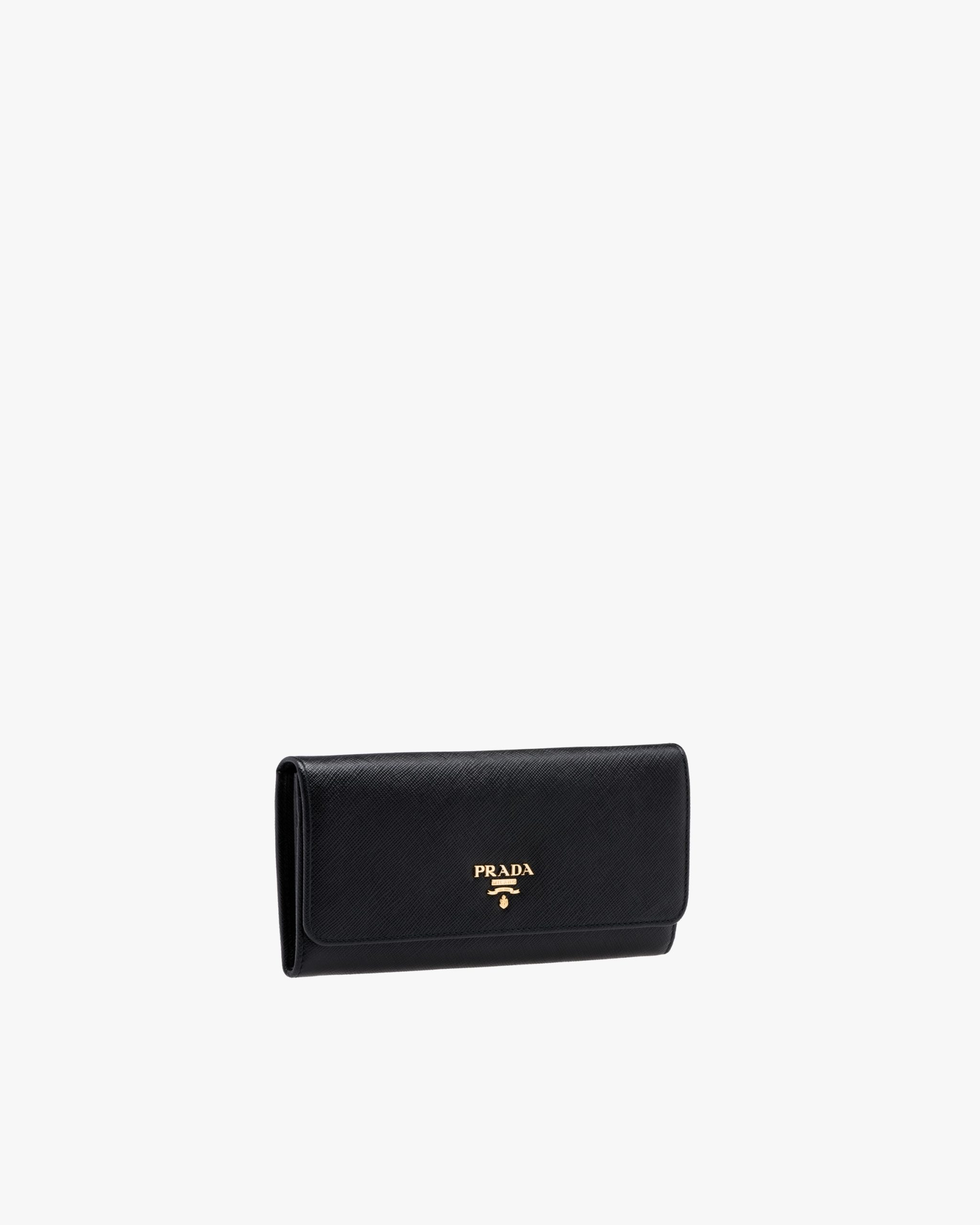 Decorated with Prada lettering, this flap wallet is crafted in Saffiano leather. The double snap closure opens to various compartments, pockets and an extractable badge and credit card holder.