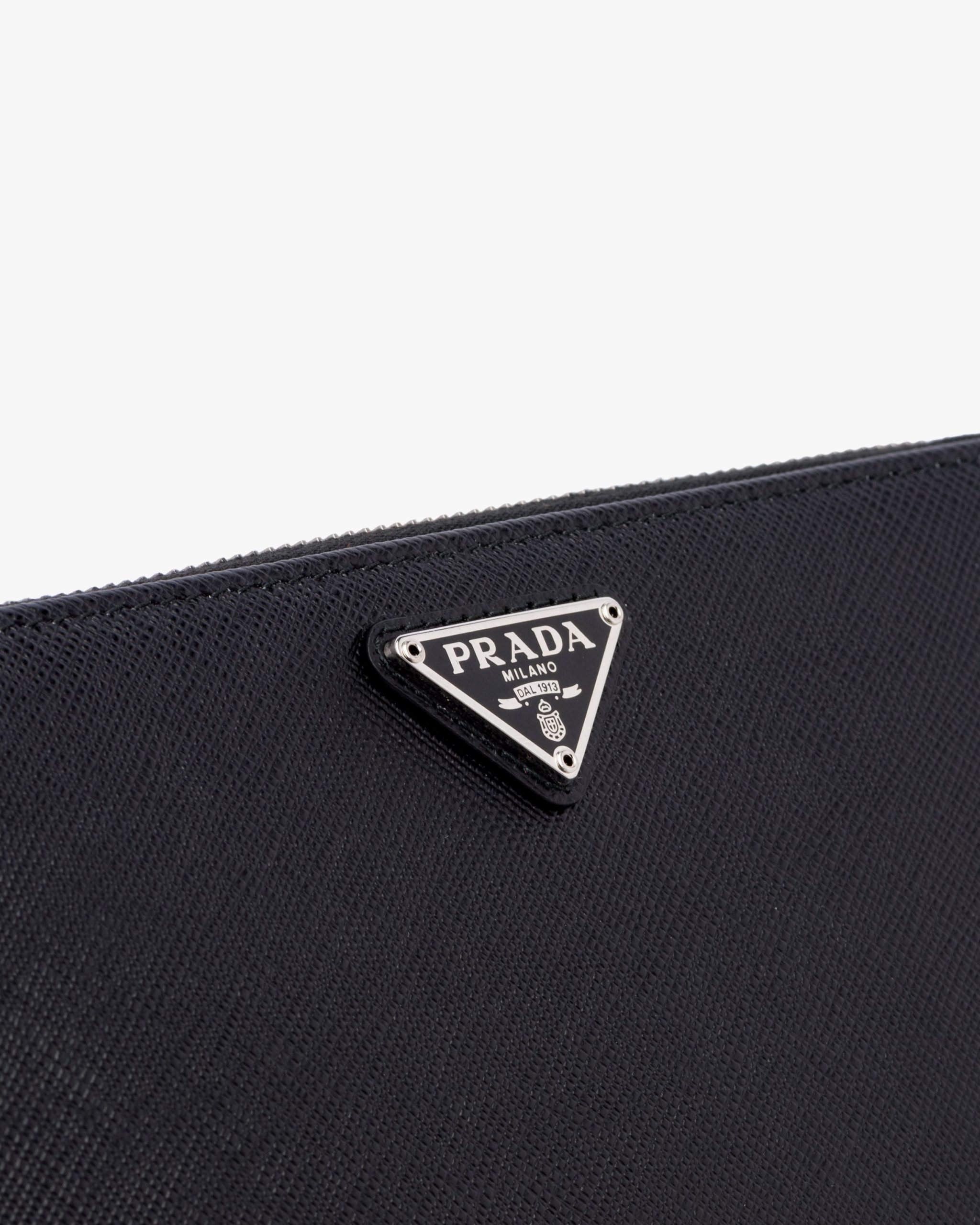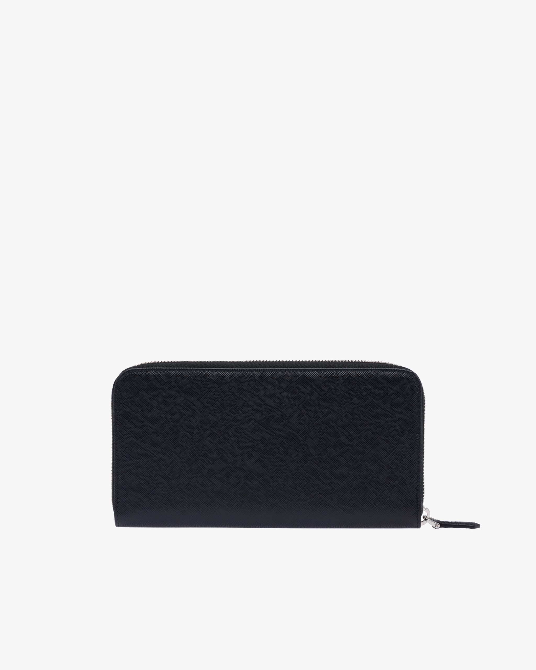 A curved-edged Saffiano leather wallet containing 1 bill compartment with zipper, 12 credit card slots, 6 document pockets and 1 coin compartment with zipper. The piece is finished with the Prada logo and zipper closure.
